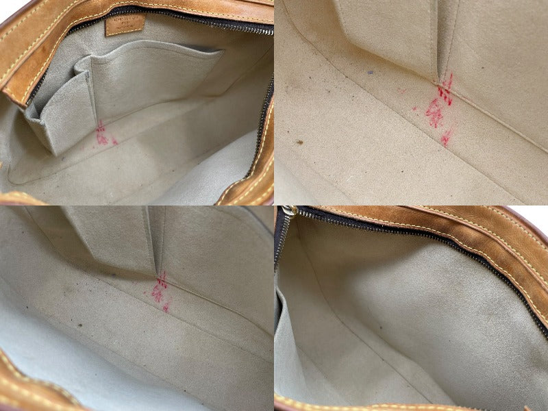 表面のファスナー付近ヌメ革部分劣化あり。表面上部生地ひび割れあり。開口部ショルダー、ヨレあり。金具剥げ、汚れあり。全体的に擦れあり。ファスナー、ショルダー破れあり。内側汚れ、使用感あり。中古品としてご使用頂ける状態です。