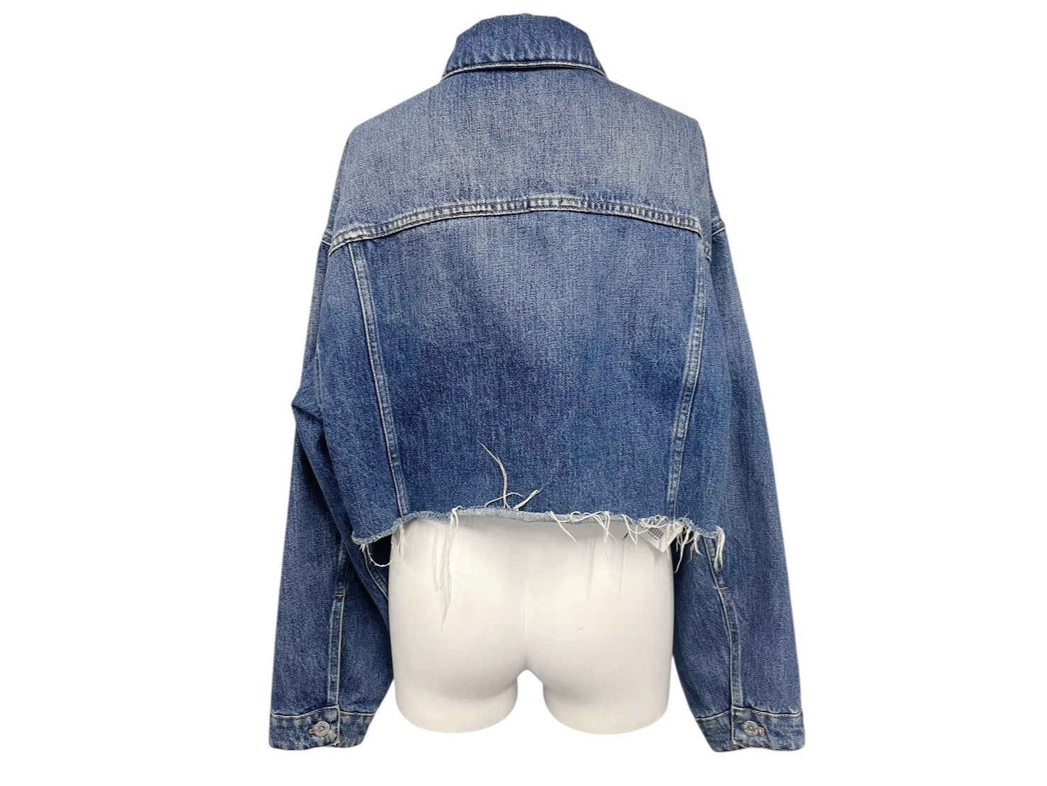 クロップドカットのコンテンポラリーなスタイルに、デニム独特の魅力を融合させたブルゾンジャケット。カットオフの裾が自由で斬新なスタイルを表現し、MIU MIU ロゴがアイコニックなアクセントを添えています。