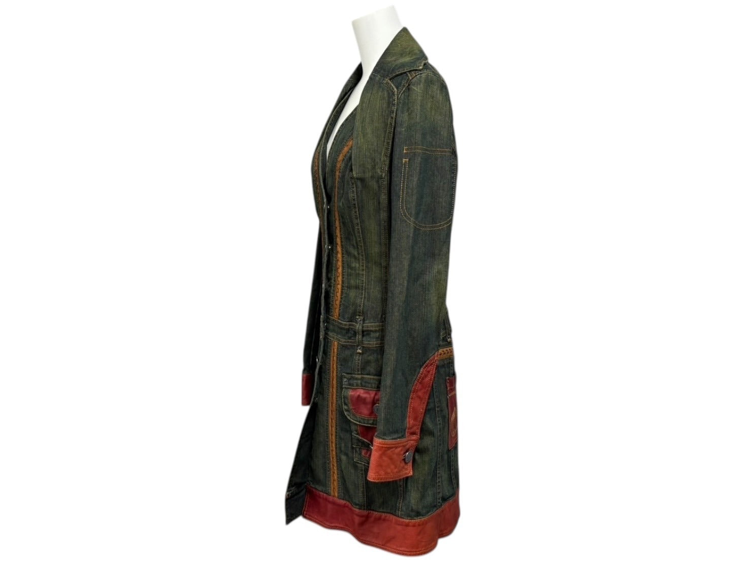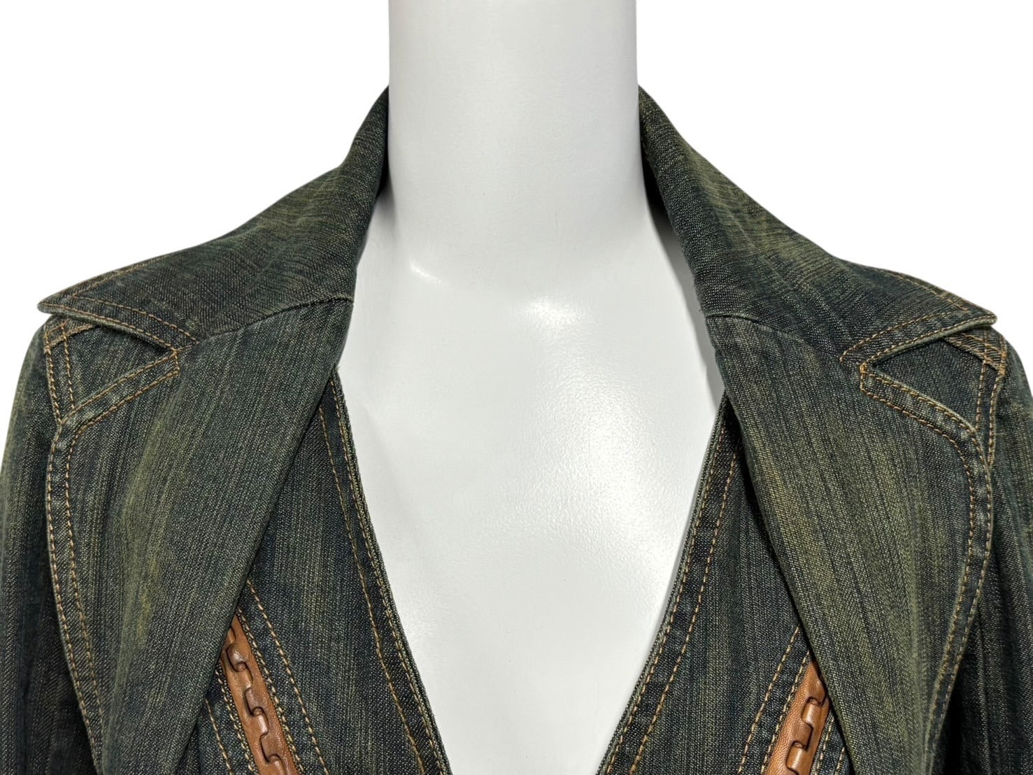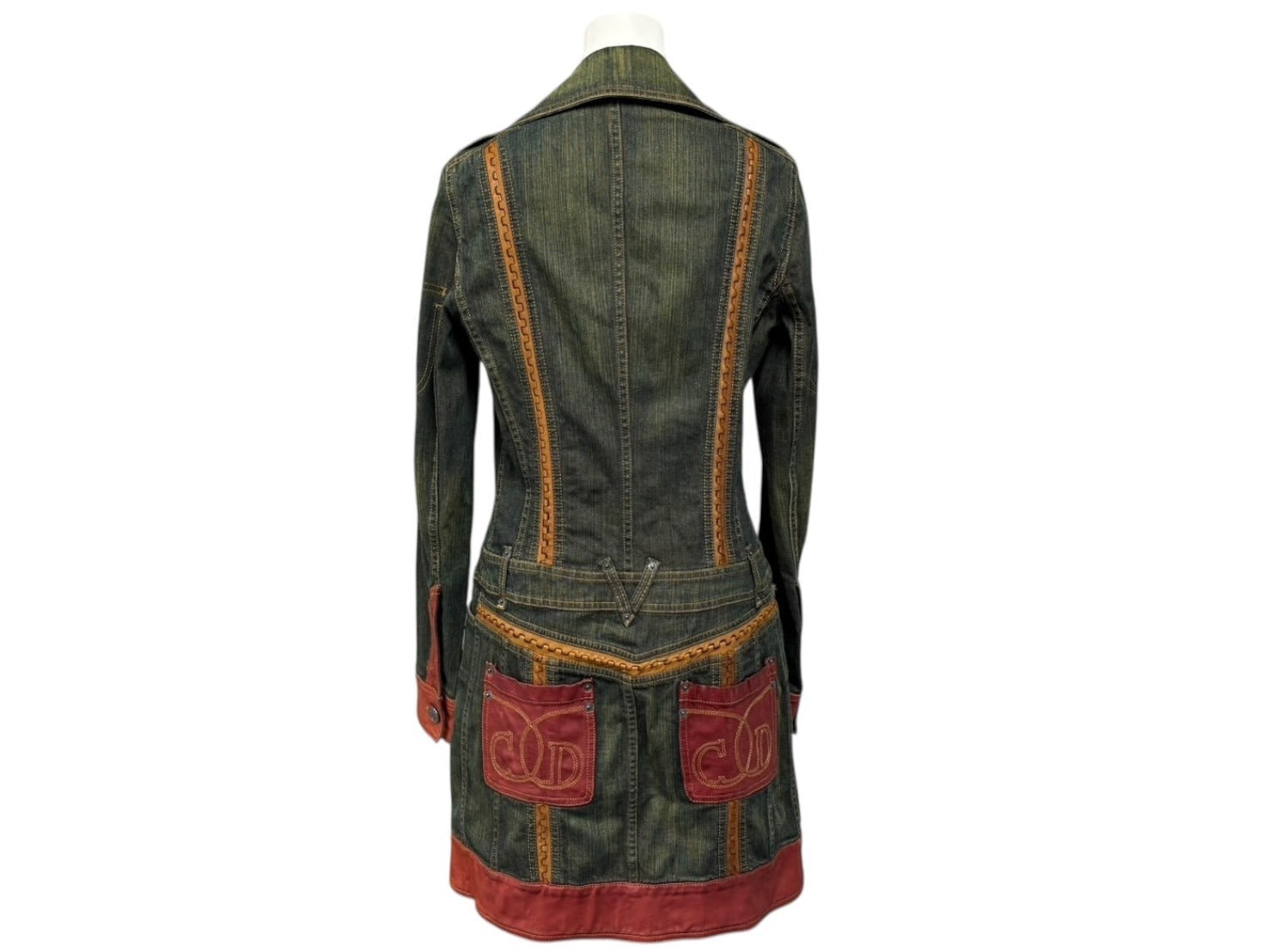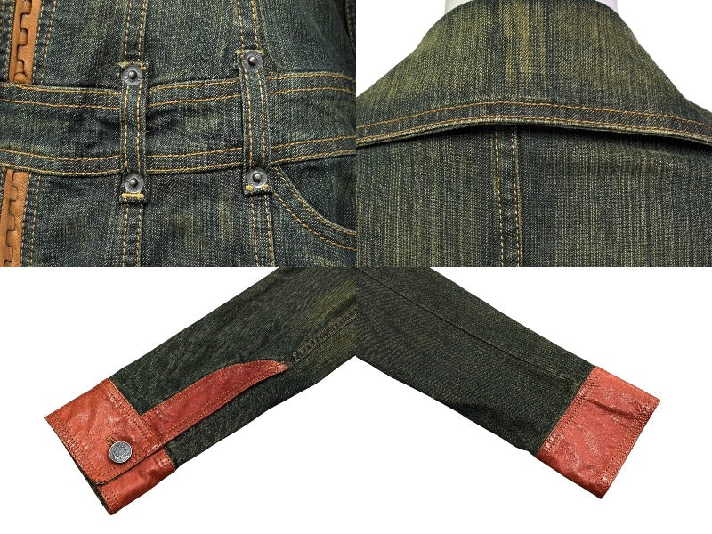 ローデニムにレザーパイピングなどの特徴的なディティールが施された一品です。