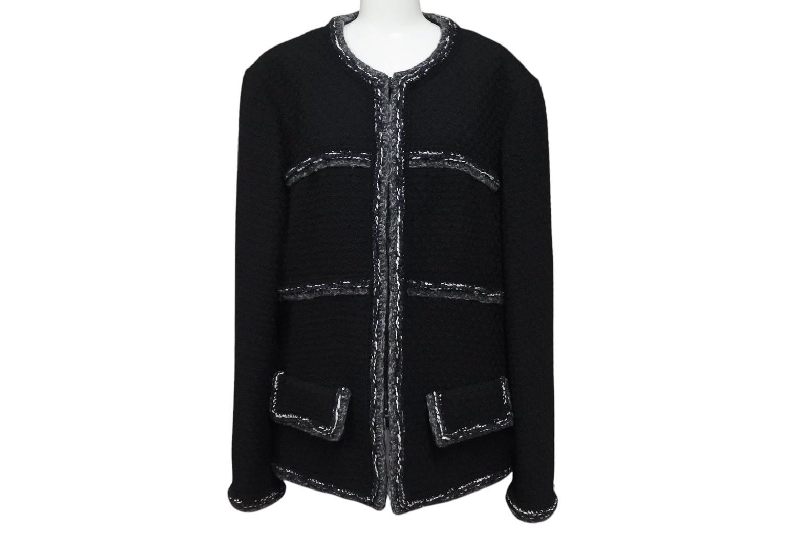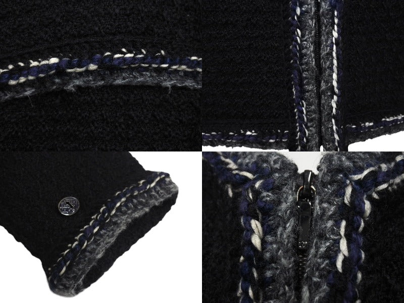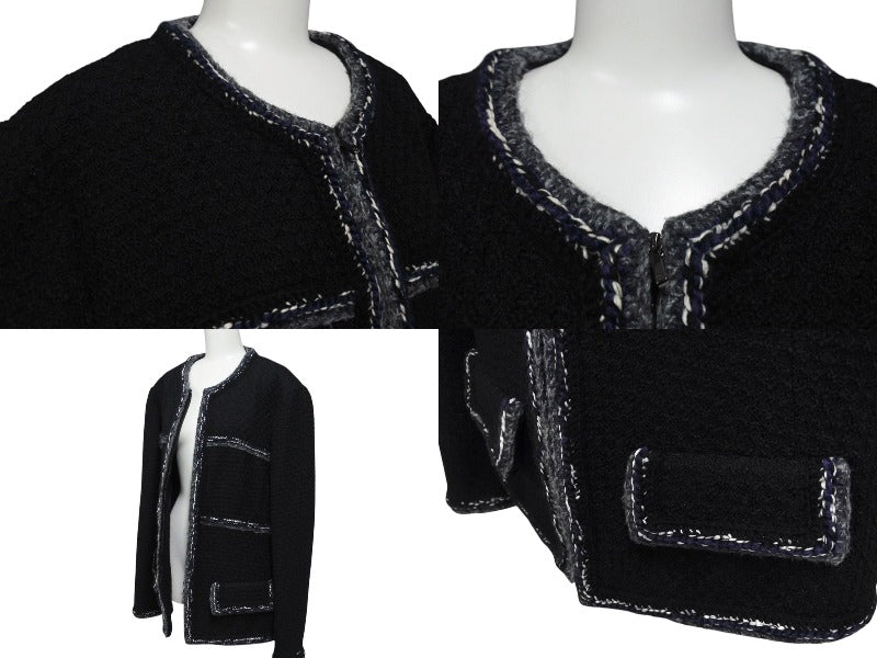 ブラックベースにグレー、ネイビー、ホワイトのツイードを用いたシャネルらしい品と高級感のあるジャケットです。