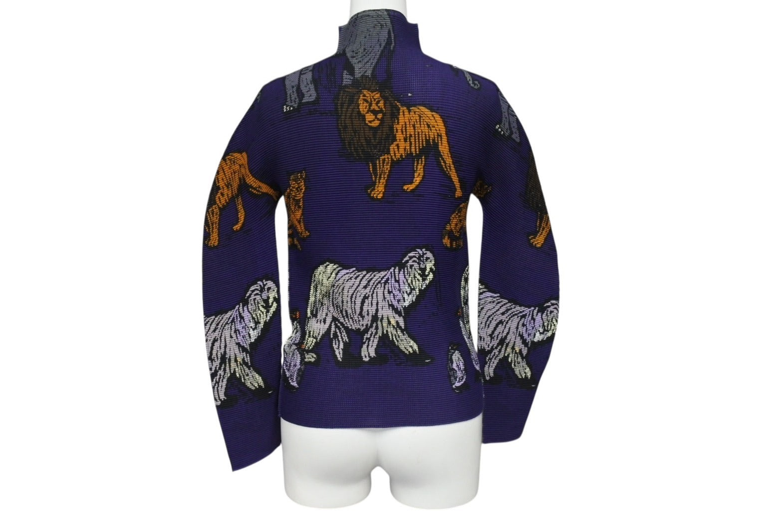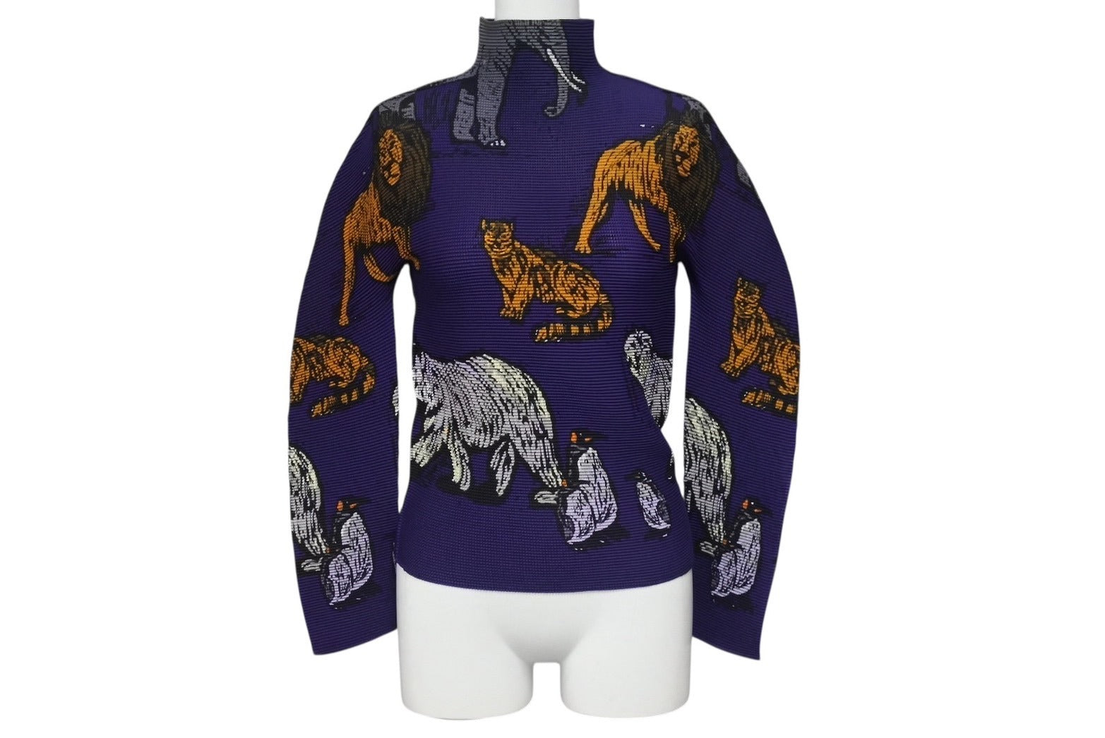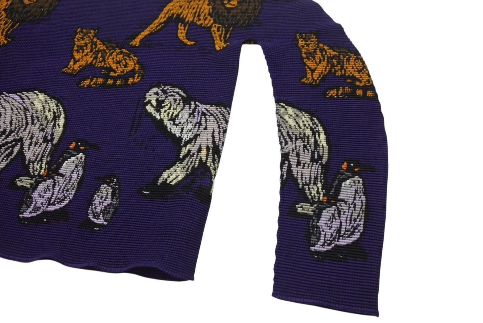 極美品 me ISSEY MIYAKE ミー イッセイミヤケ 長袖トップス MI83FJ611 フリーサイズ プリーツ ハイネック パープル アニマル柄 中古 4b001617