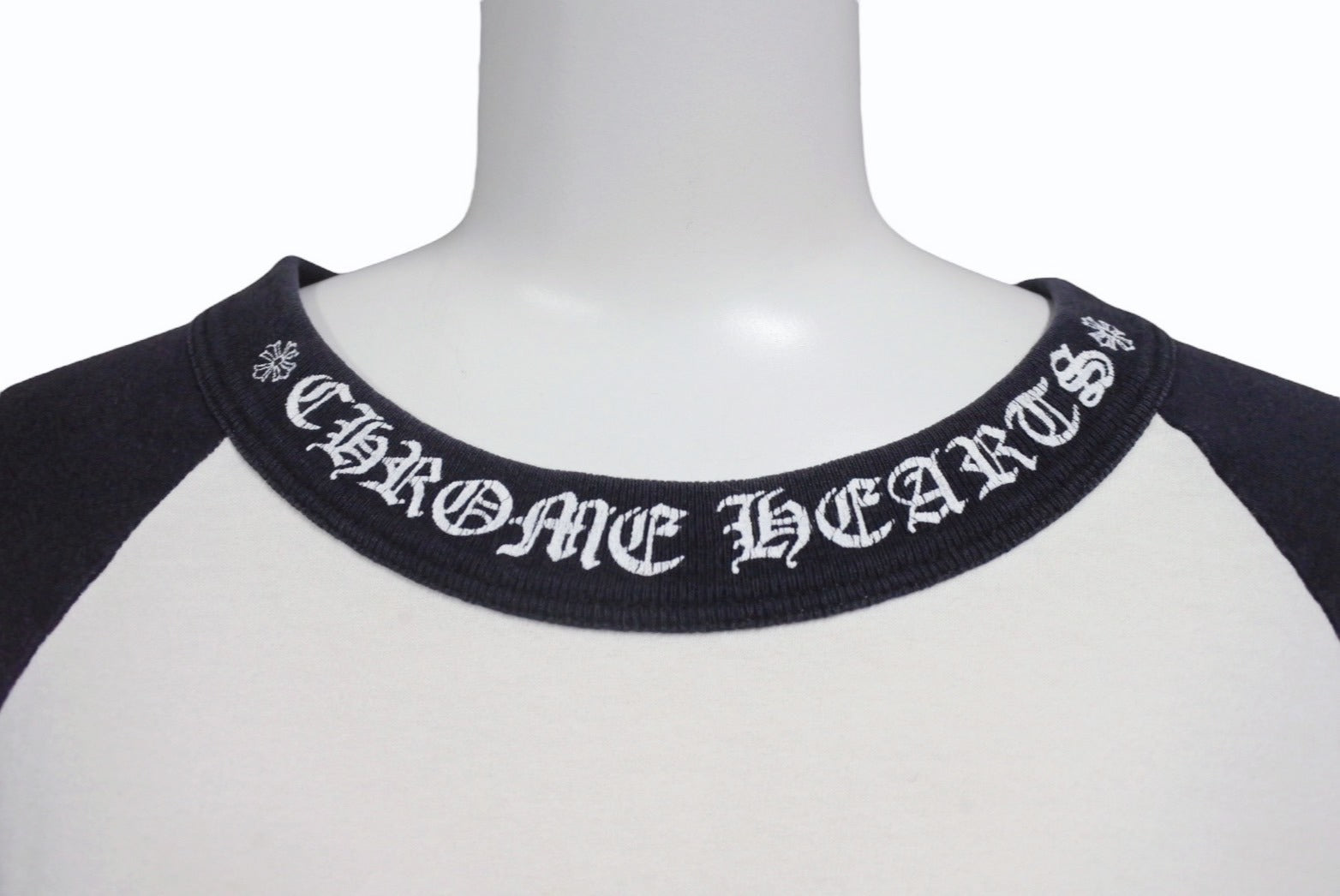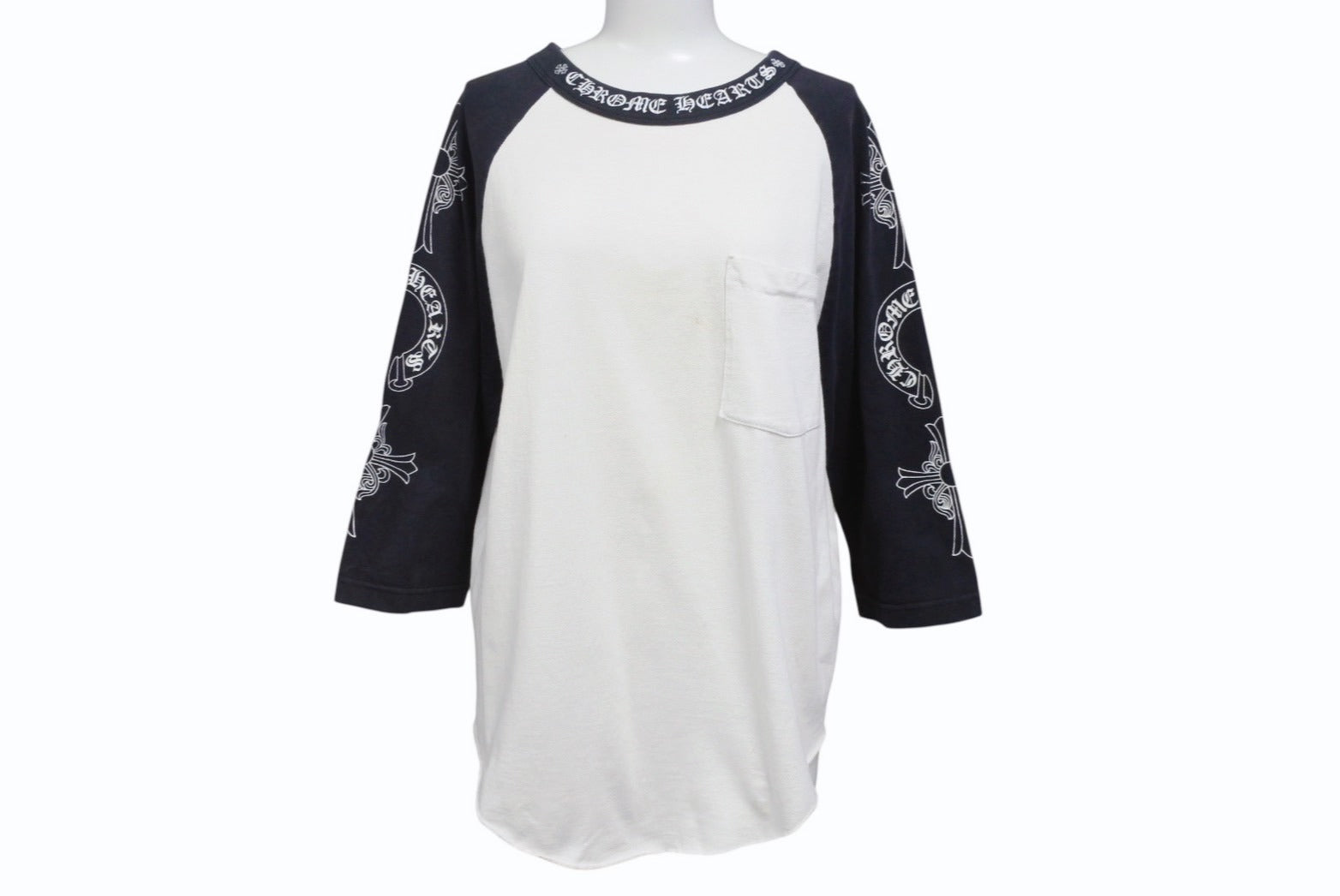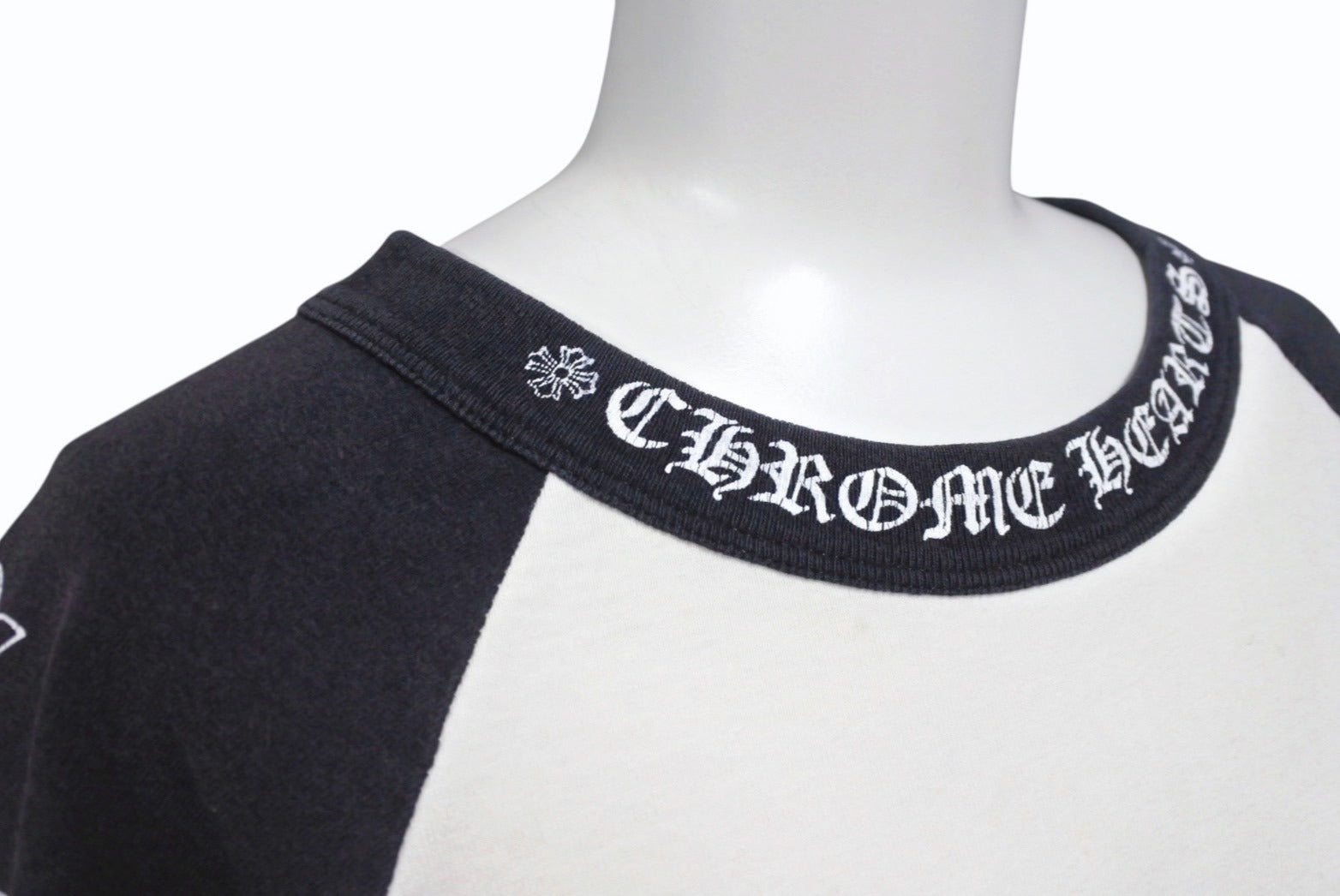 CHROME HEARTS クロムハーツ ラグラン 七分袖Tシャツ サイズM ホワイト ブラック ネックロゴ オールドクロス ホースシュー 良品 中古 4b005660