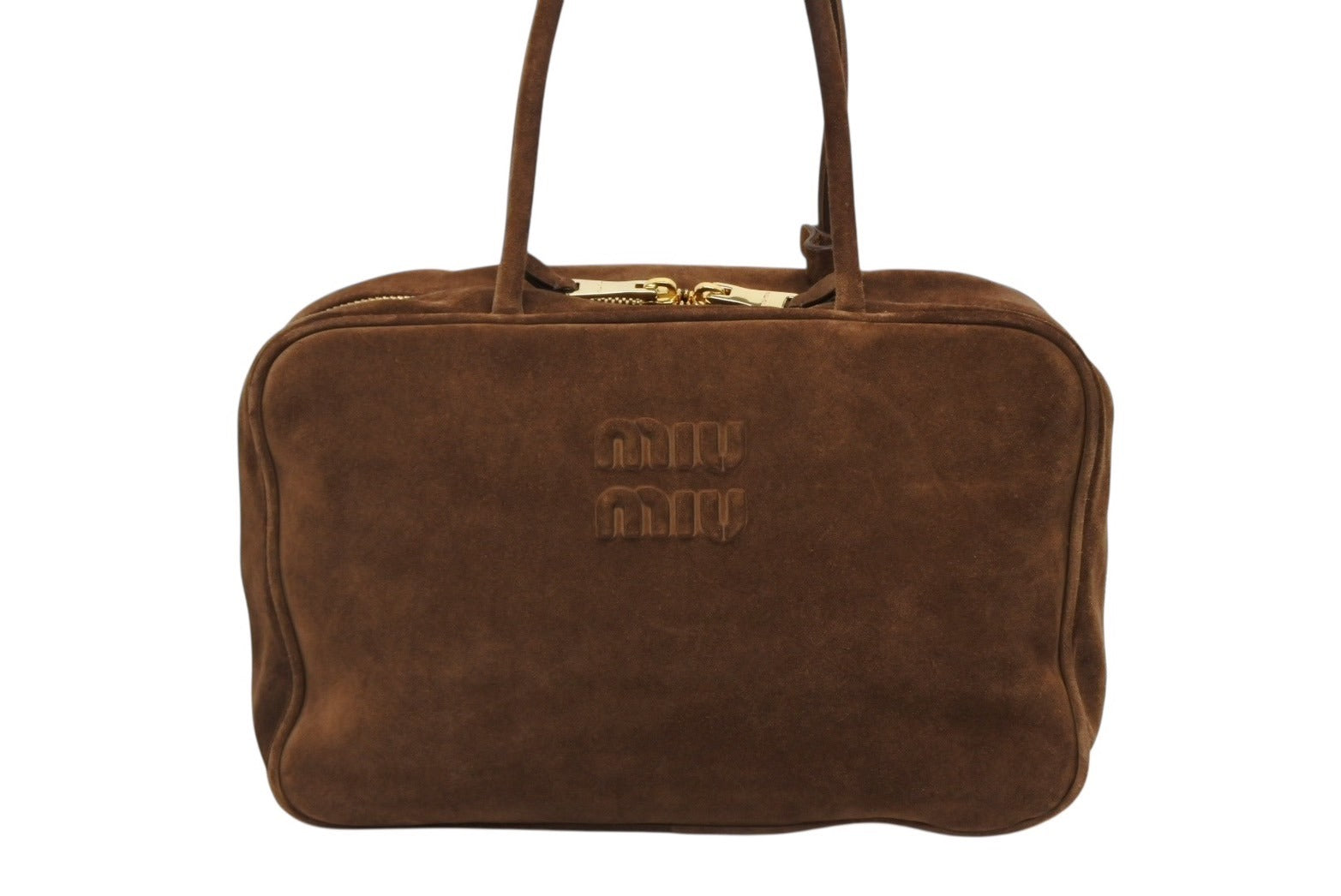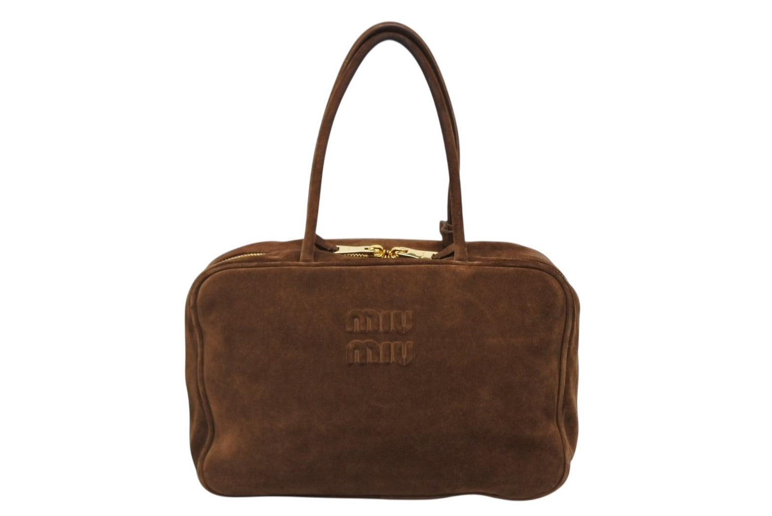 ロングハンドル、柔らかな手触り、ベルベットのような風合いのスエードで仕上げ、コスモポリタンな個性をプラスしたボー バッグ。アイコニックなアクセントを添えるMIU MIU ロゴがデザインを引き立てます。