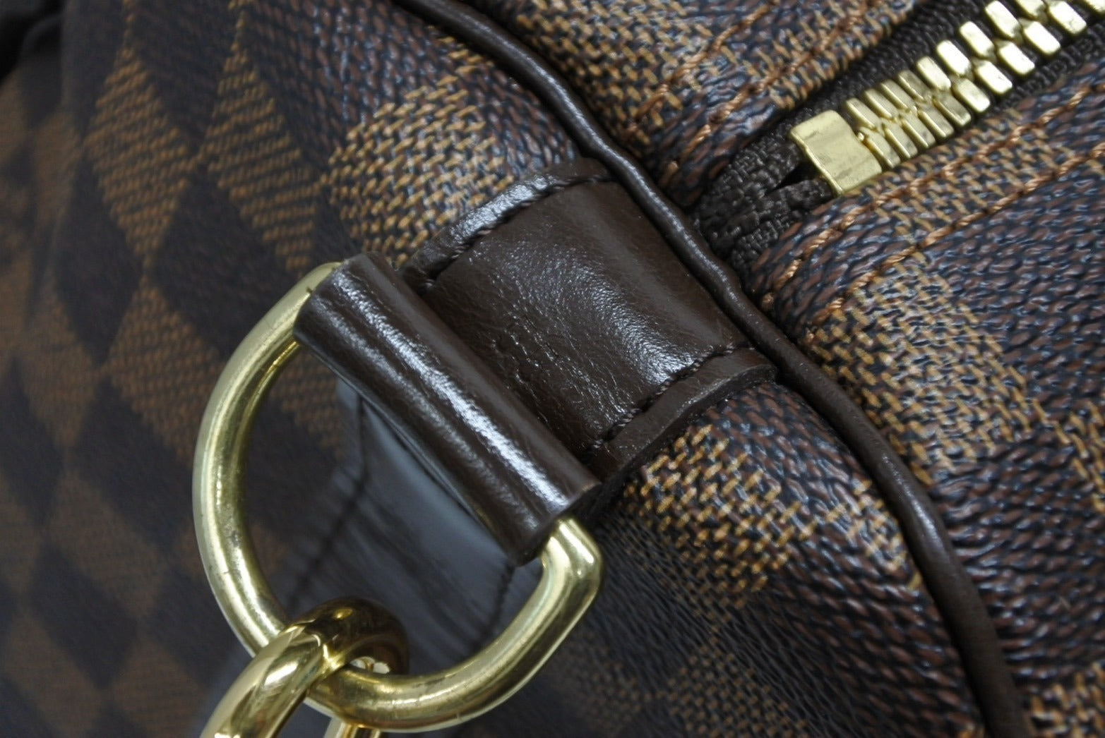 落ち着いた優美さと幾何学的なモチーフが魅力的なダミエラインの、肩に掛けて快適に持ち運べるレザーストラップ付きボストンバッグ。