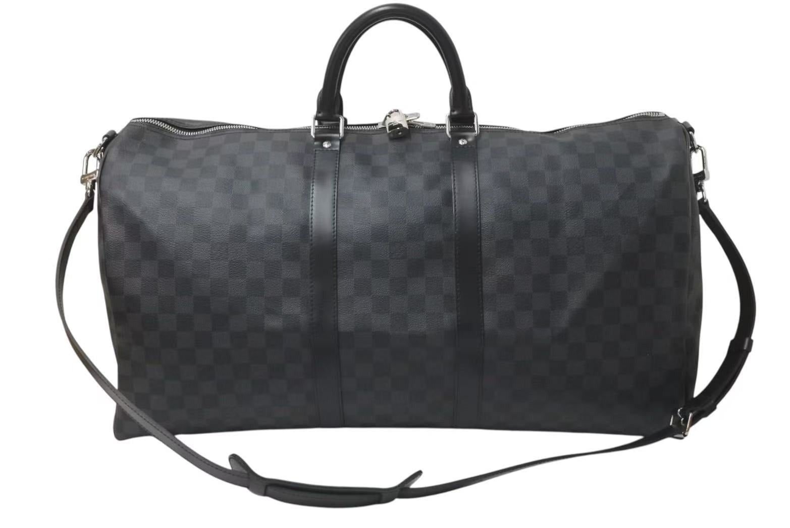 シンプルで都会的なデザインが魅力の「ダミエ・グラフィット」のソフトタイプのトラベルバッグ。肩に掛けて快適に持ち運べるレザーストラップ付き。長期旅行でも安心のサイズ。