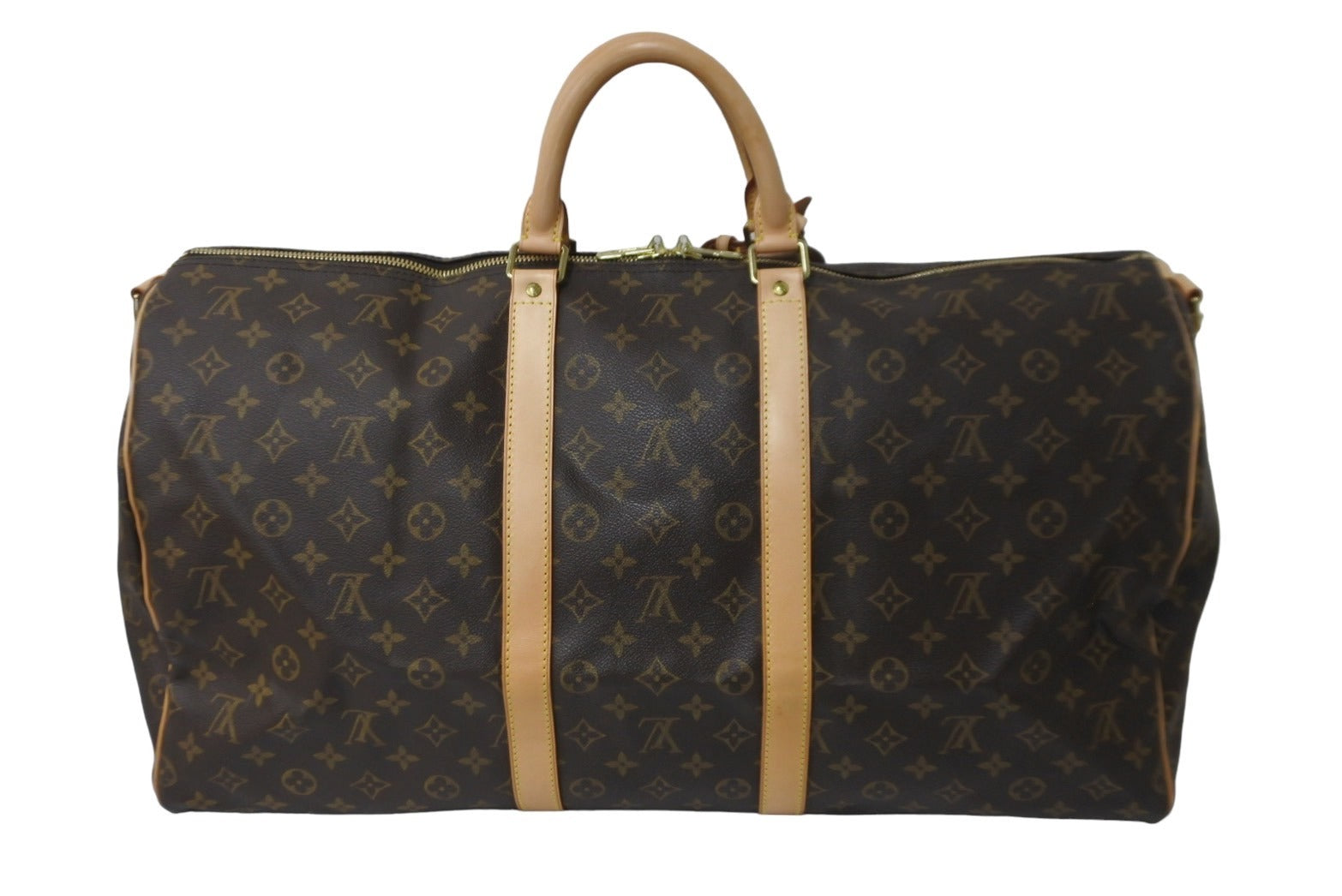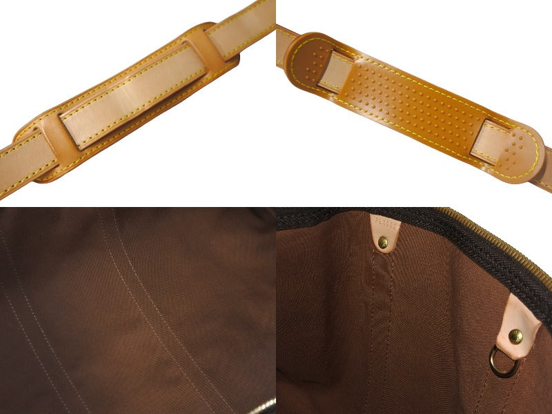 ルイ・ヴィトン定番の旅行用バッグ「キーポル・バンドリエール 55」。肩に掛けて快適に持ち運べるレザーストラップ付きです。