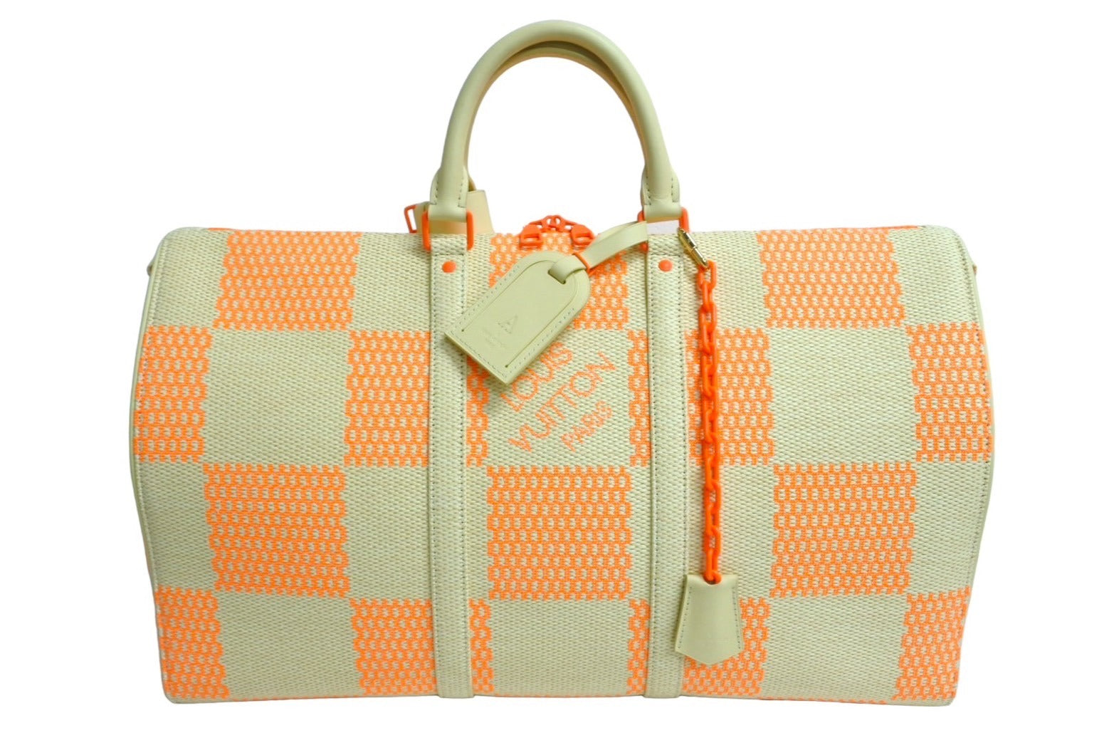 ラフィア(ヤシ)を織り込んで、ダミエ ジャイアント パターンを描き出しました。市松模様にあしらった「Louis Vuitton Paris」のシグネチャーが、ベージュとオレンジのモチーフを引き立てます。「キーポル」は1930年代に誕生したルイヴィトンの独創的なソフトトラベルバッグです。