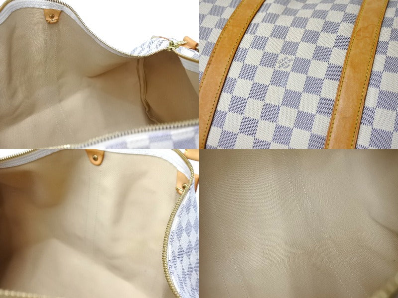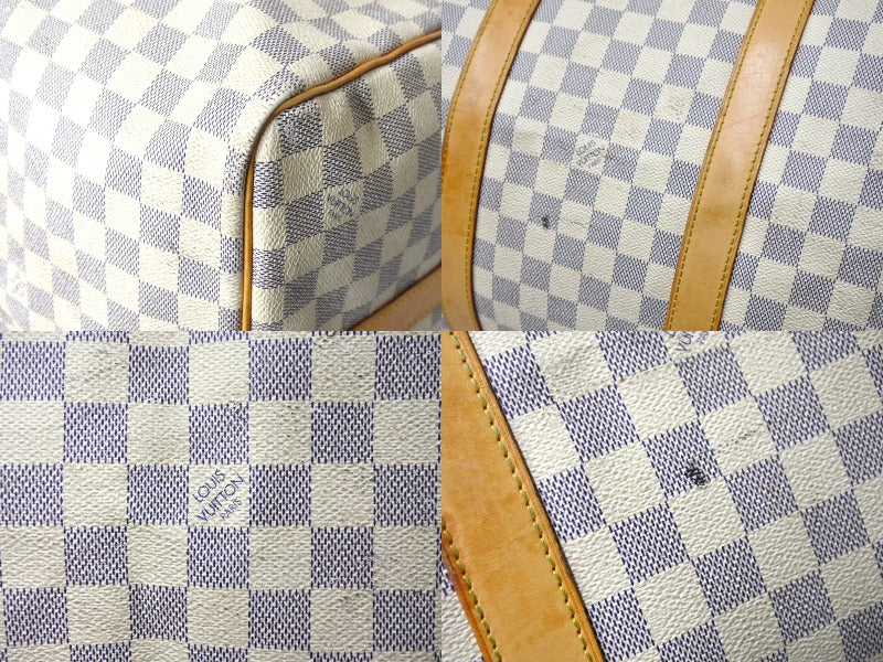 イタリアのリゾート地リビエラの海と砂をイメージして作られたダミエアズールの、肩に掛けて快適に持ち運べるレザーストラップ付きボストンバッグ。