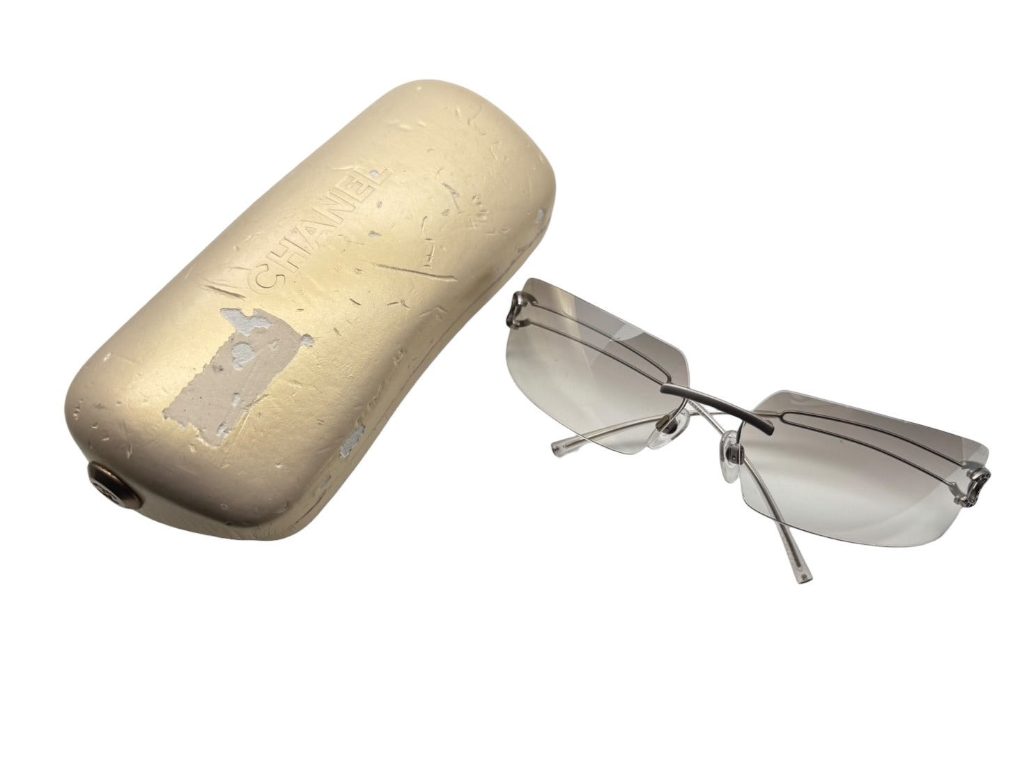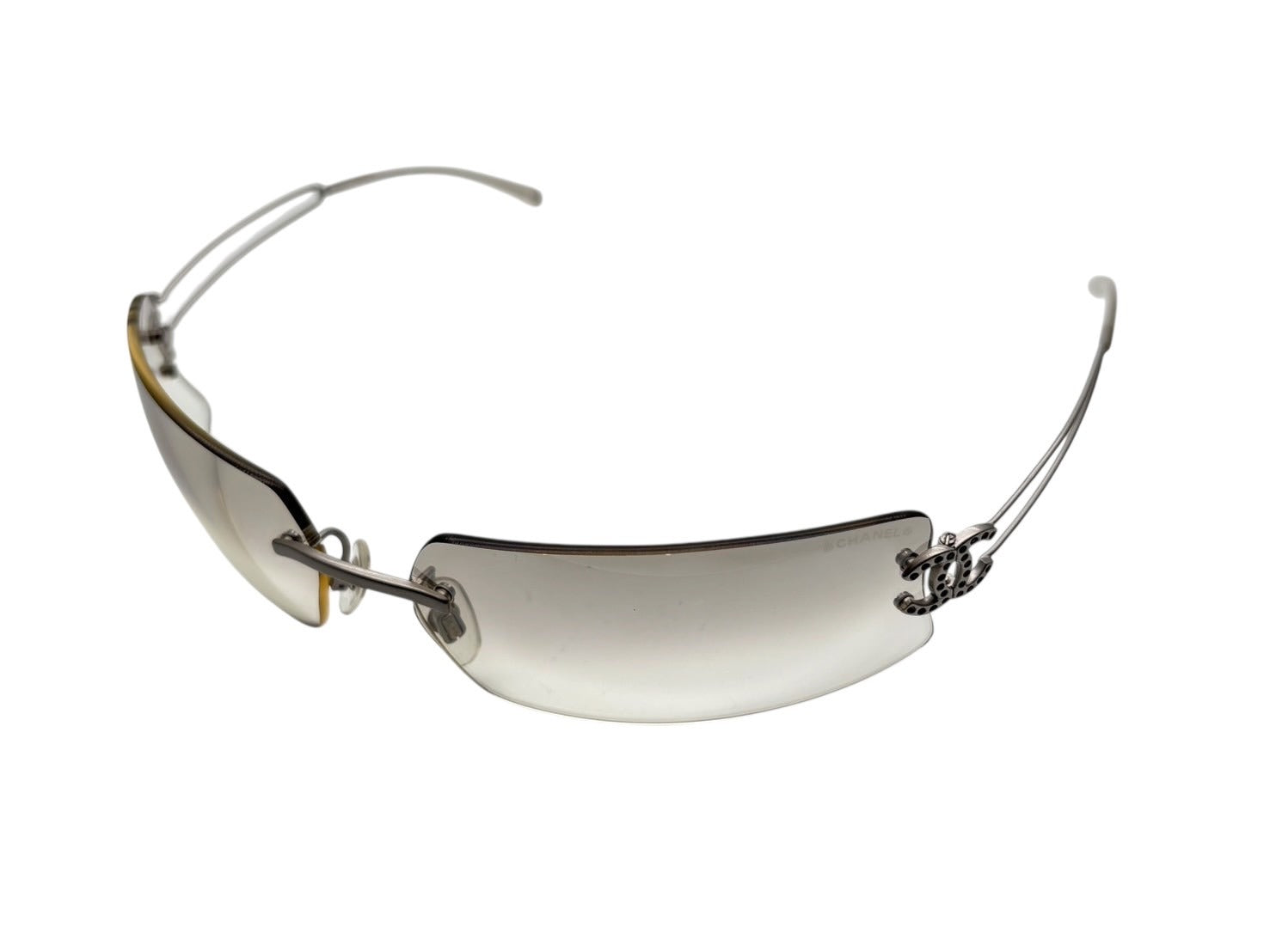 極美品 CHANEL シャネル リムレス サングラス 4051-B c.193/6I サイズ74□12 120 ココマーク ラインストーン クリア シルバー 中古 4b009482