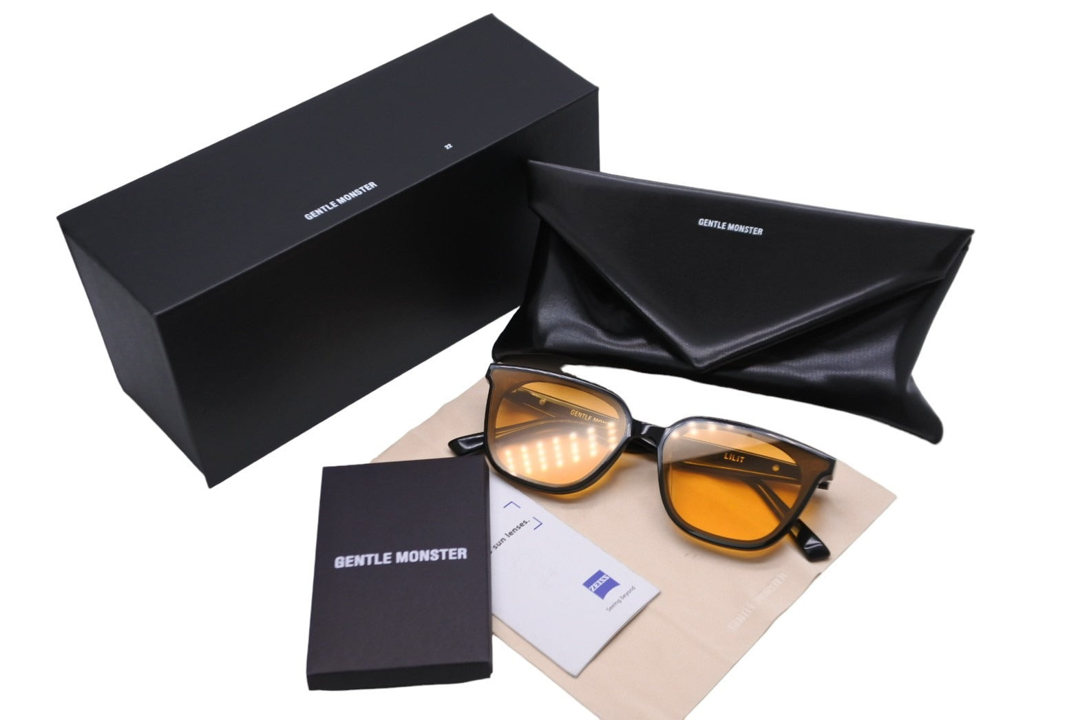 レンズ部分の両端に2つの丸釘とテンプルのGentle Monsterレターロゴが加わり、ブランドのアイデンティティを強調しています。