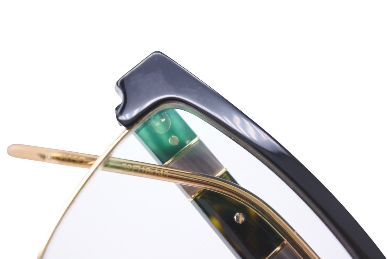 遊び心のあるマテリアルミックスが特徴で、つやのあるブラックアセテートのフレームに、ゴールドトーンのブリッジがコントラストを効かせています。