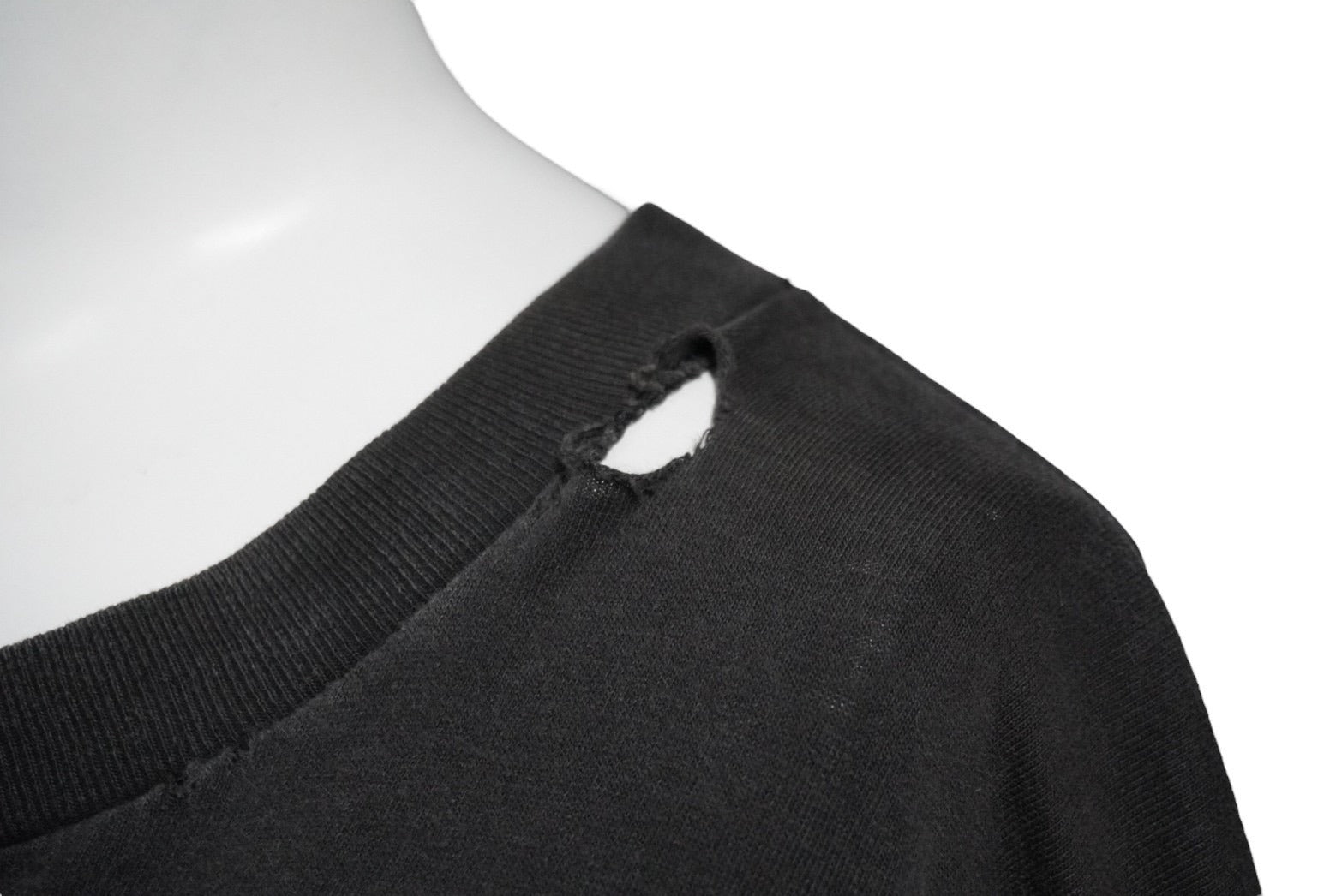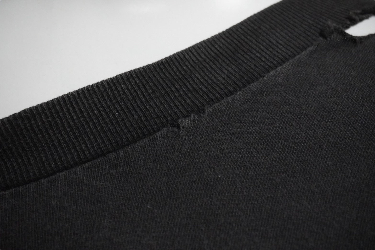 首元穴開きとほつれあり。表面上部右側穴開きあり。表面プリントした穴開きあり。裏面プリントヒビあり。全体的に毛羽立ちあり。裾部分ほつれあり。