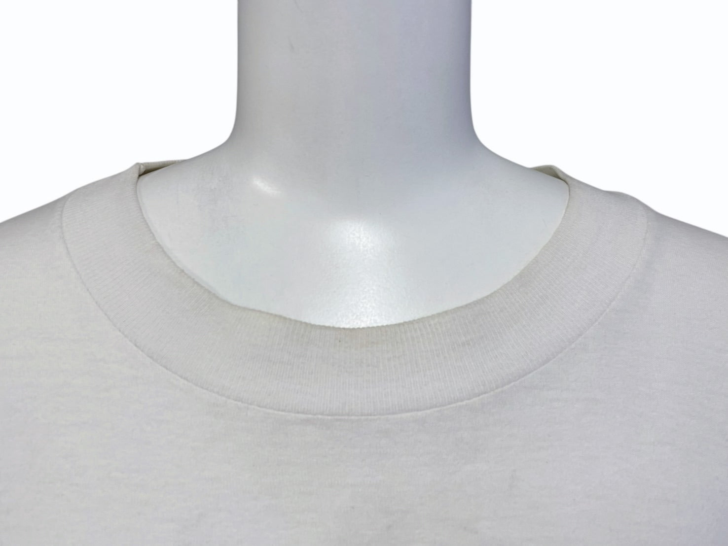 首元、脇に黄ばみあり。全体的にうっすら黄ばみあり。両脇部分に破れあり。表面下部付近にシミ、一部ピンホールあり。プリントにフェードあり。肩付近汚れあり。中古品としてご使用いただける状態です。