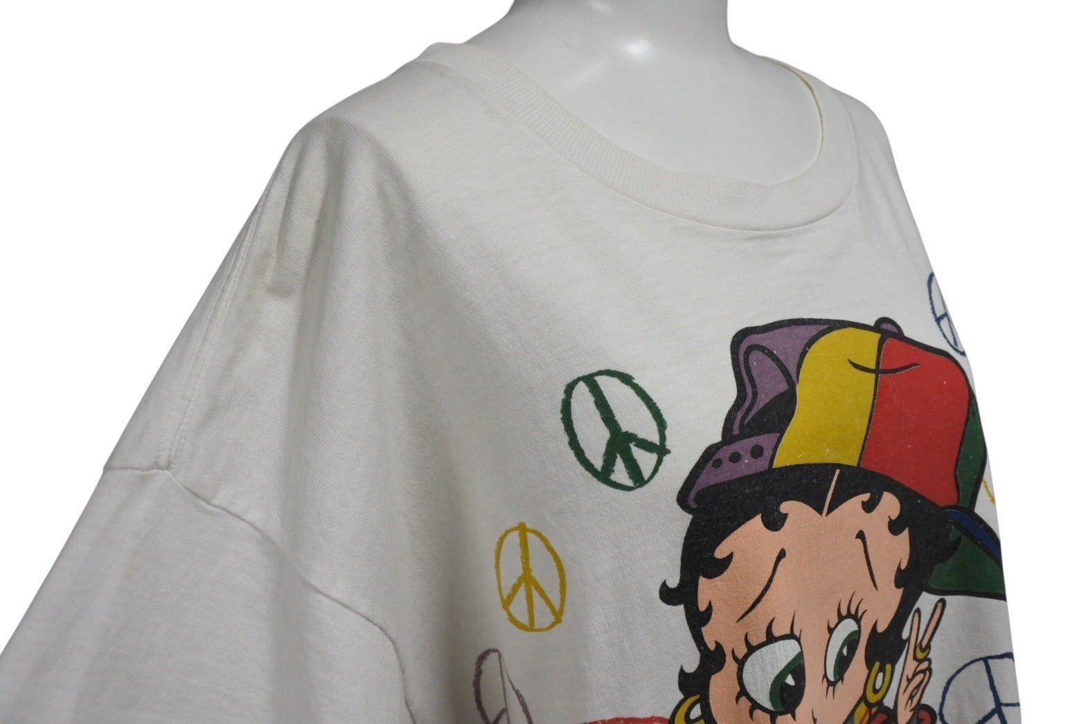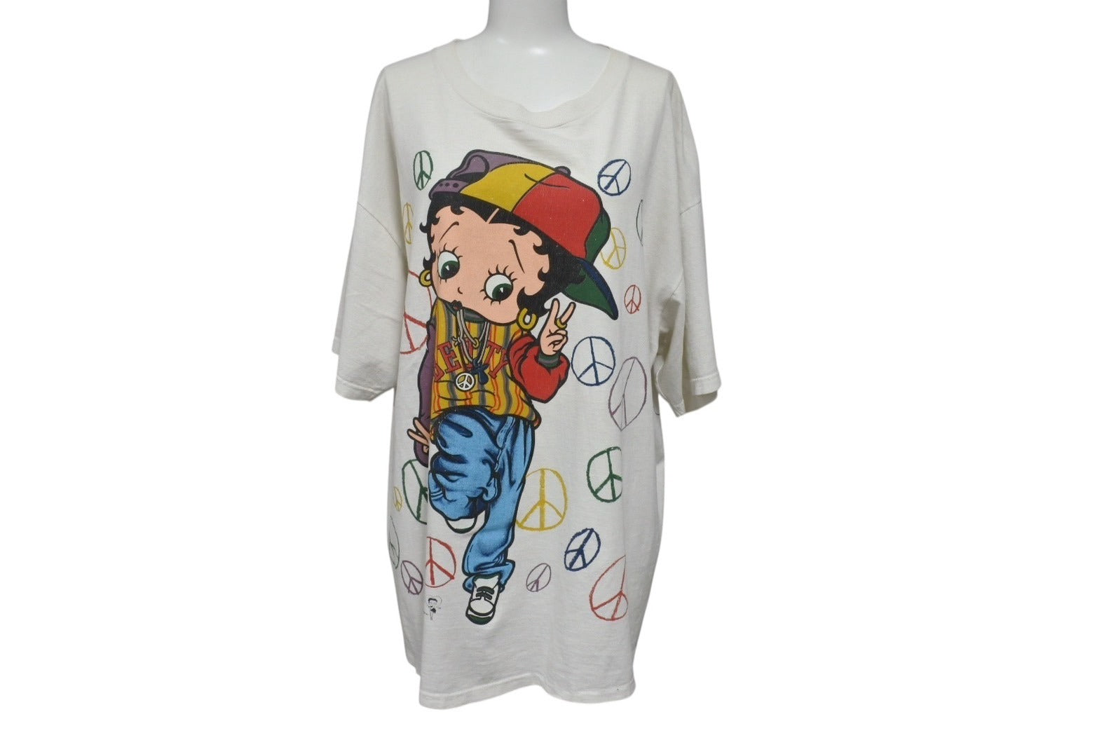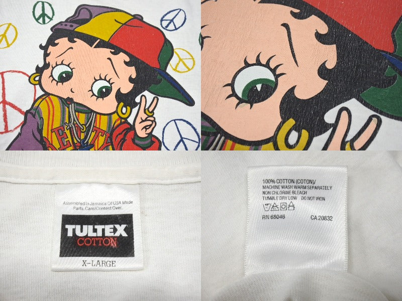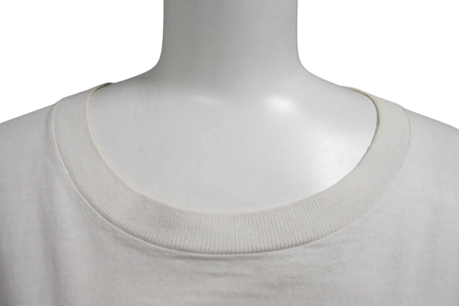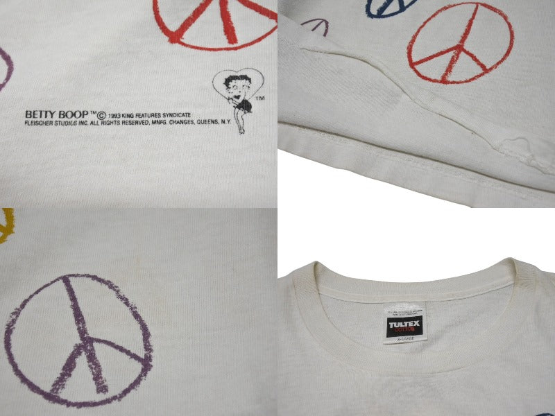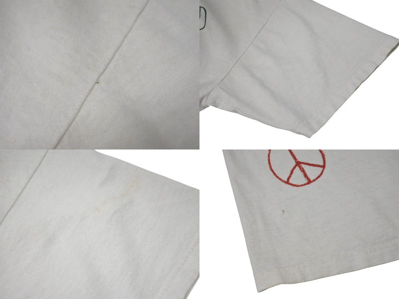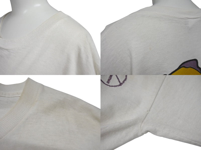 首元、肩付近に黄ばみ、全体的に薄っすら黄ばみあり。表面シミあり。脇付近、裾付近にピンホールあり。プリントにかすれ、ひび割れ、シミあり。袖にシミ、汚れあり。裾ステッチにほつれあり。中古品としてご使用いただける状態です。