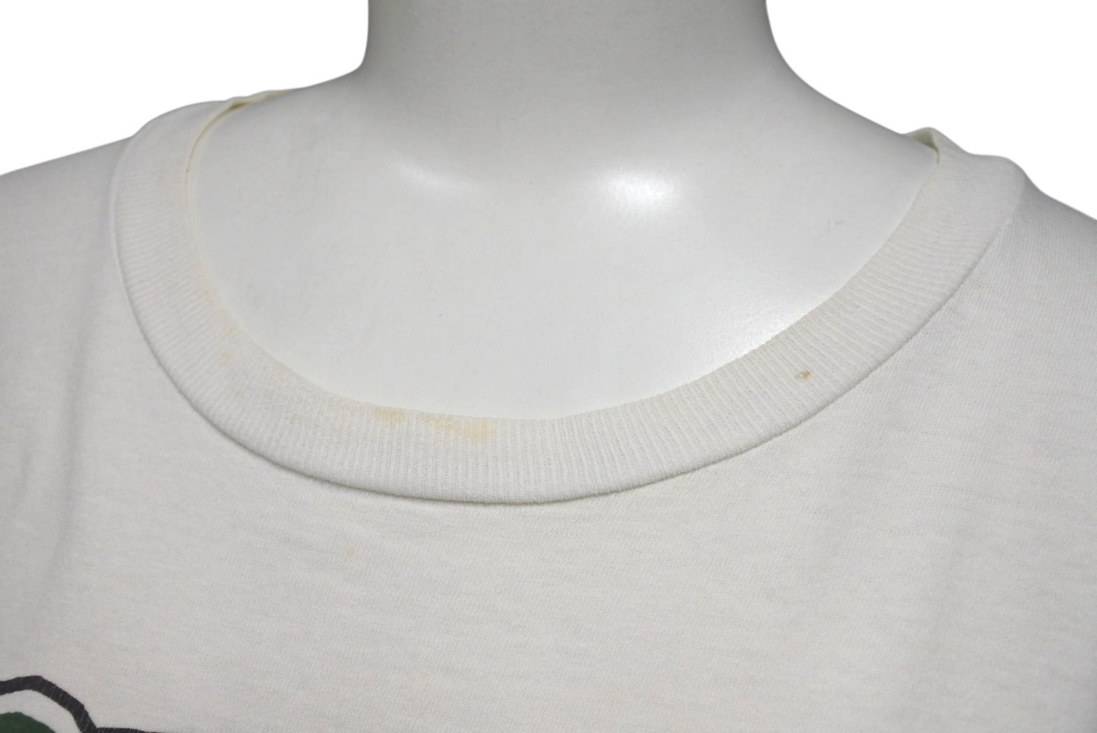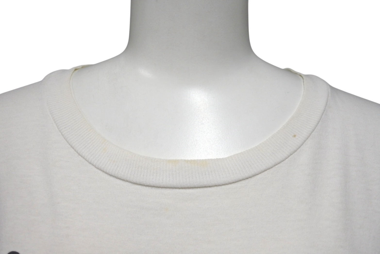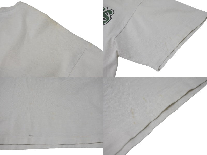 首リブ、背面下部、前面下部にピンホールあり。全体的にうっすら黄ばみあり。首元、肩、袖、前面、背面にしみ、黄ばみあり。プリントにひび割れ、フェードあり。中古品としてご使用いただける状態です。