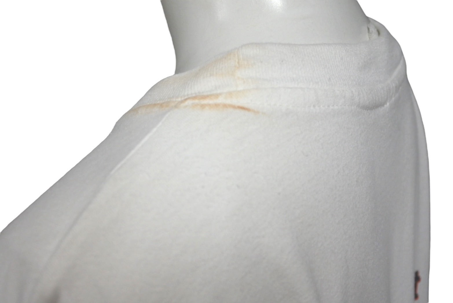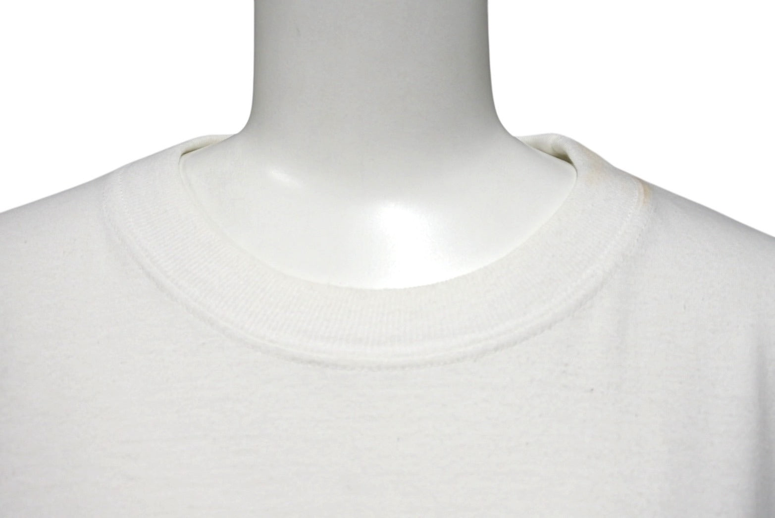 首元汚れあり。全体的に少々黄ばみあり。袖に少々汚れあり。背面下部に汚れ、シミあり。プリントにフェードあり。毛羽立ち、少々の毛玉あり。その他使用感の少ない状態です。