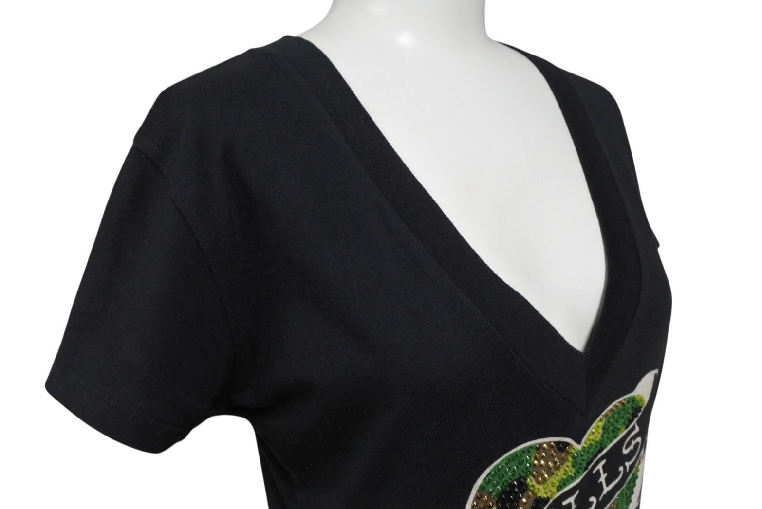 首元少々色褪せあり。毛羽立ちあり。ラインストーン付近にプリント割れあり。その他使用感の少ない状態です。