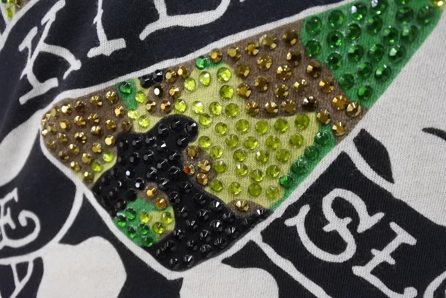 ラインストーンのあしらわれたグラフィックが目を惹く半袖Tシャツです。