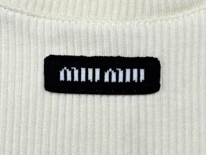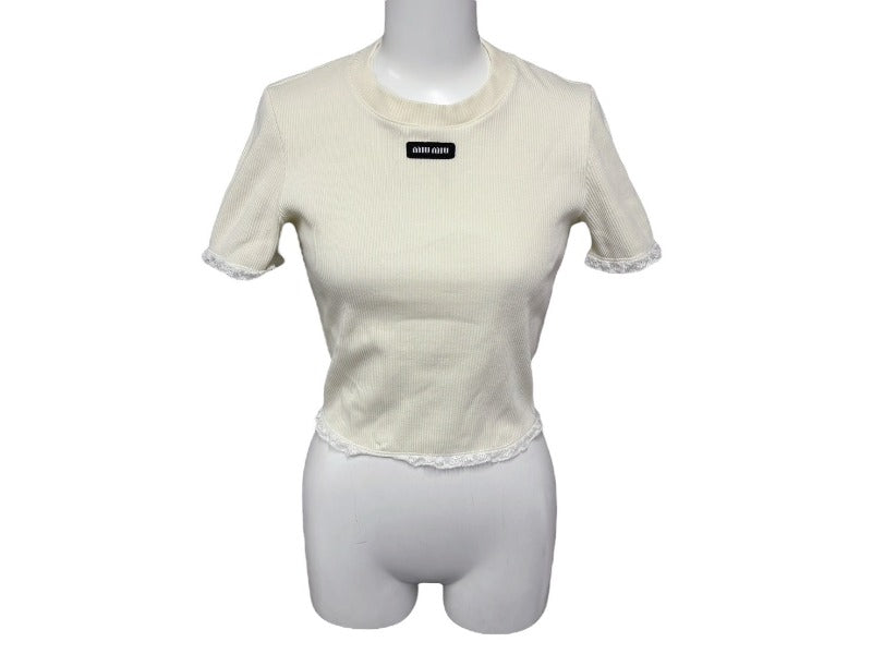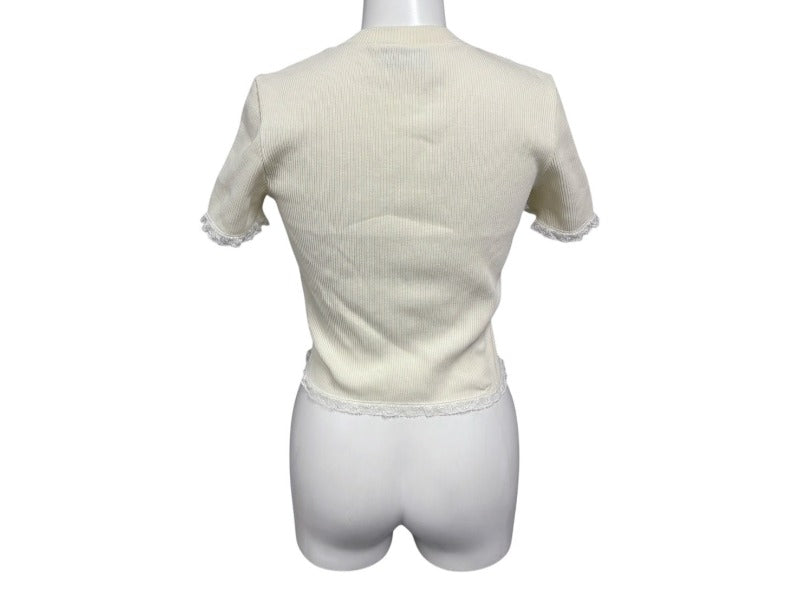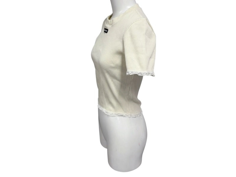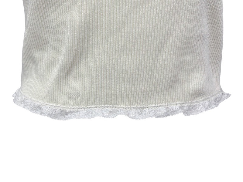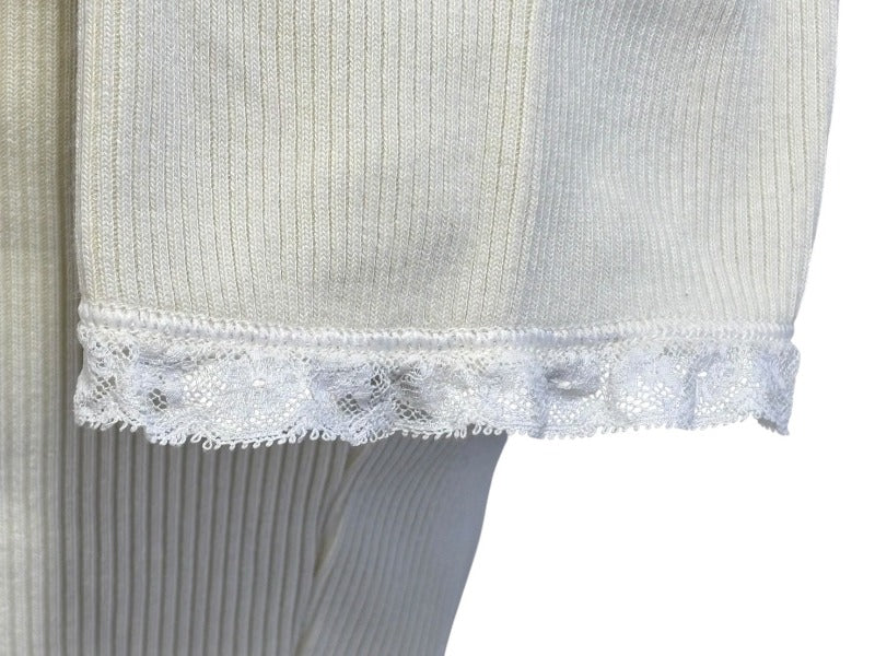 アイボリーのリブコットン生地で高級感が演出でき袖先と裾のレーストリムが女性らしさを際立たせてくれるアイテムです。
