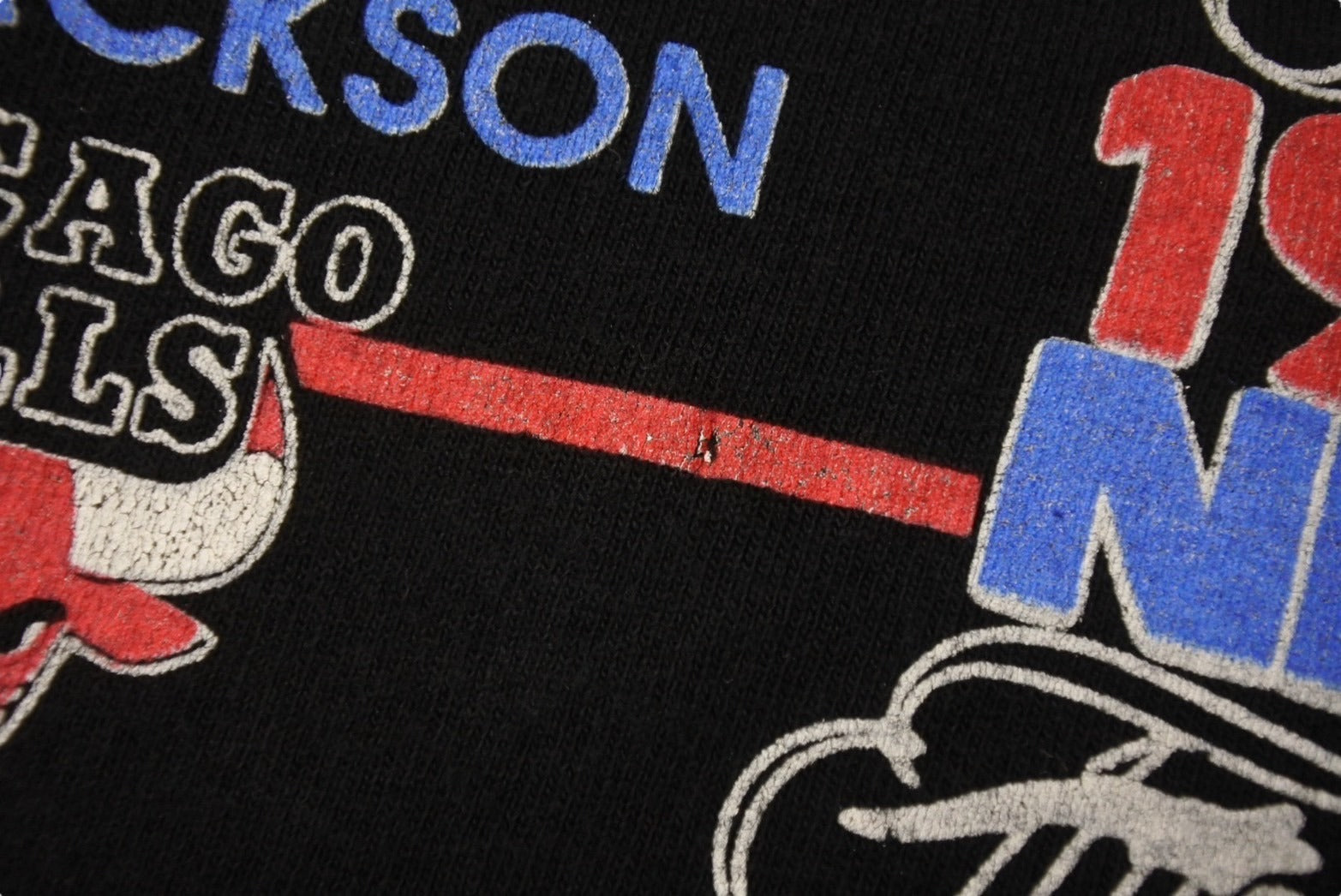 フロントブルズロゴ横に一部汚れあり。リブに毛玉あり。背面チームロゴ横付近にピンホールあり。プリントにかすれ、ひび割れあり。ボディに少々フェードあり。その他使用感の少ない状態です。