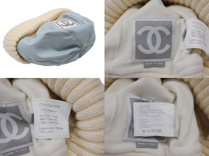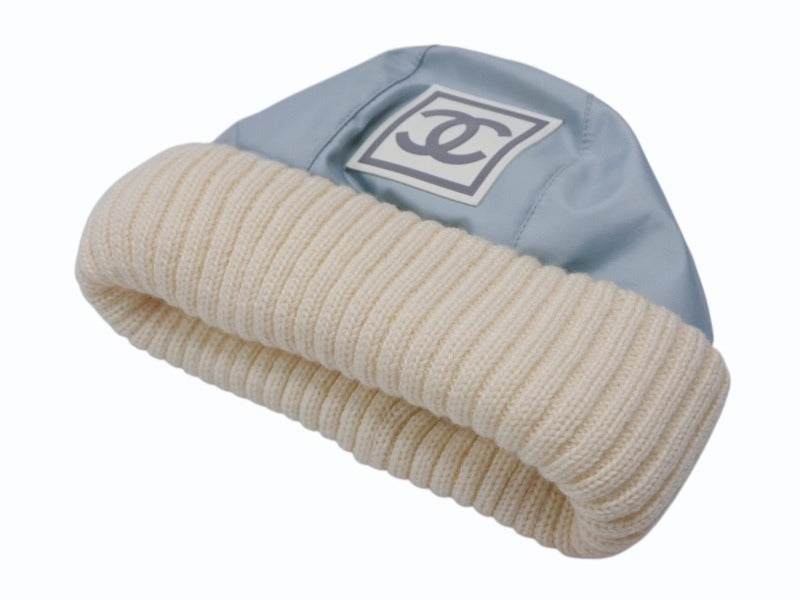 極美品 CHANEL シャネル スポーツライン ニット帽 ココマーク ポリエステル エラスタン アイボリー ブルー サイズM 中古 4b007238