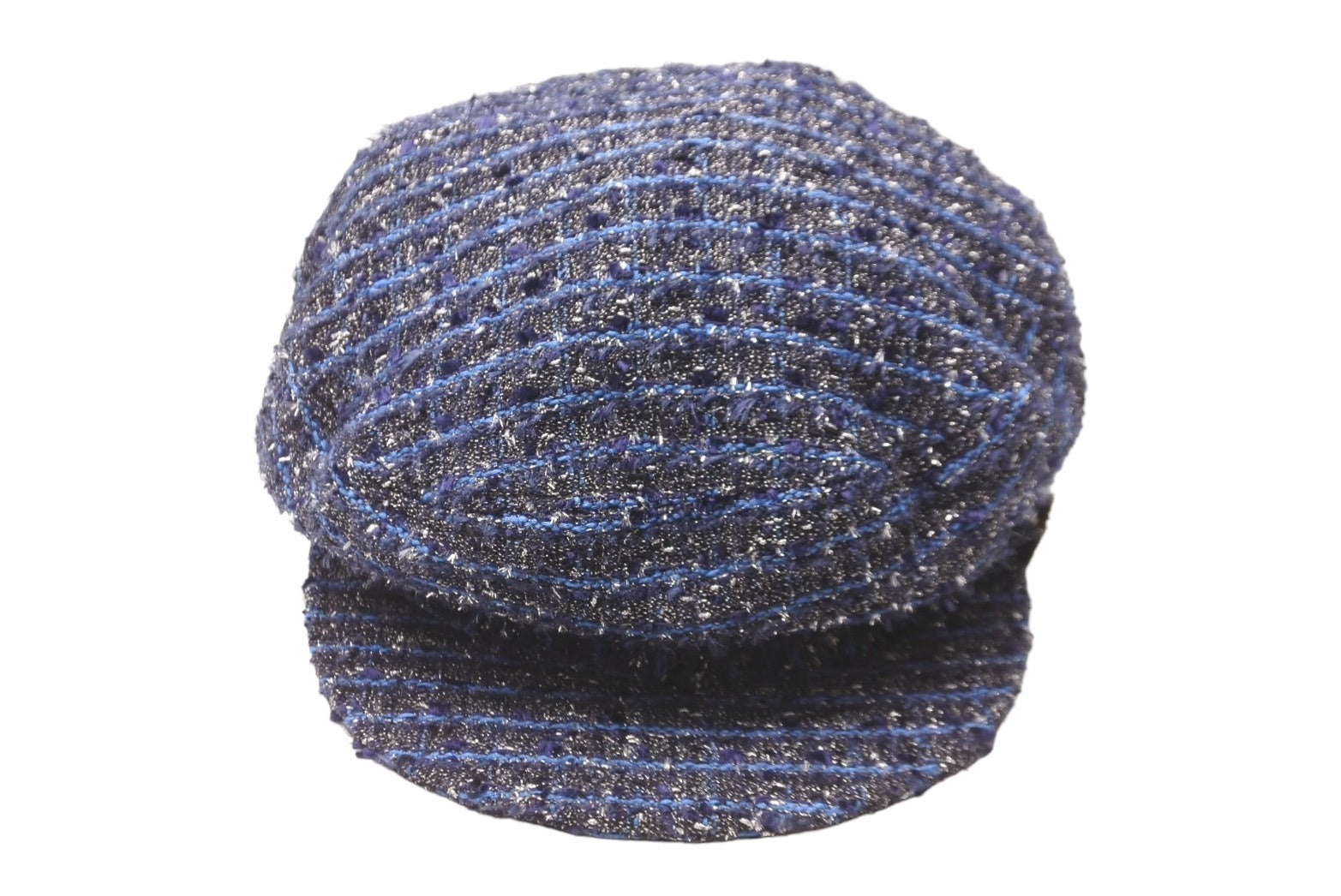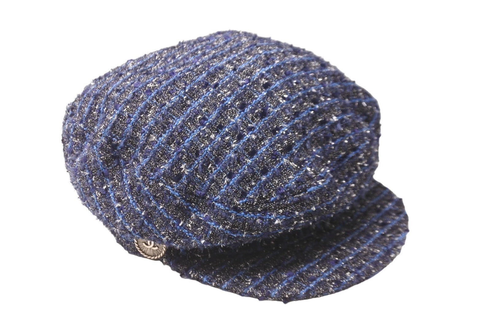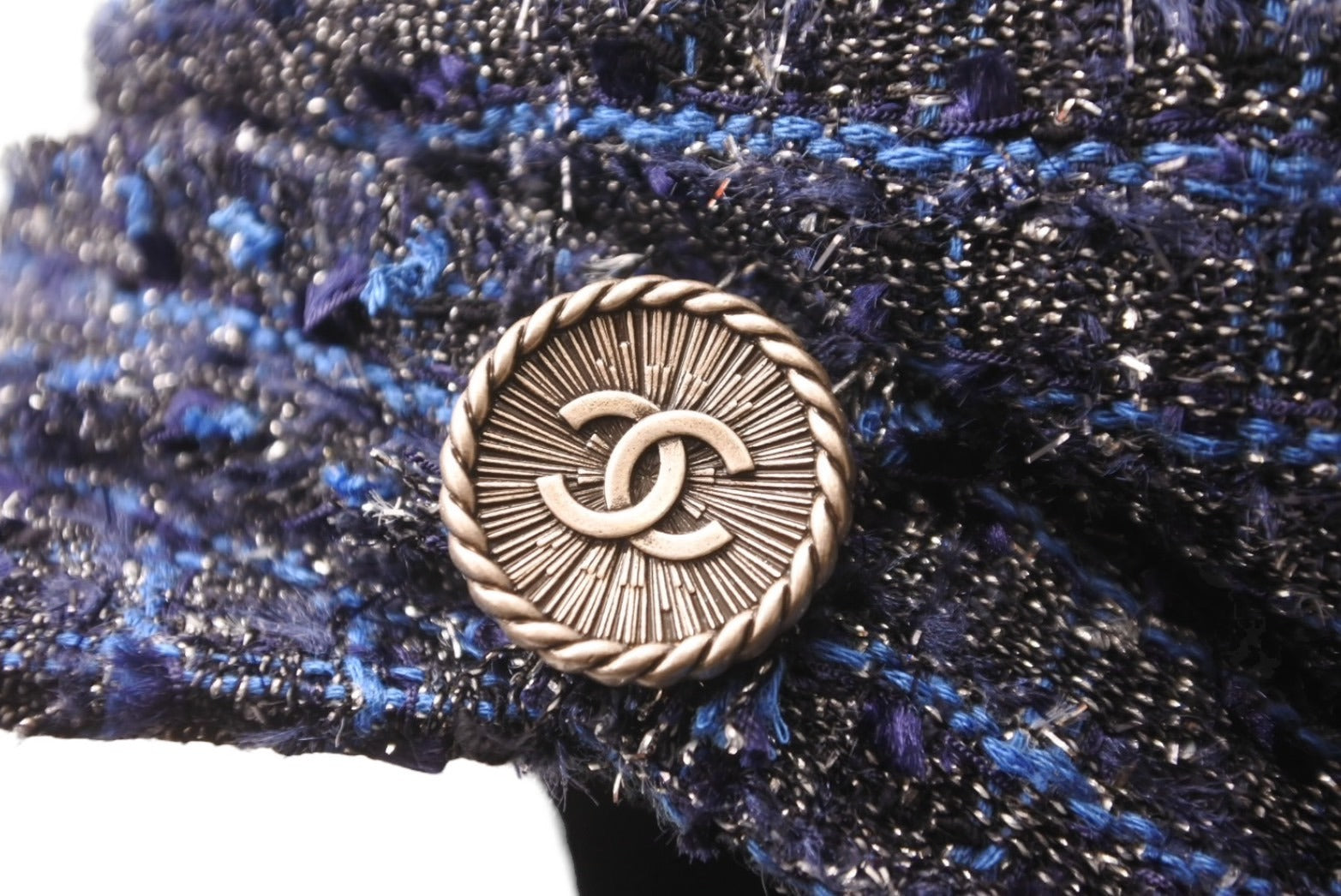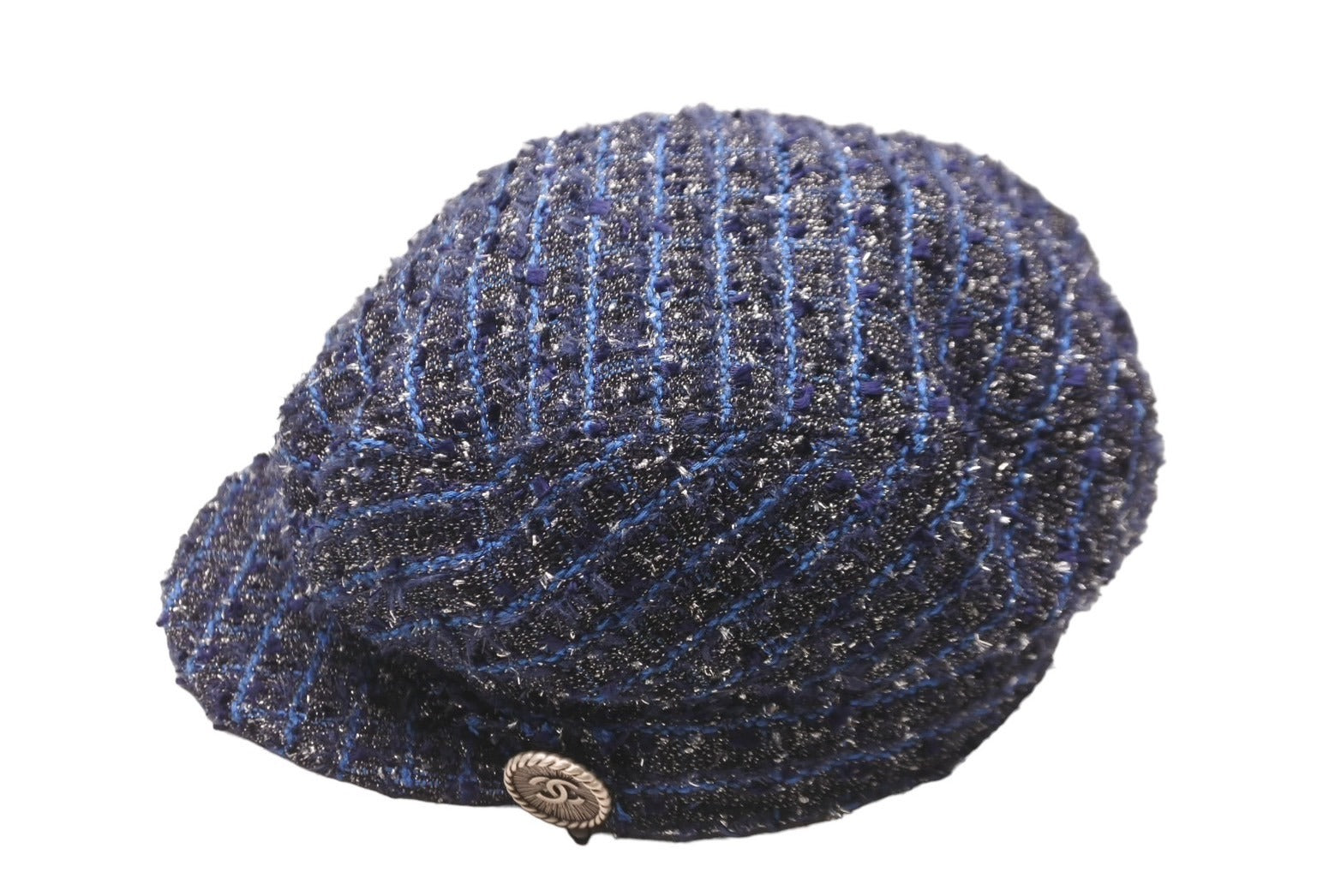 新品同様 CHANEL シャネル ココボタン キャスケット キャップ 帽子 ツイード ブルー ブラック シルバー金具 サイズM 中古 63907