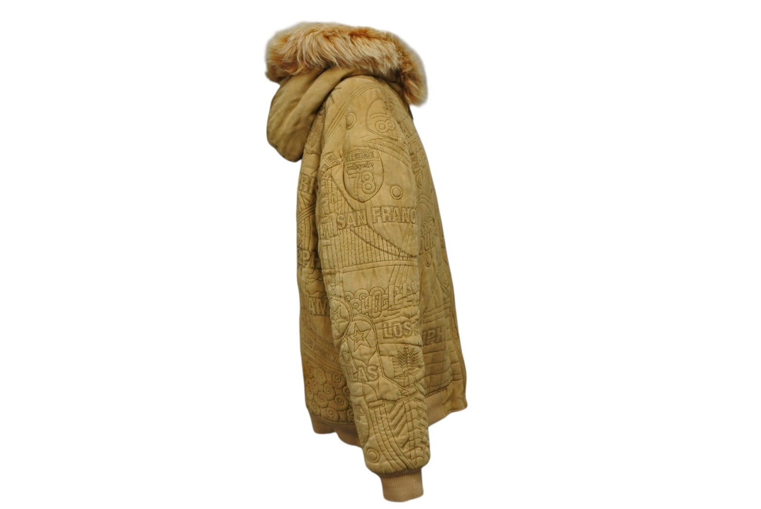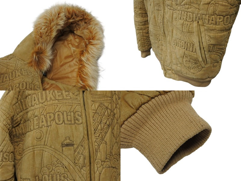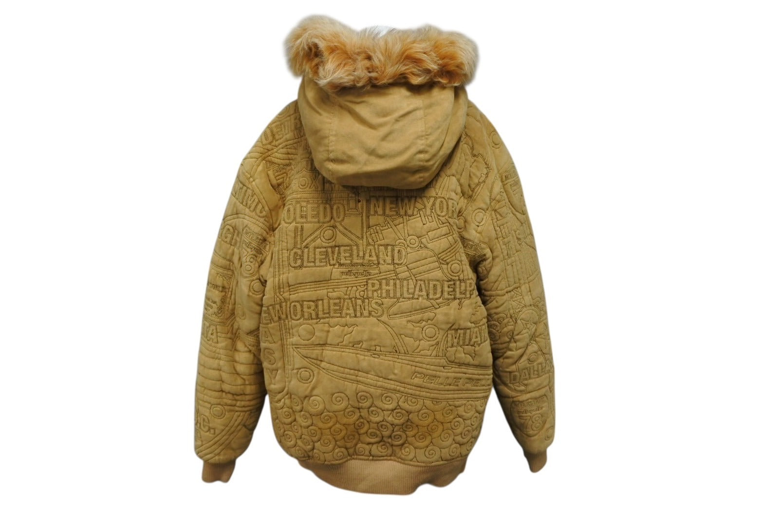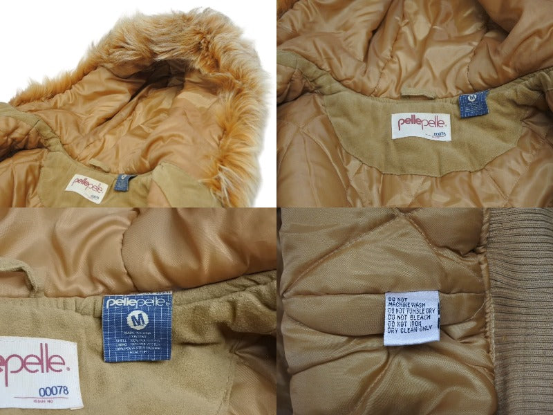 pelle pelle ペレペレ ボンバー フーデッドジャケット サイズM ステッチ ブラウン フェイクファー 総柄 美品 中古 4b010432