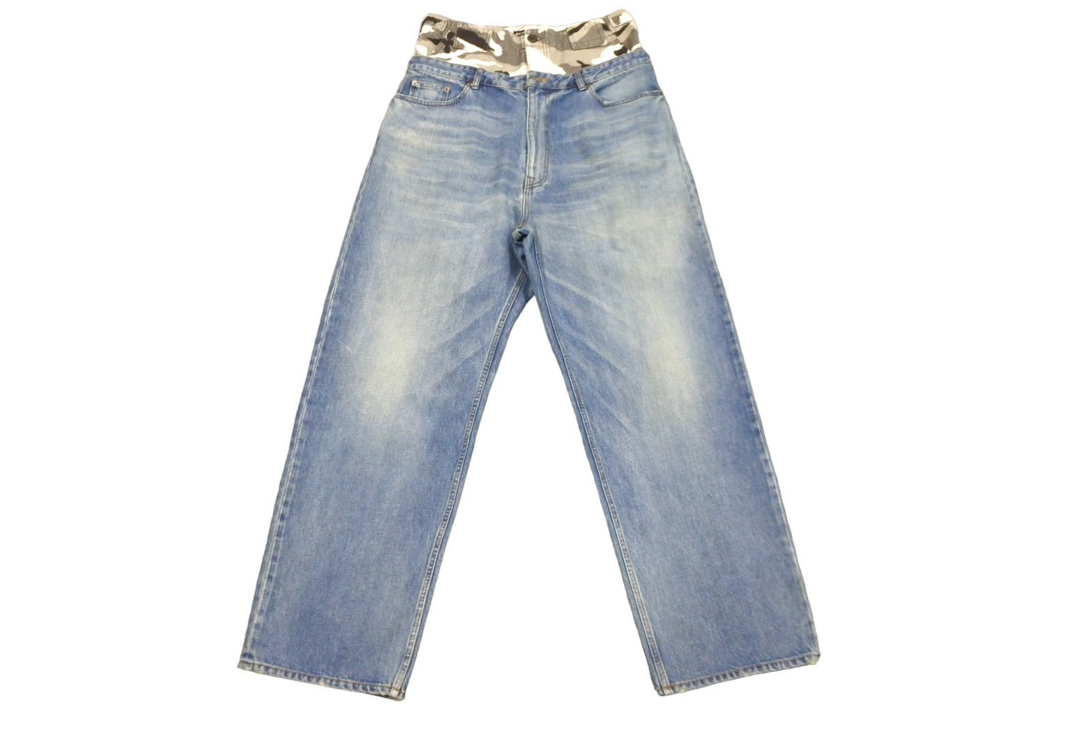 極美品 BALENCIAGA バレンシアガ レイヤード ワイドジーンズ デニムパンツ カモフラージュ 21FW ダメージ加工 ブルー サイズL 661609 TDW14 中古 60185