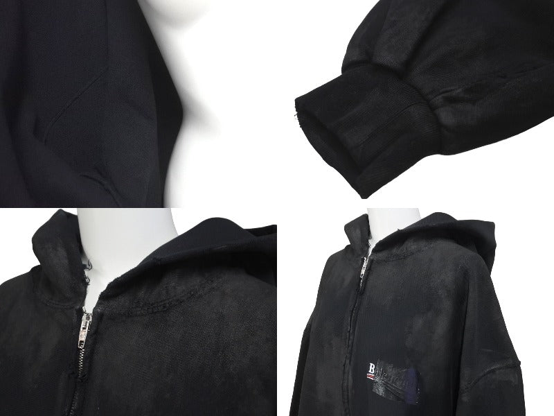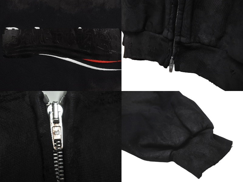 新品同様 BALENCIAGA バレンシアガ キャンペーンロゴダメージ加工ジップアップフーディー サイズL ブラック 720424TNVK5 中古 60186