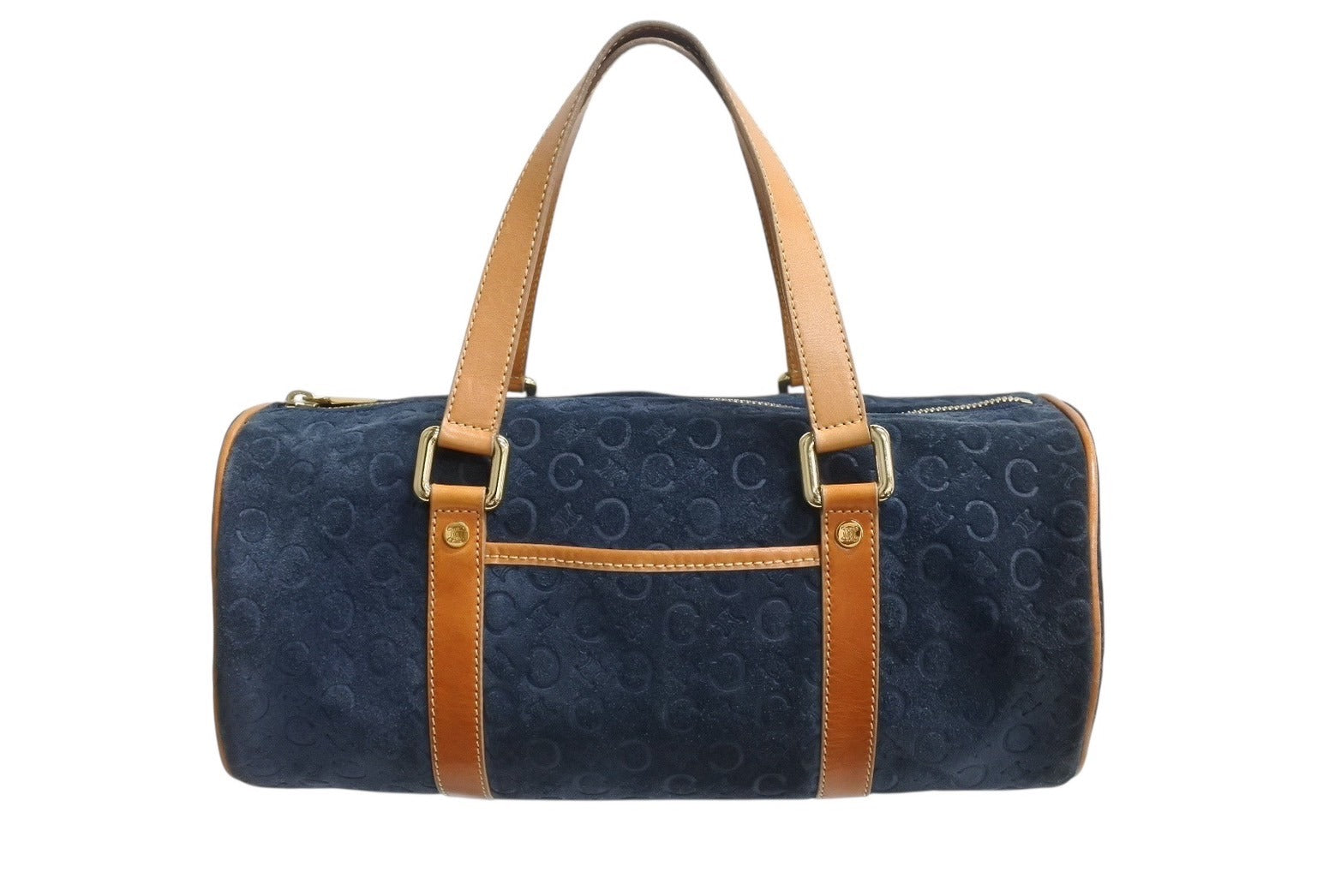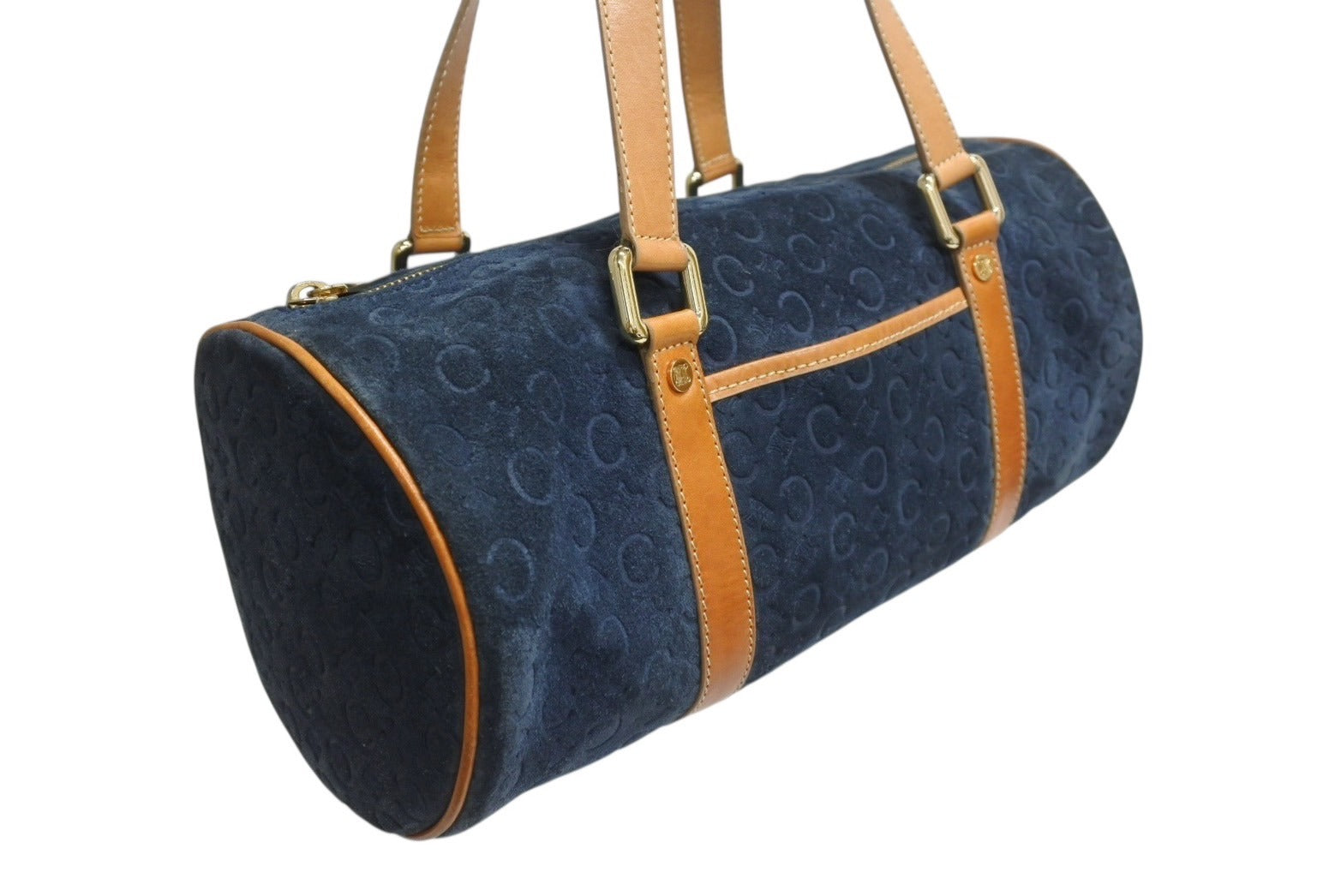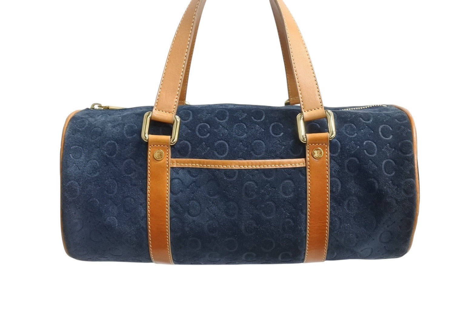 CELINE セリーヌ ハンドバッグ Cマカダム ロゴ金具 筒型 CE00/12 レザー スエード ネイビー ブラウン ゴールド金具 美品 中古 4b002977