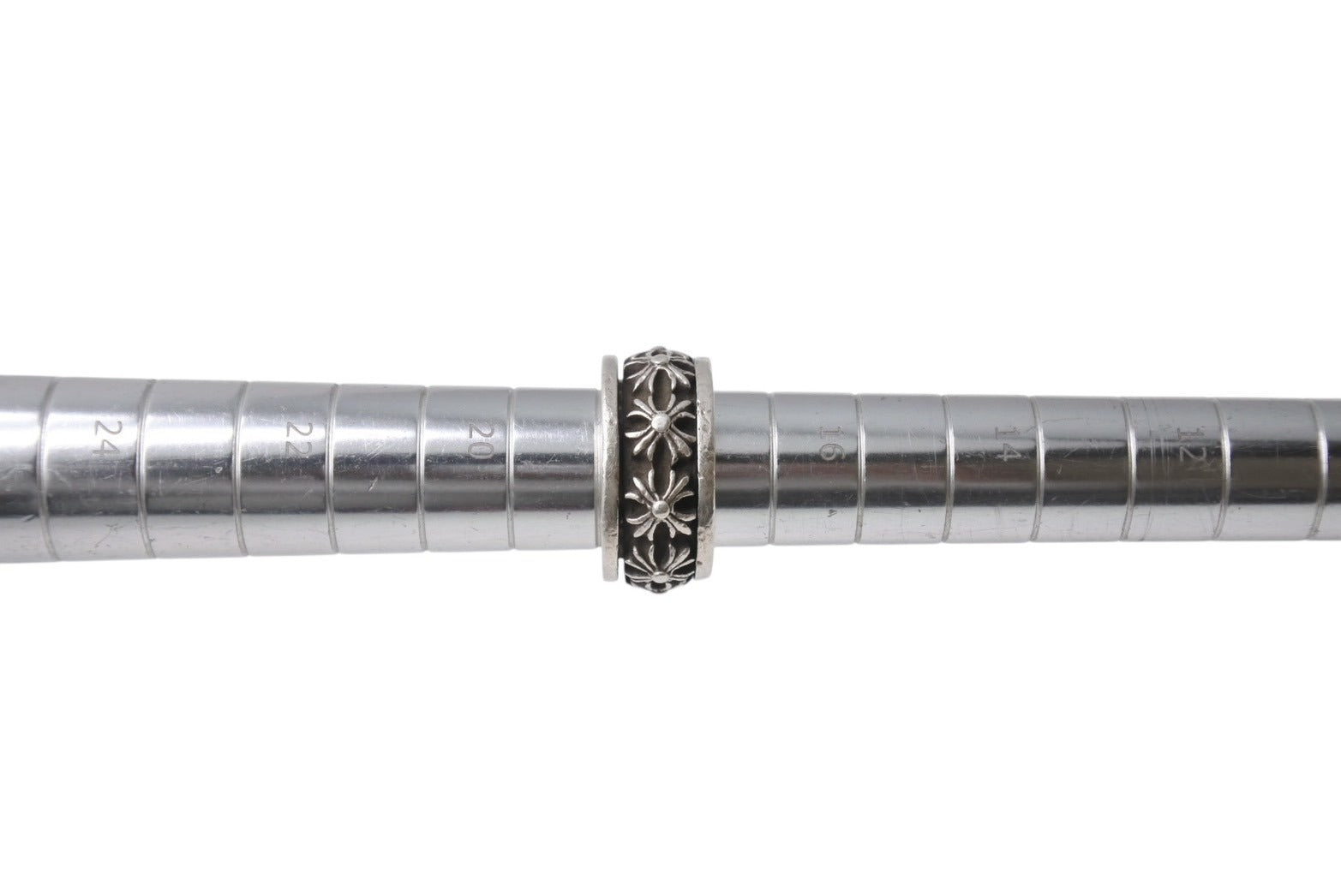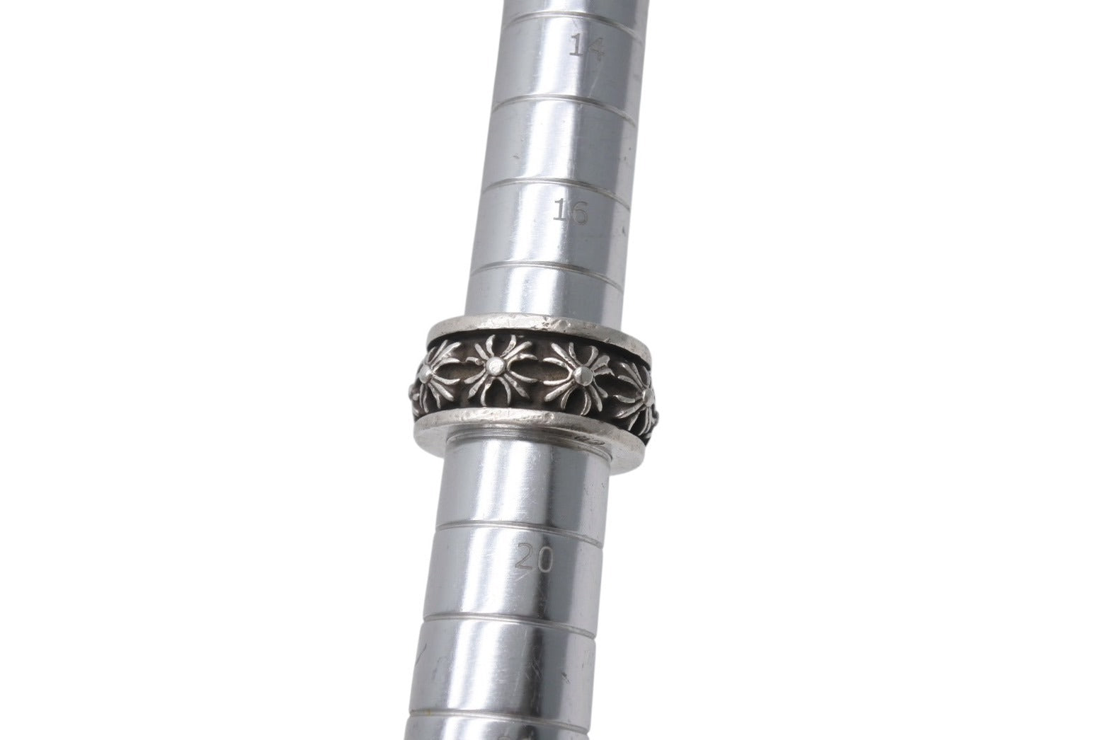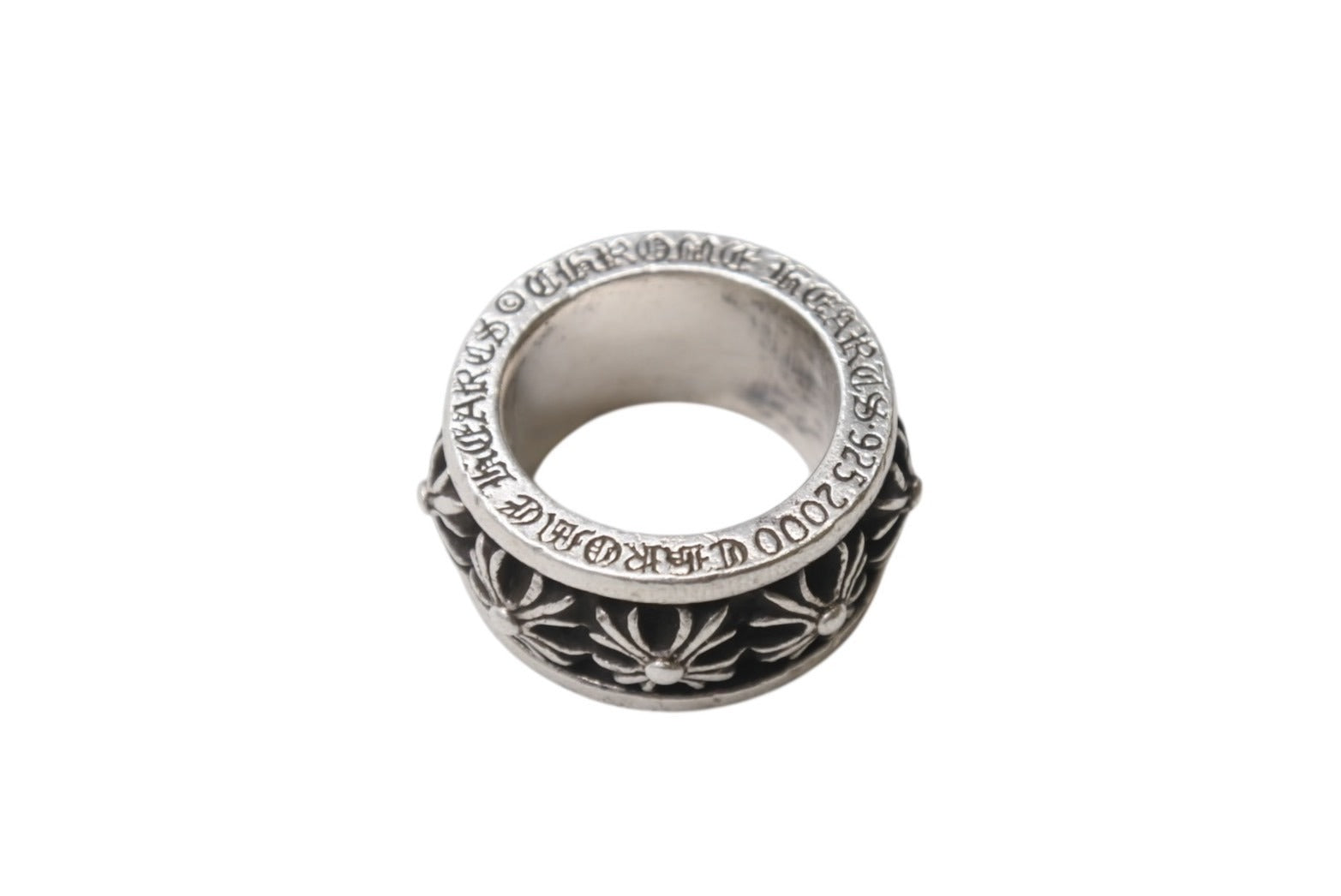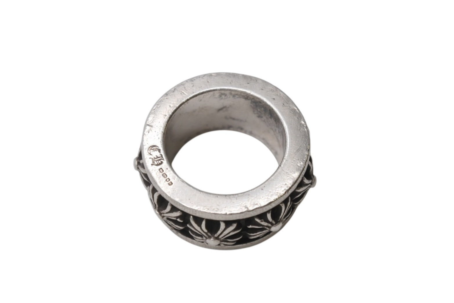 他のクロムハーツのリングと比べて厚みがあり、ROCKな雰囲気を醸し出すハードな装いが目を引くリング。ズッシリとしたクロムハーツならではの重みも感じられる、クロムハーツらしいデザイン。