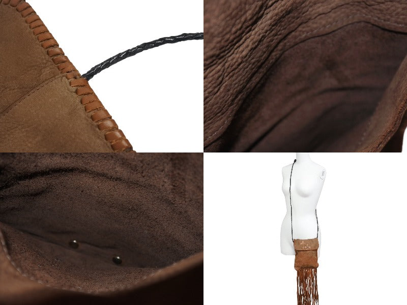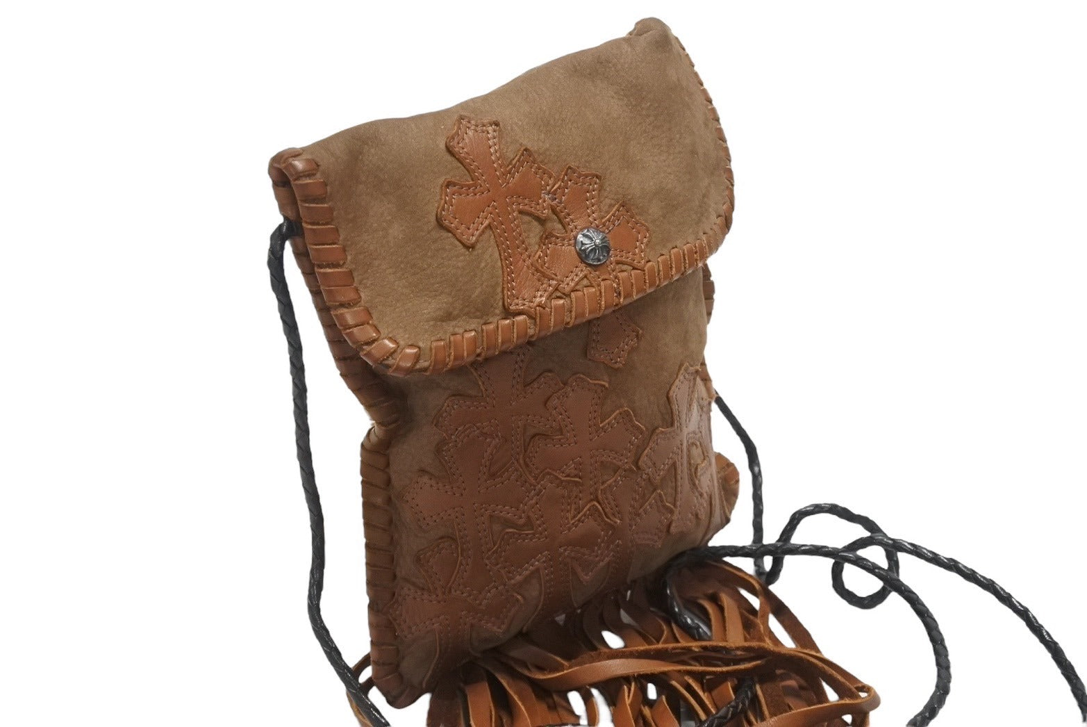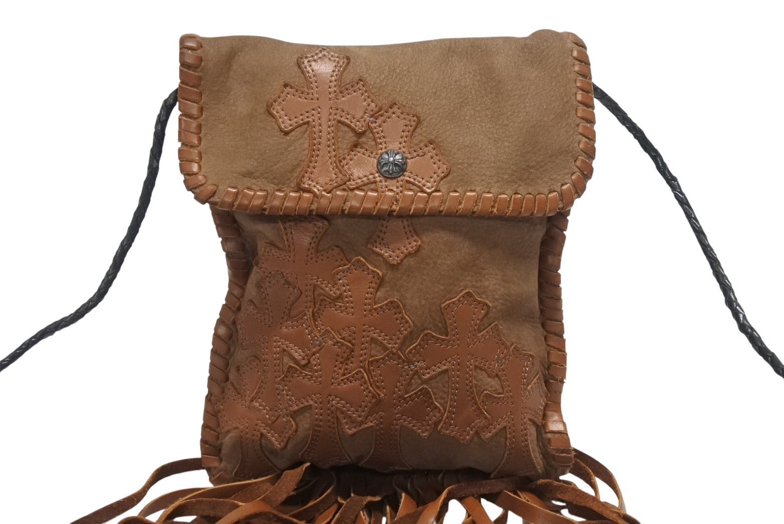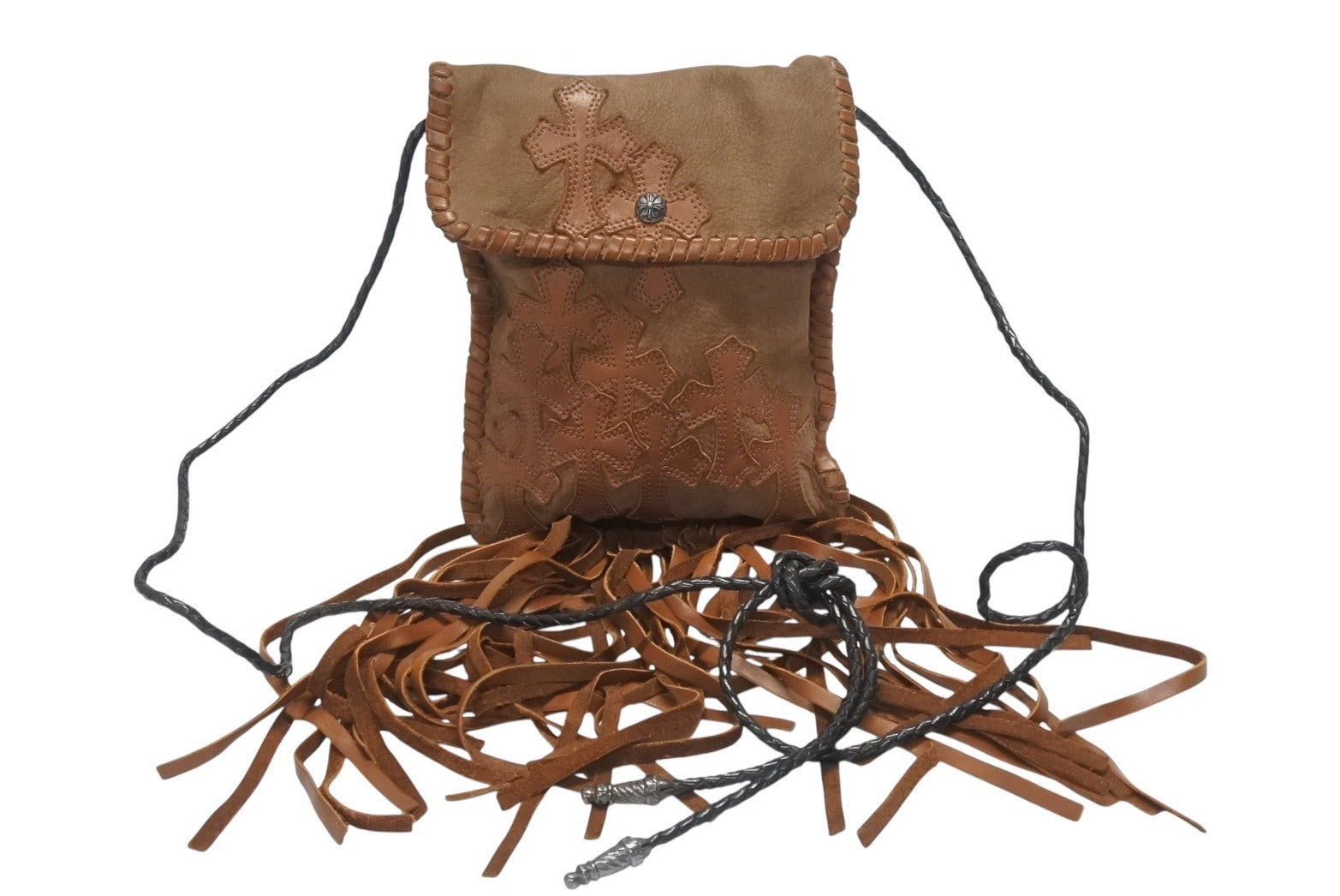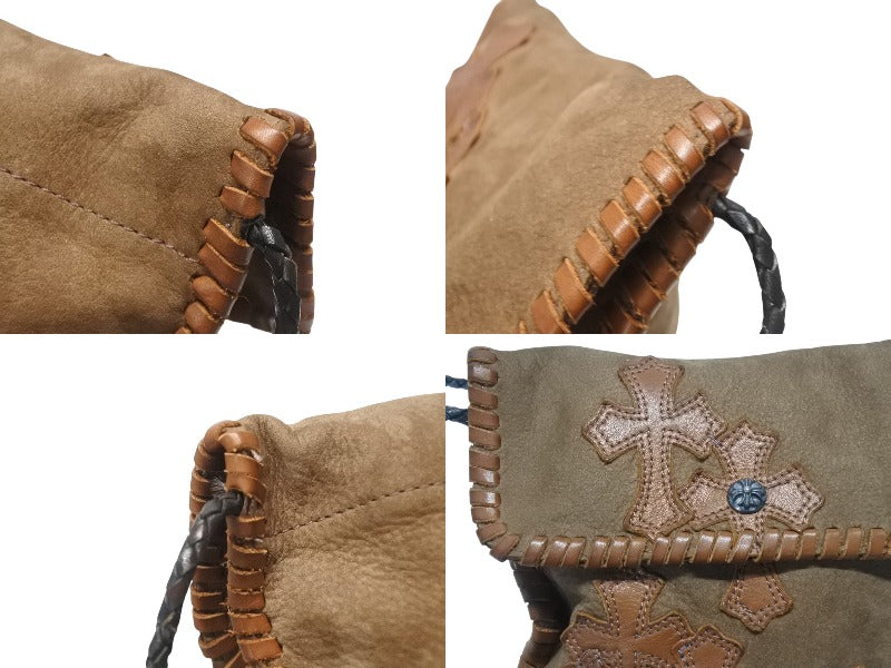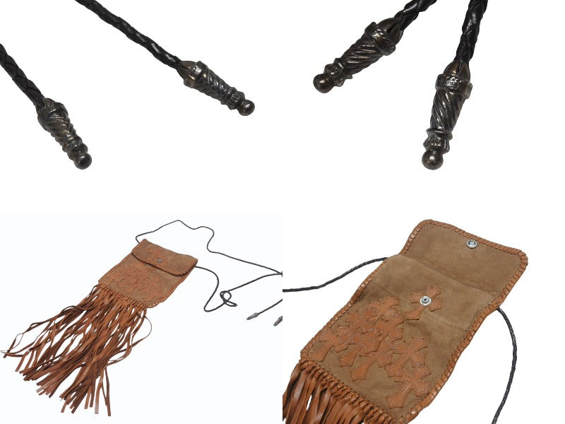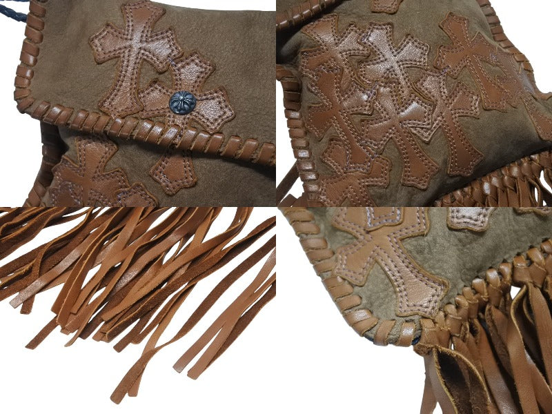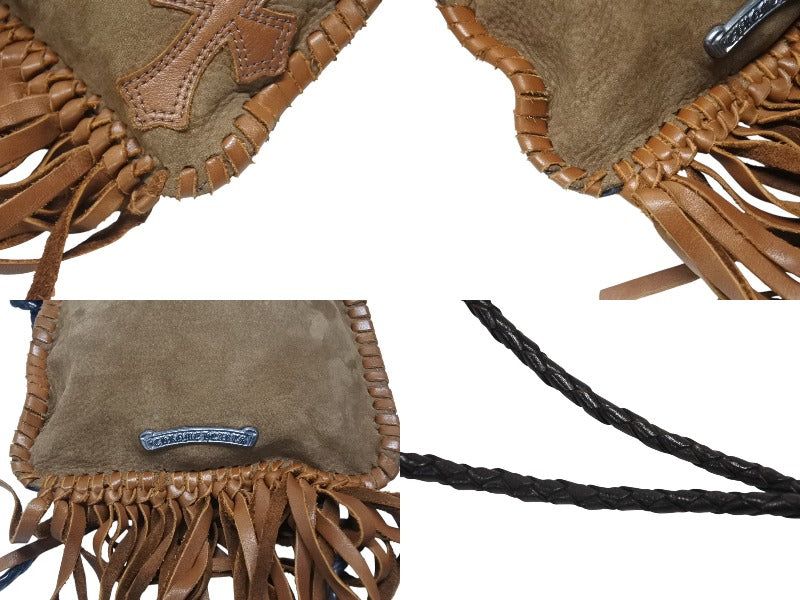 極美品 CHROME HEARTS クロムハーツ スクエア クロスポシェット フリンジ ショルダーバッグ セメタリー クロスパッチ ブラウン 中古 4b006276