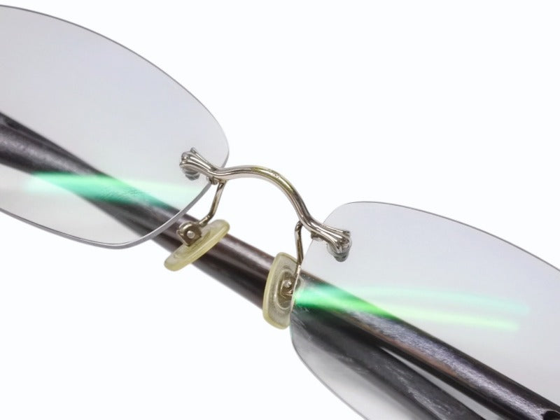 パッド、金具やや緩みあり。金具内側僅かにサビあり。金具剥げ、変色あり。テンプル部分剥がれ、刻印消えあり。くすみあり。テンプル僅かに歪みあり。度入り。