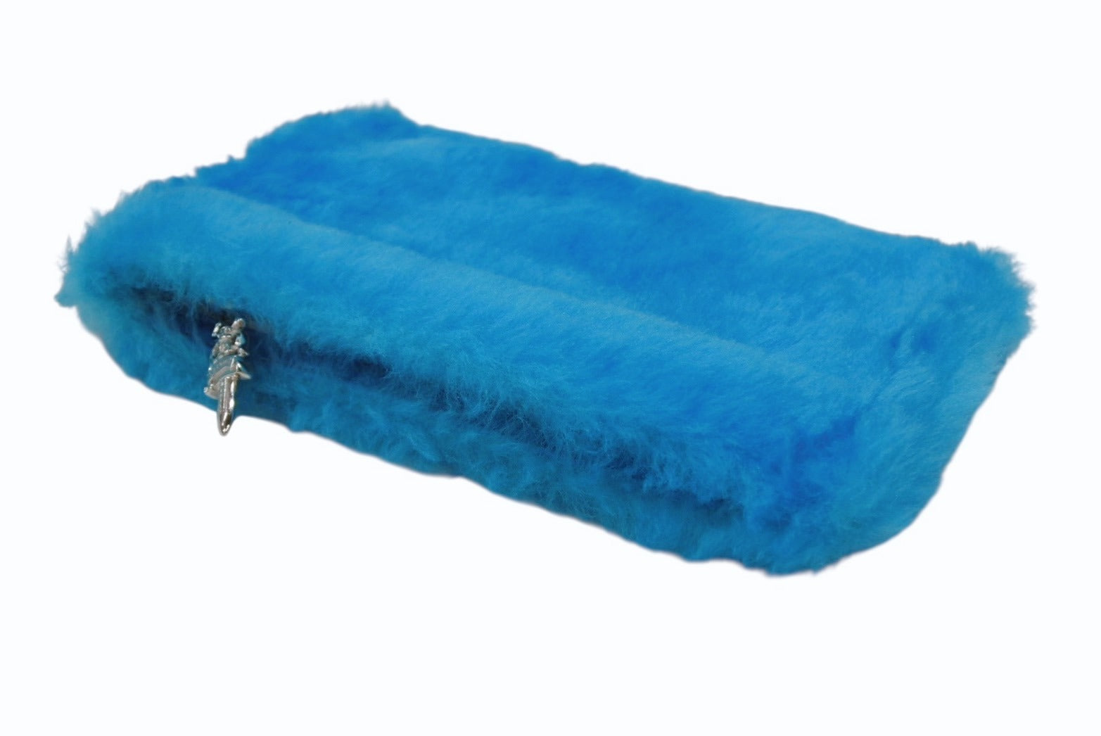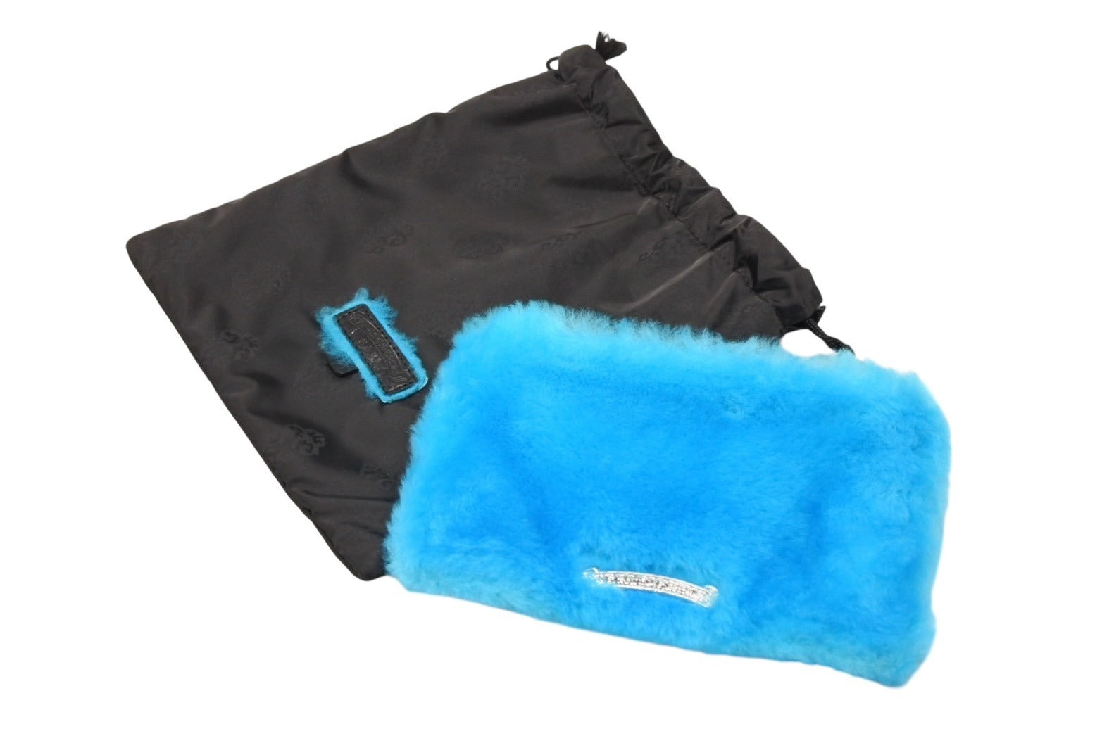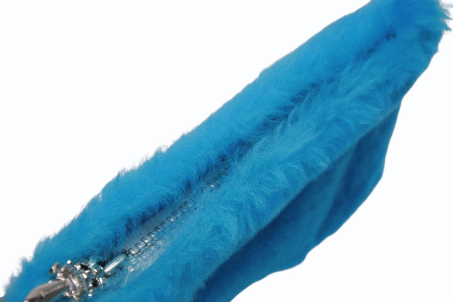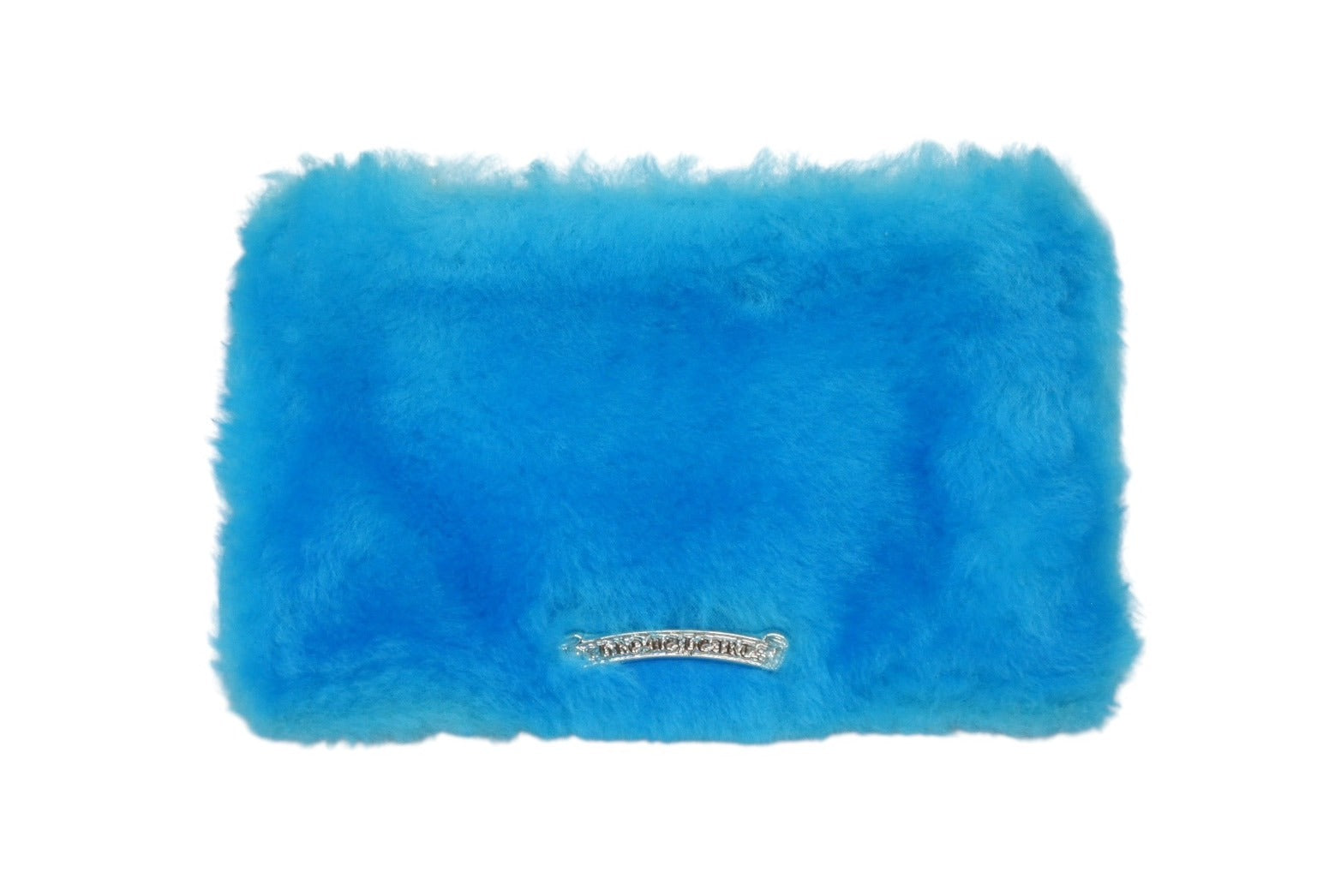鮮やかなブルーカラーが目を惹くファーポーチです。