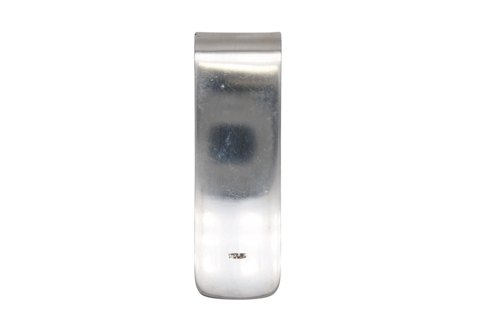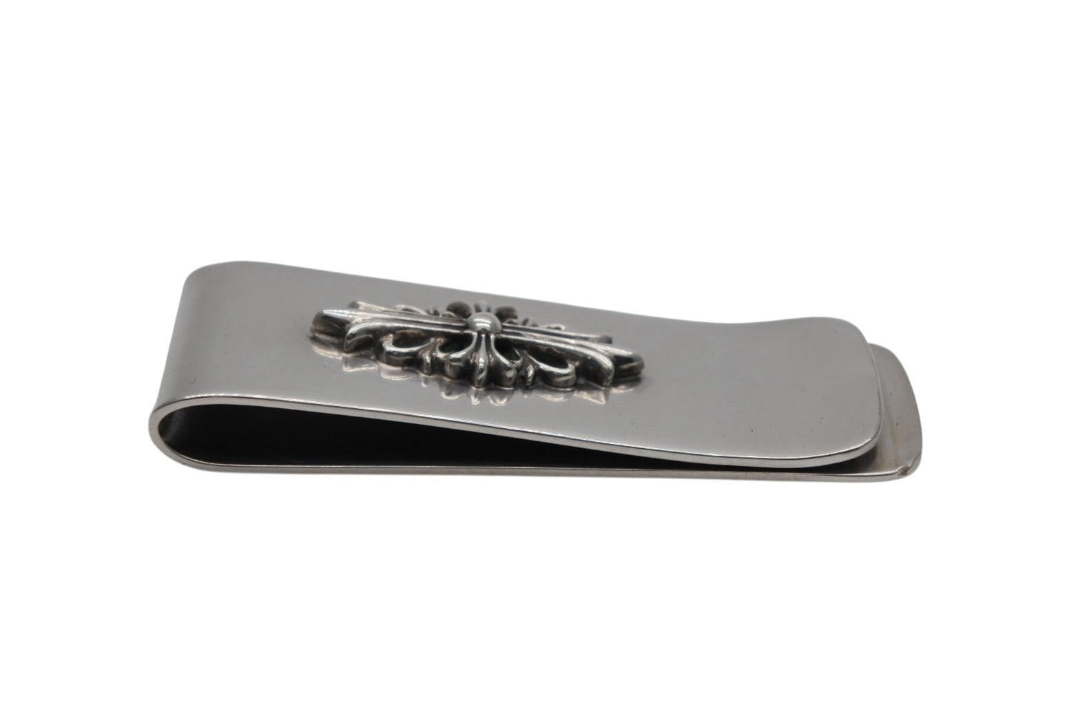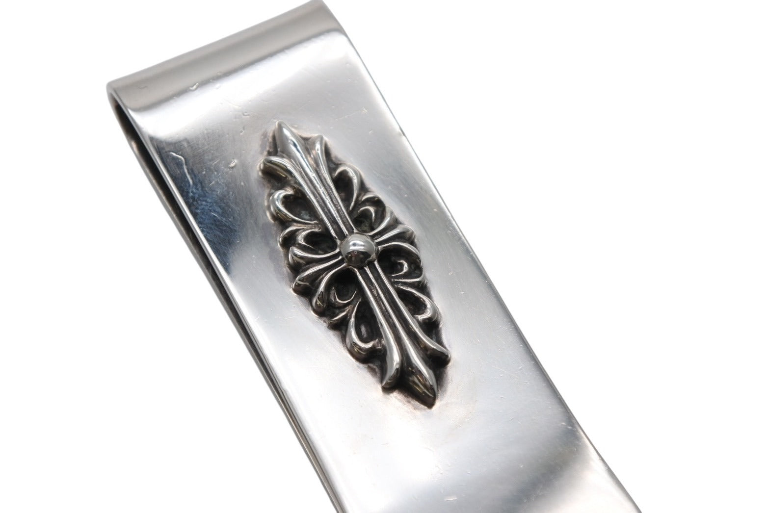シルバーマネークリップのフロントにはフローラルクロスのデザインが施されております。