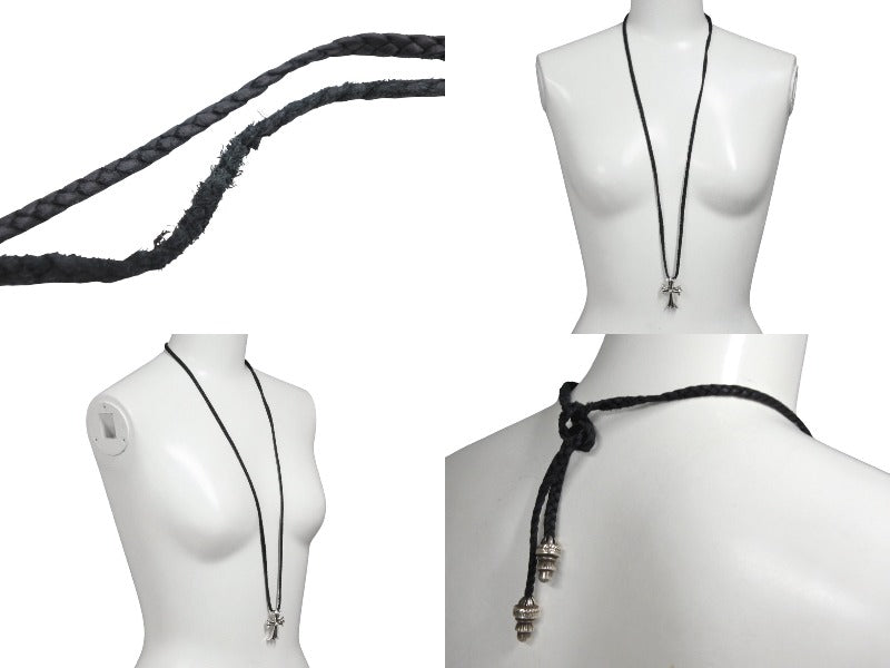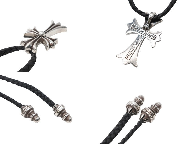 ぼろチップ付きのレザーブレイドとスモールCHクロスの組み合わせが目を惹くネックレスです。