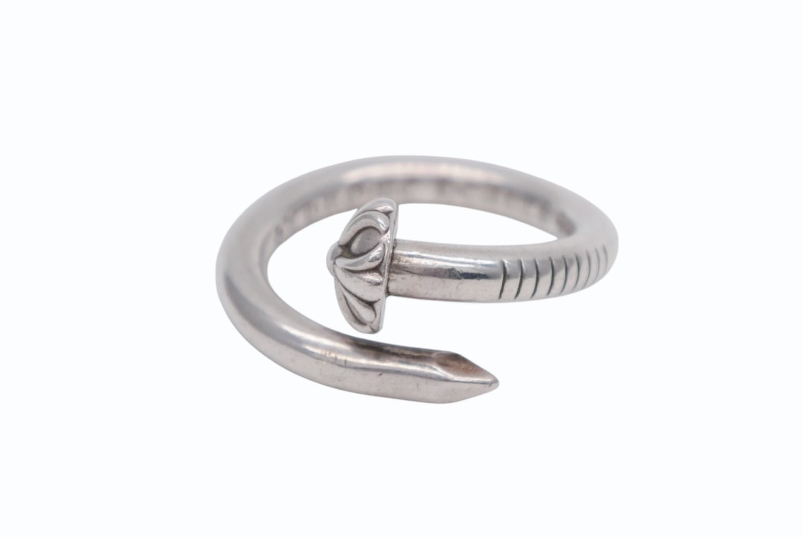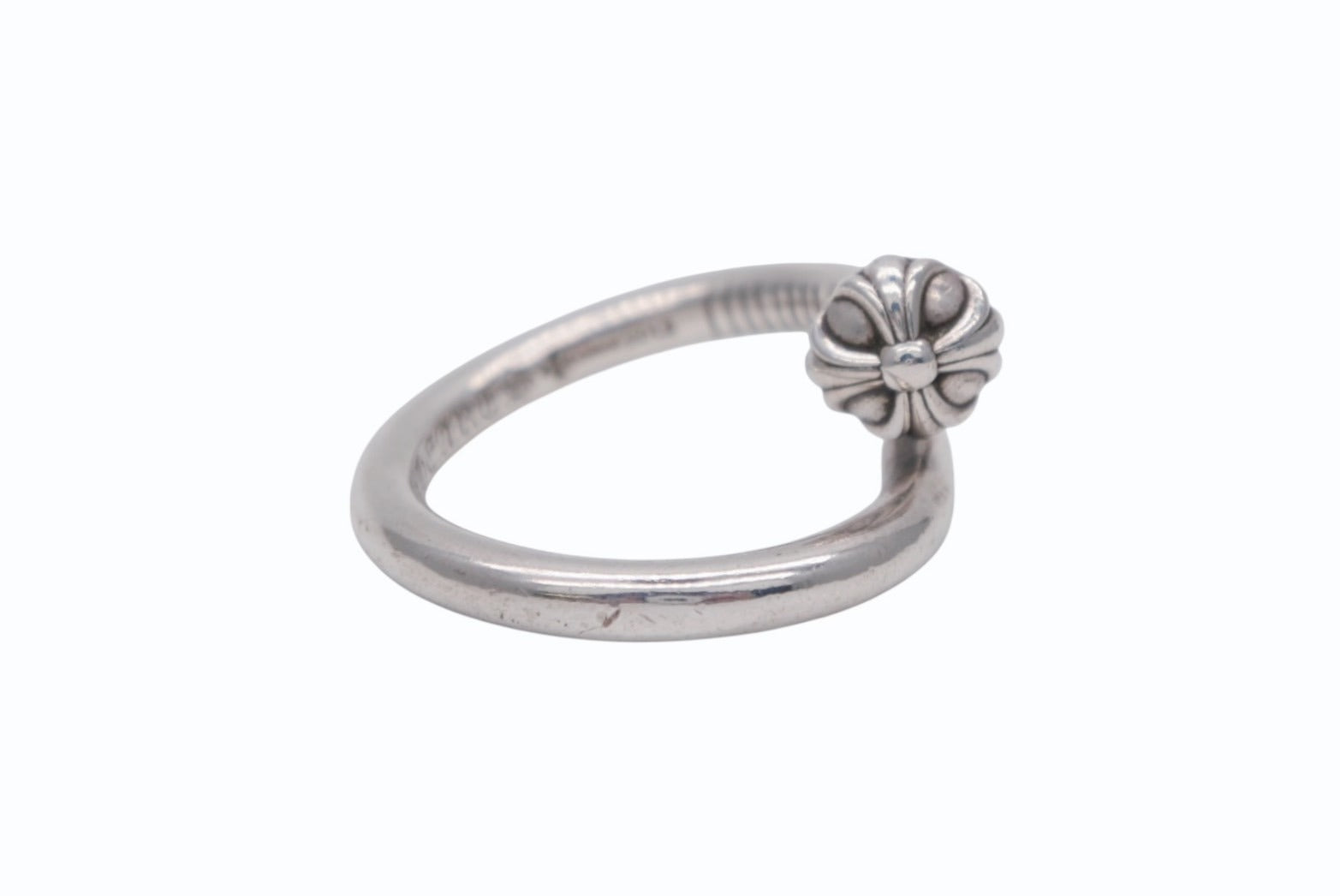 まるでシルバーのリングが指に巻き付く釘のようにデザインされたスタイリッシュなリングです。非常にファッション性の高いフォルムですが、クロムハーツの美しいシルバーも愉しめるように作られています。指輪の先端部分には、クロスボールがデザインされており、クロムハーツらしいアレンジも嬉しいリング。