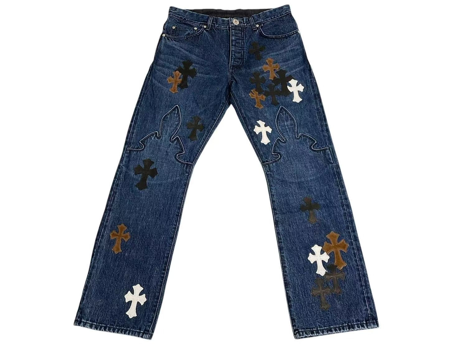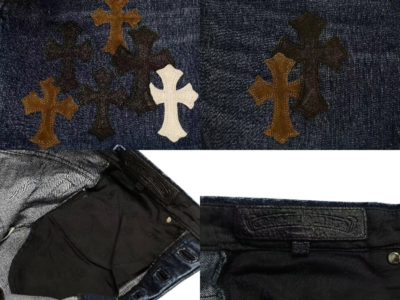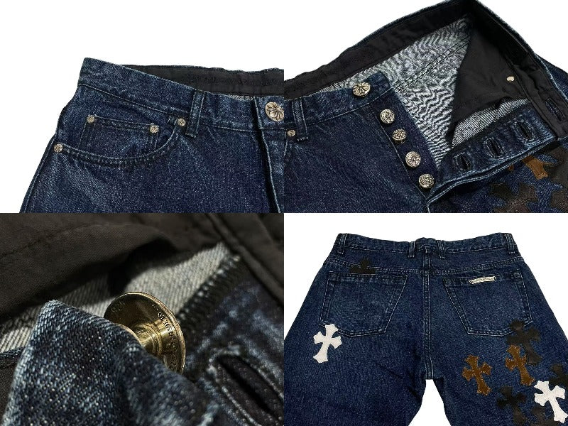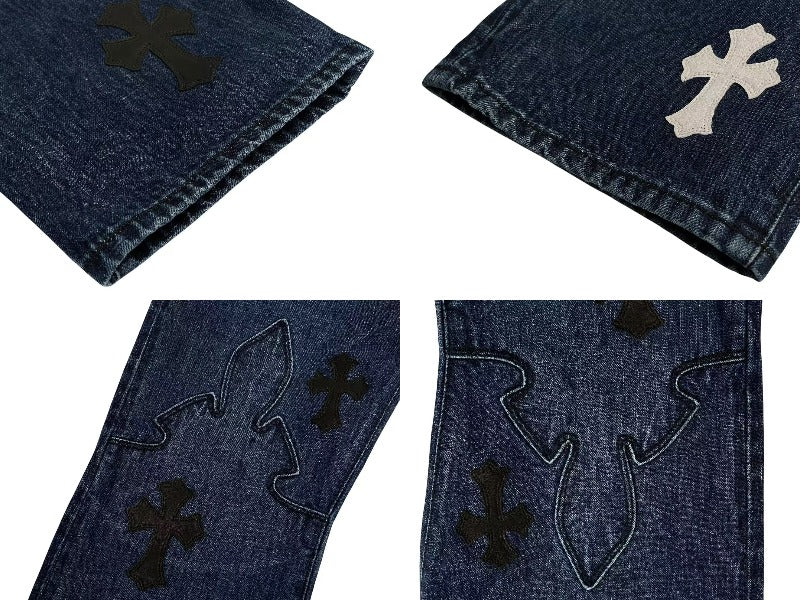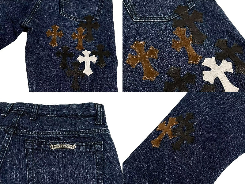 クロムハーツオリジナルのフレアニーデニムに3色のクロスパッチがあしらわれた極上のデザインです。