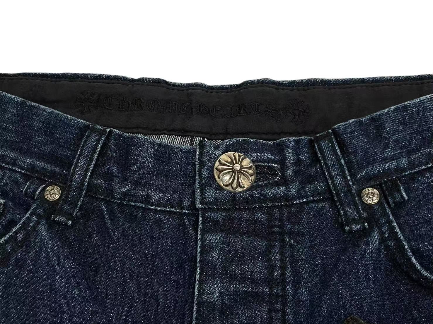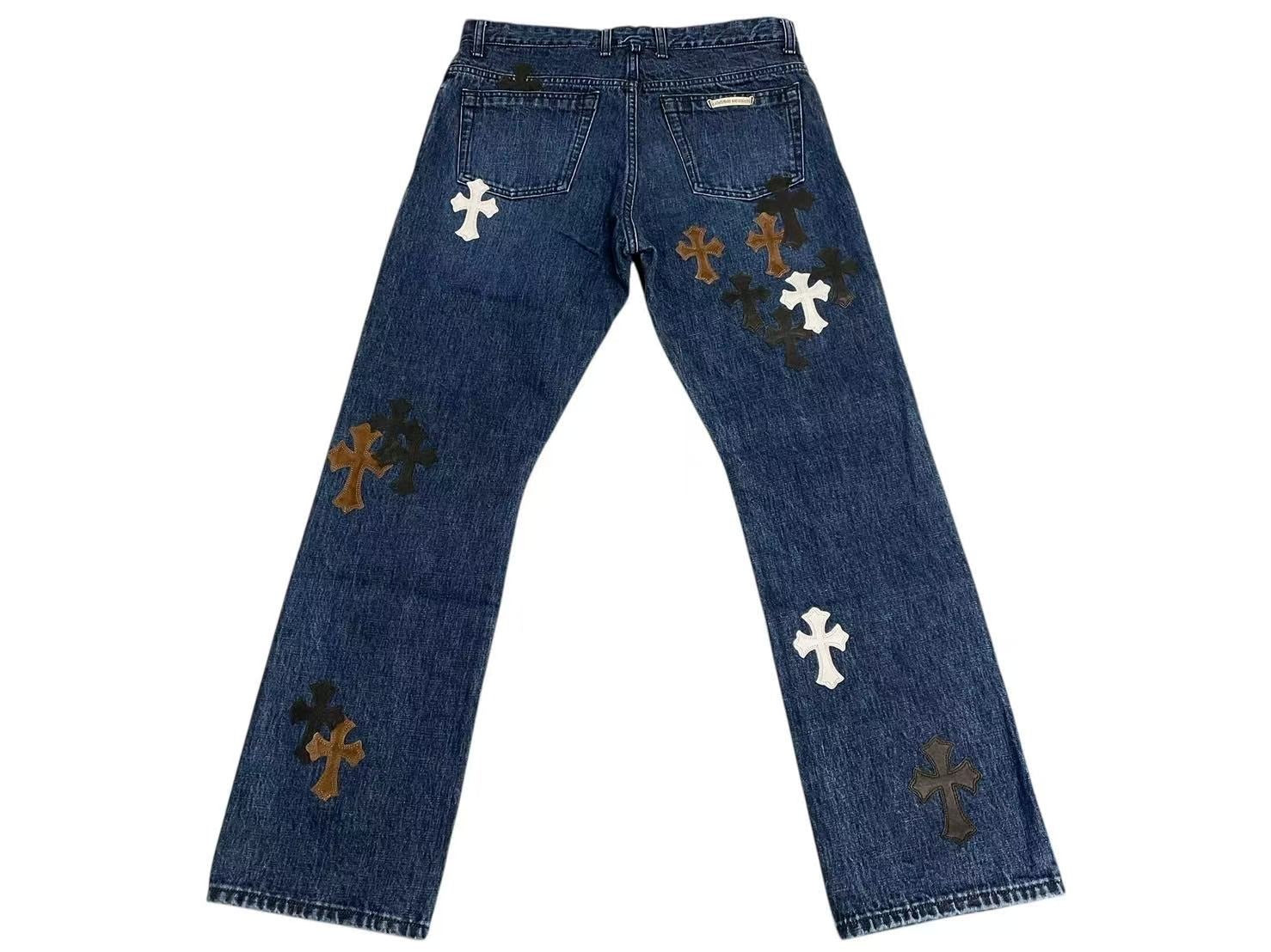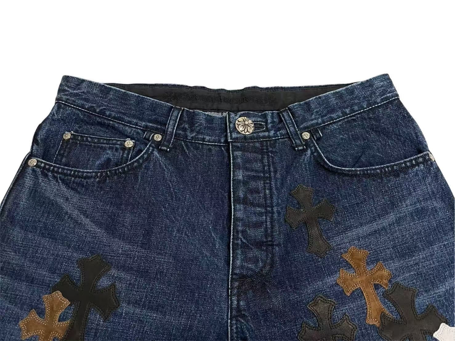 クロムハーツオリジナルのフレアニーデニムに3色のクロスパッチがあしらわれた極上のデザインです。