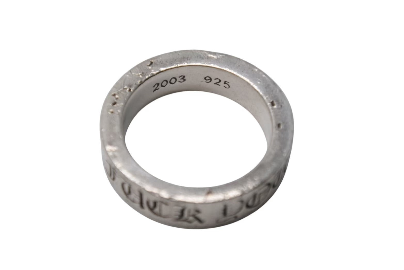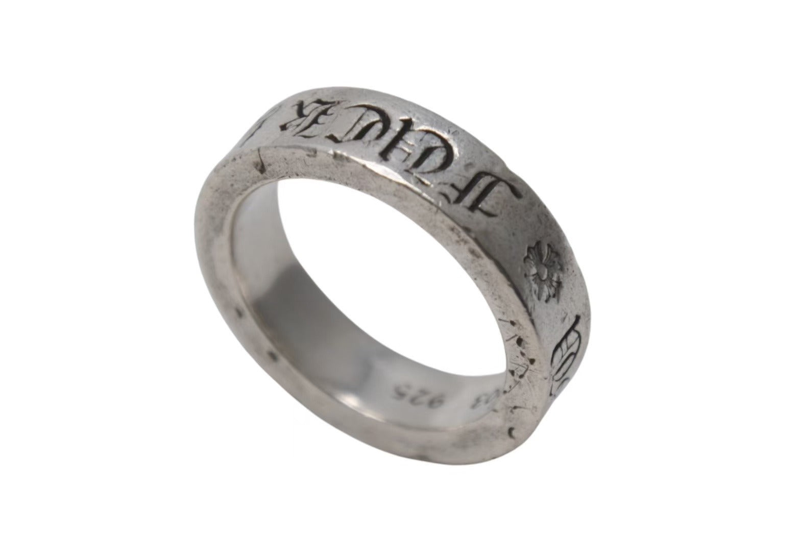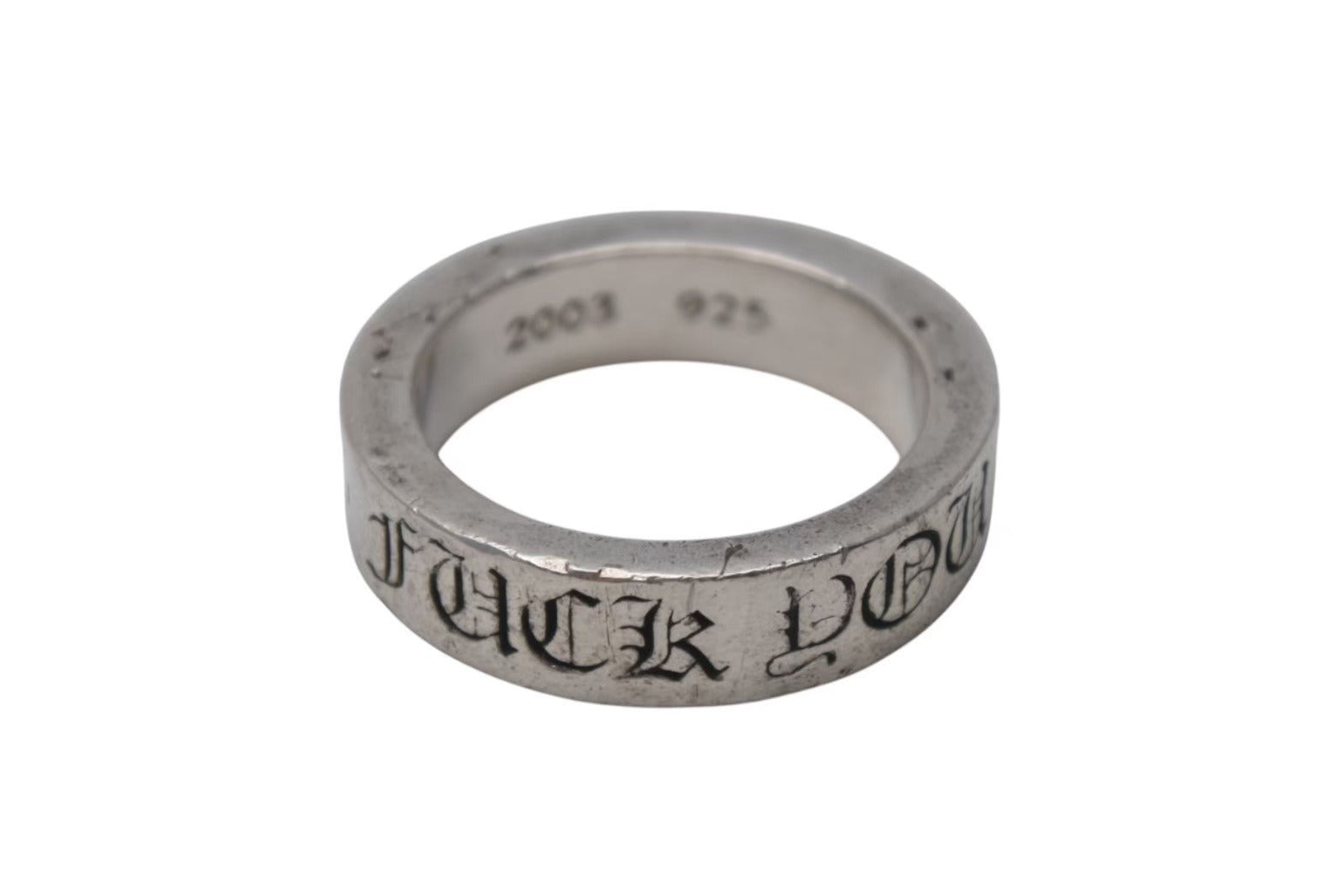リングの表面には「FUCK YOU」の文字とクロスモチーフが描かれた美しいデザインと、側面には、「CHROME HEARTS」の文字とシンプルなクロスがしっかりと描かれています。