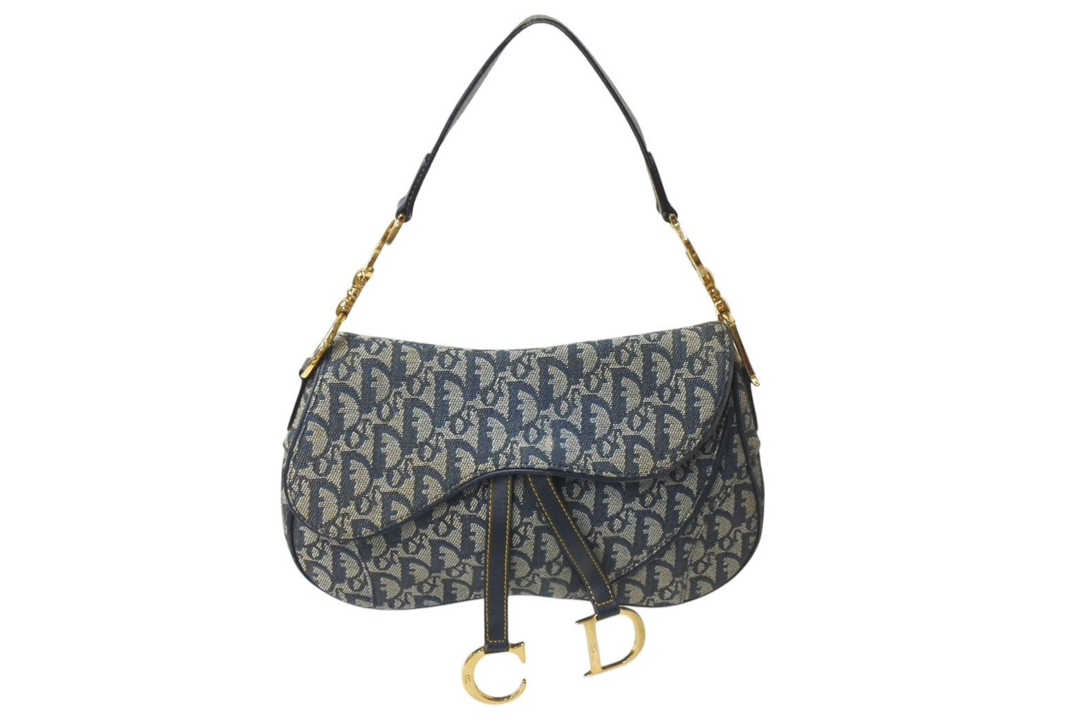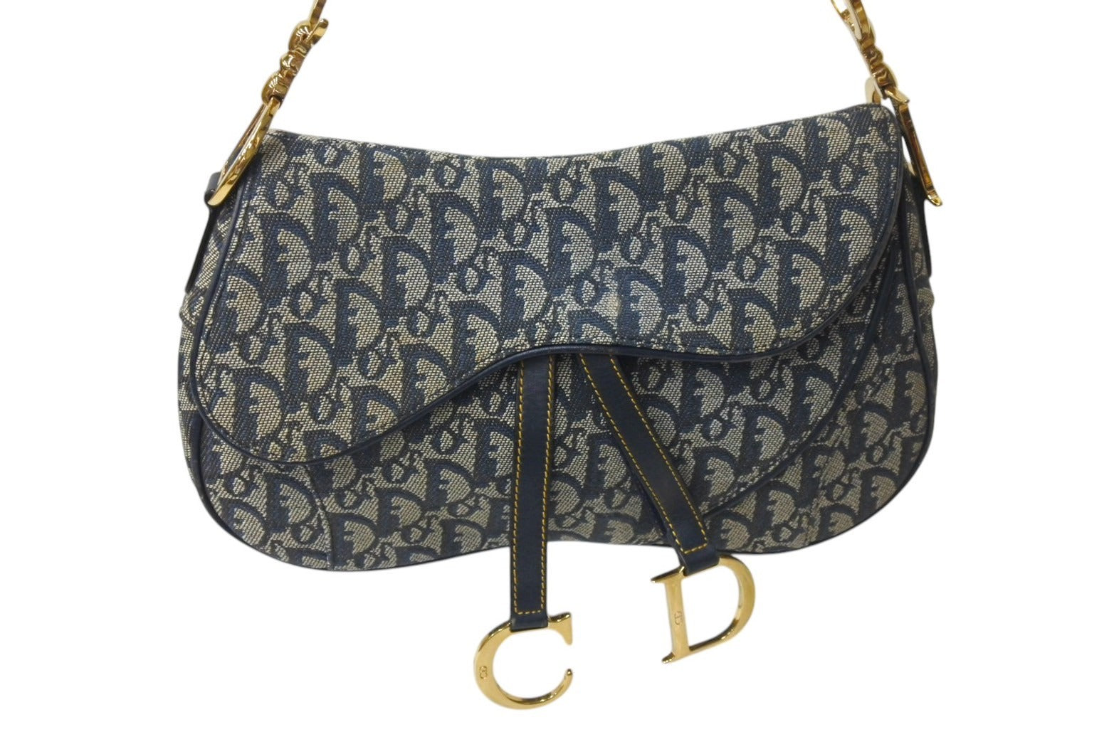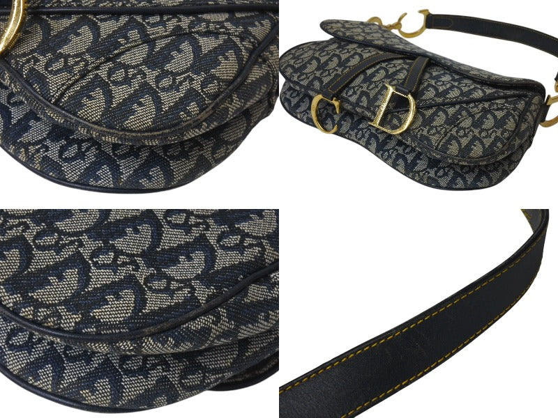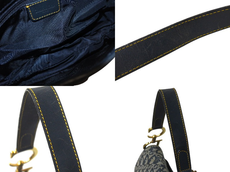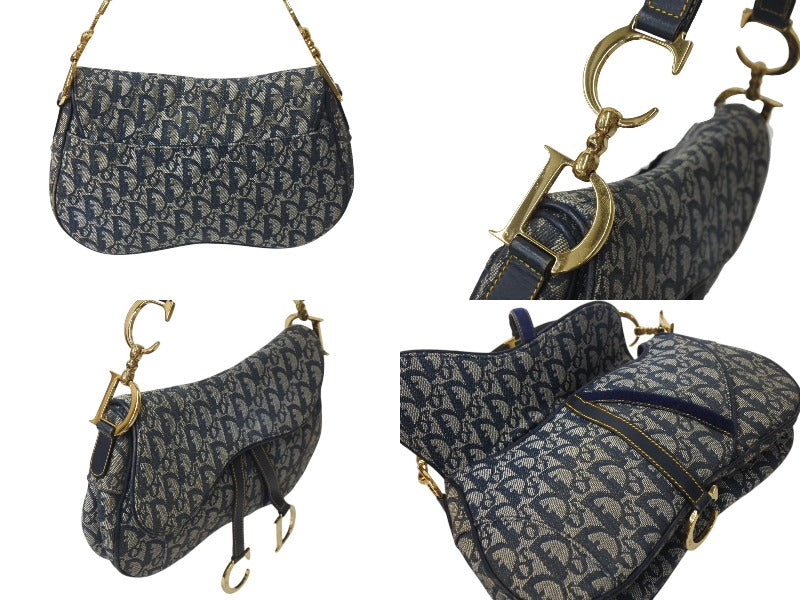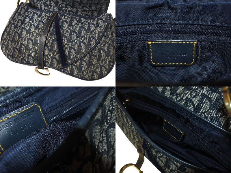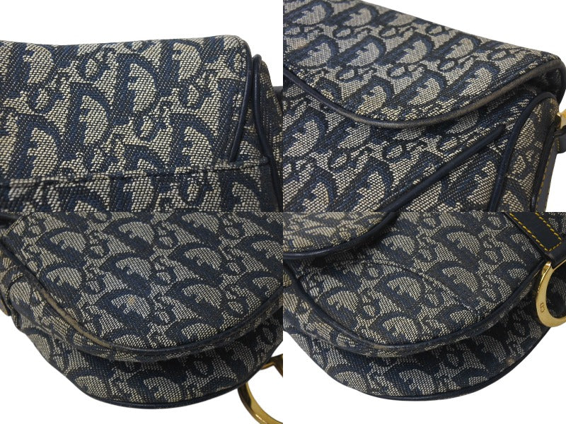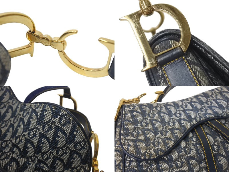 ChristianDior クリスチャンディオール トロッター ダブルサドルバッグ キャンバス レザー ネイビー ゴールド 美品 中古 4b001263