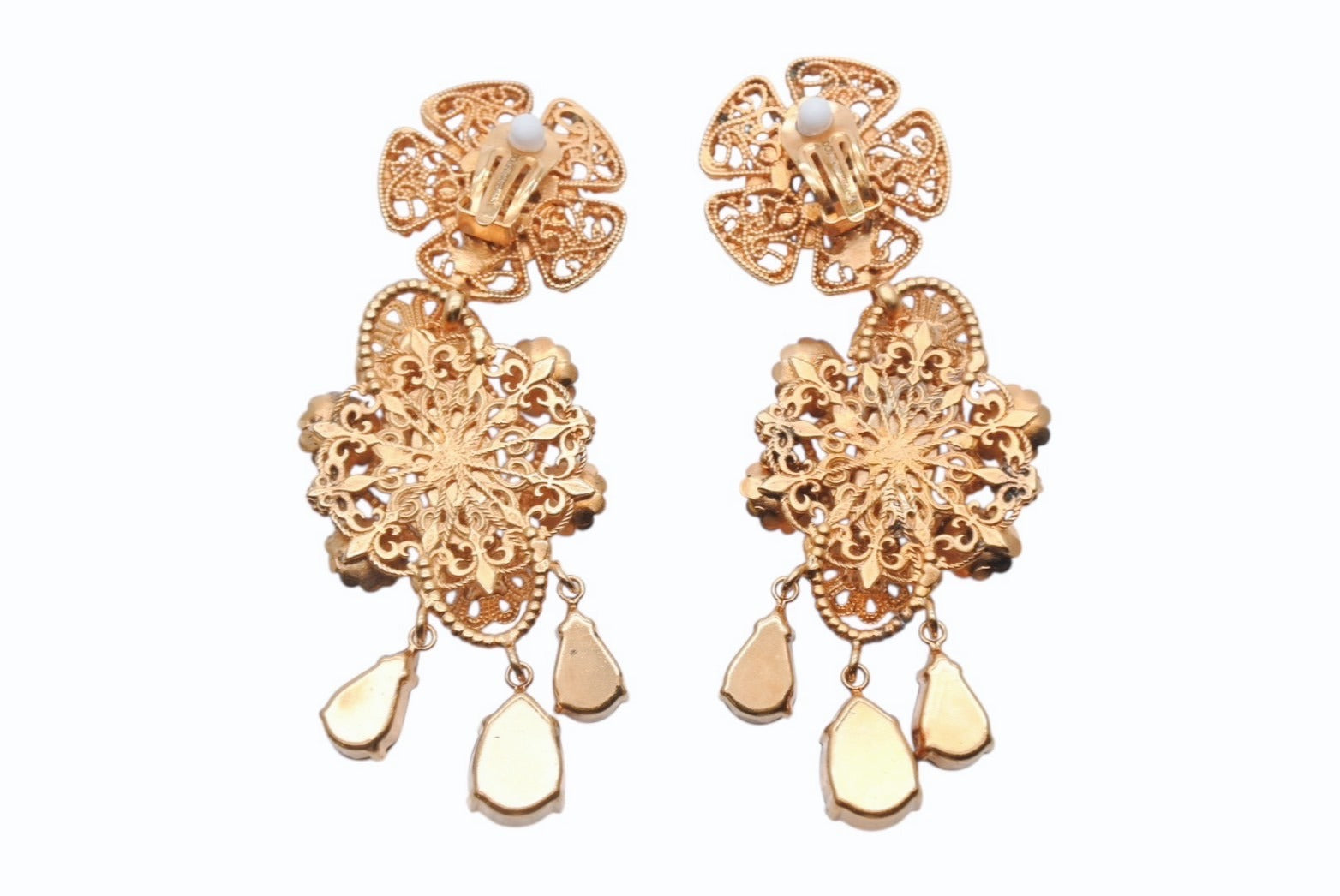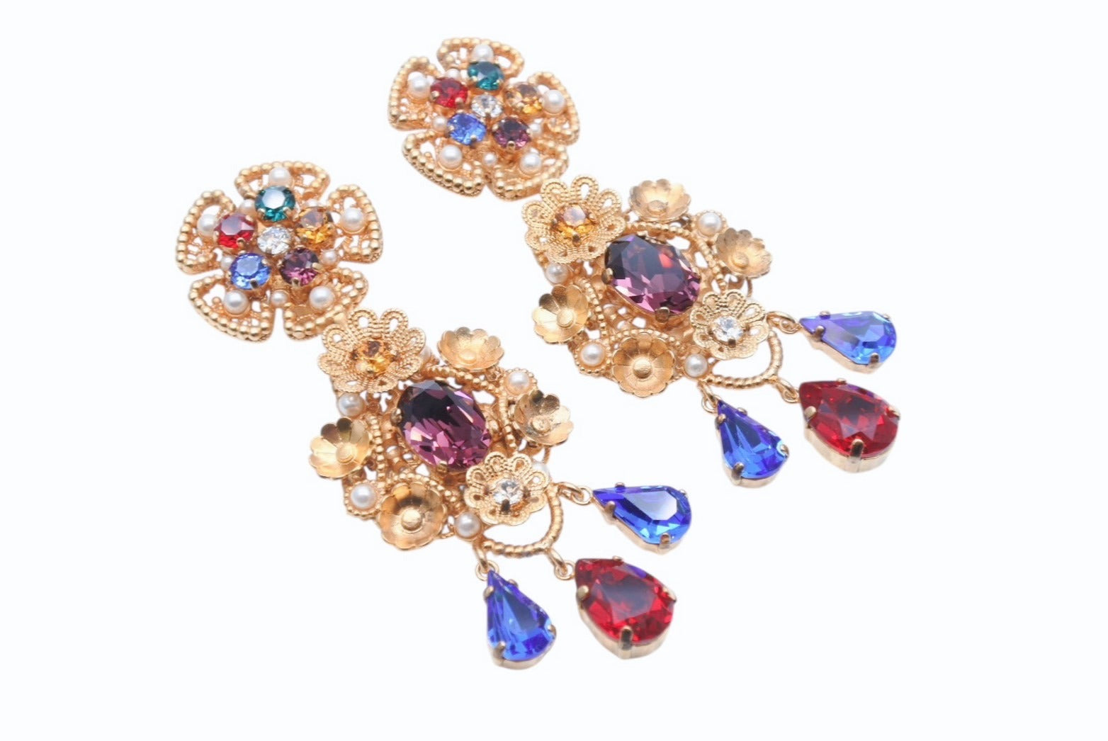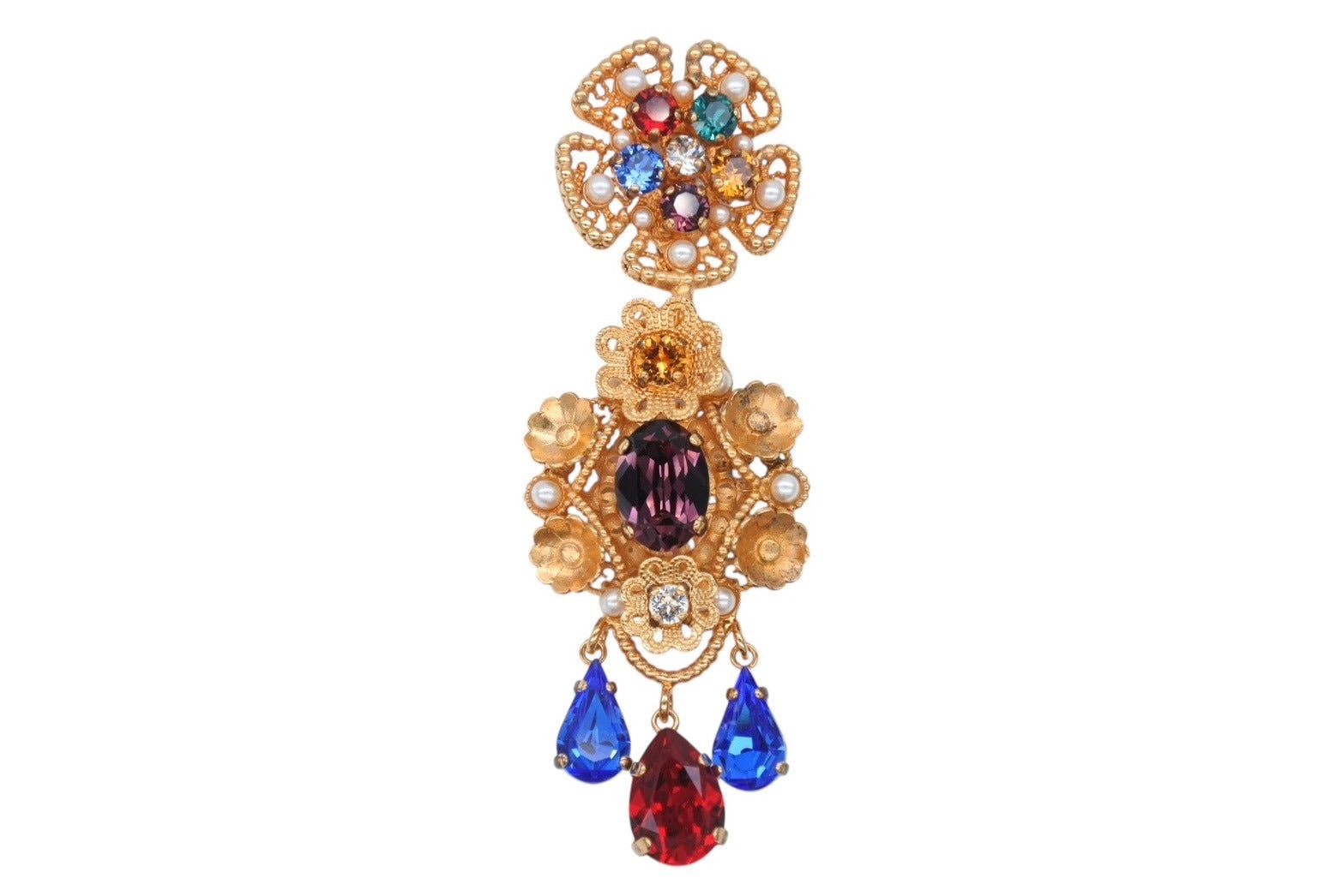 マルチカラーのラインストーンや美しい彫刻デザインが目を惹くイヤリングです。