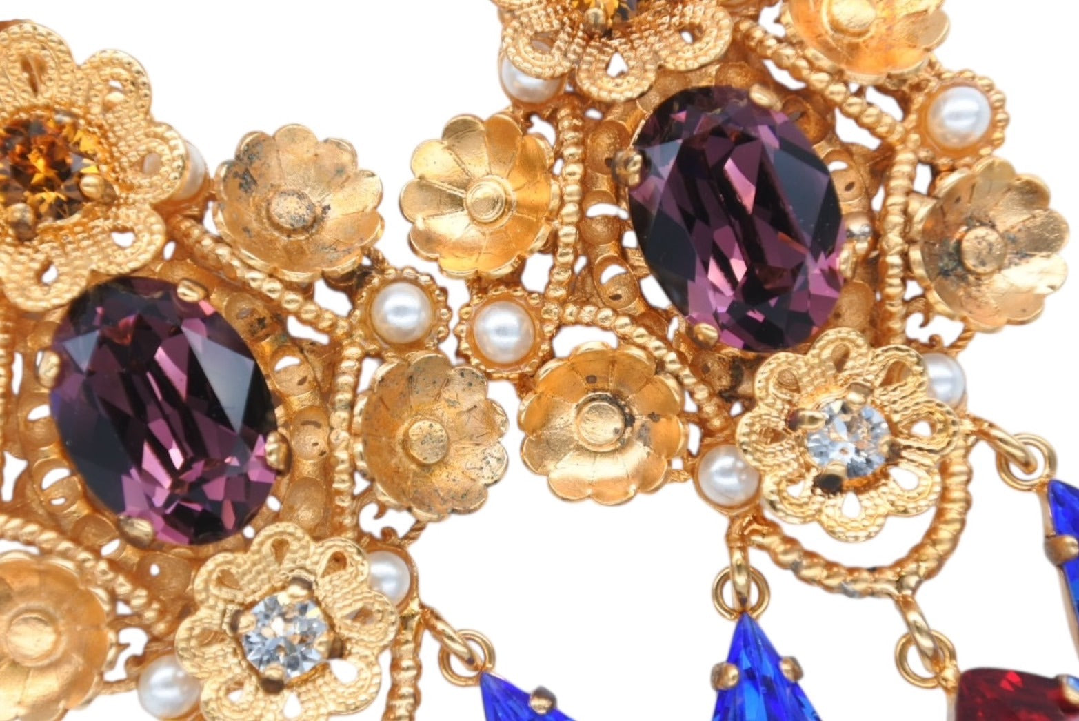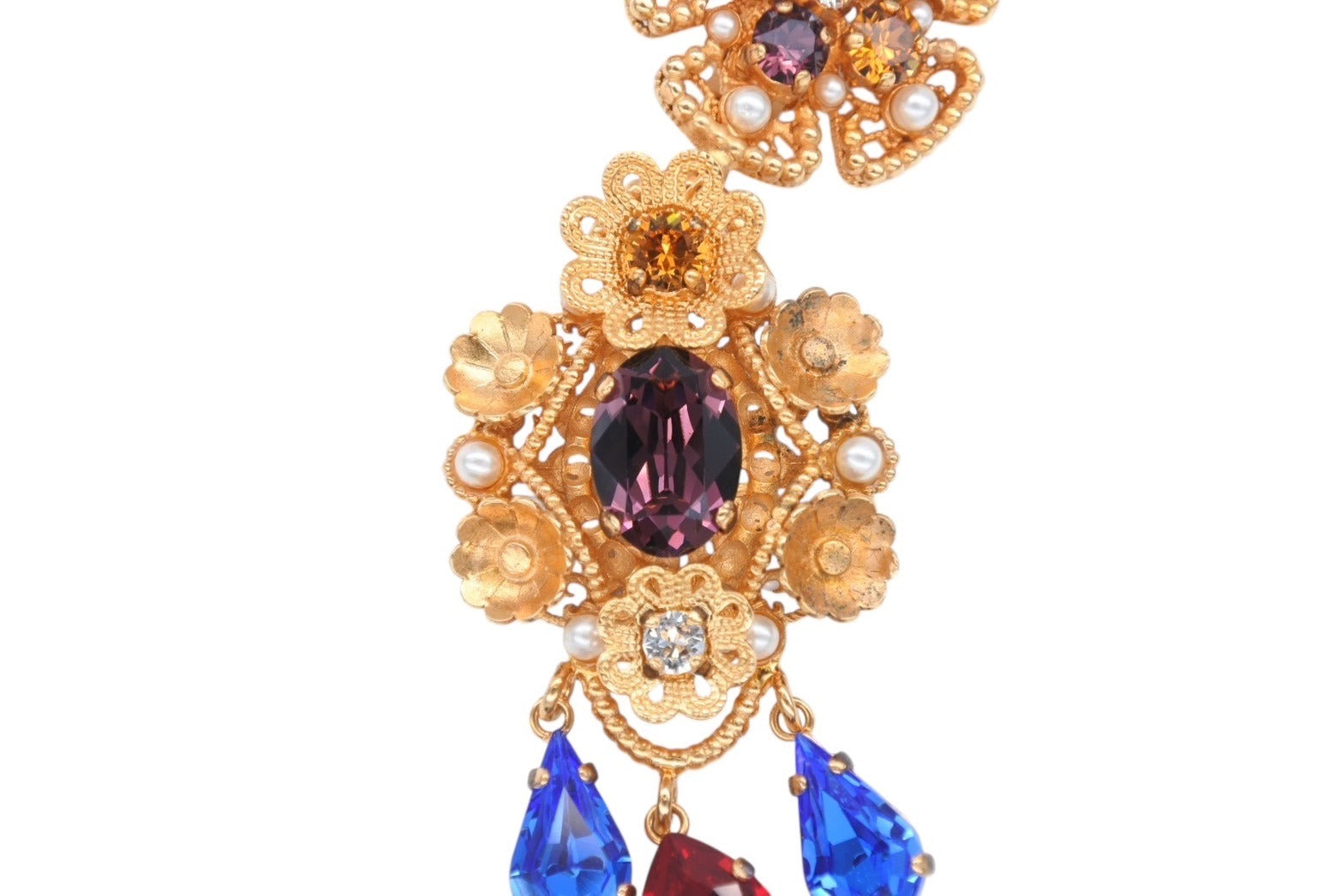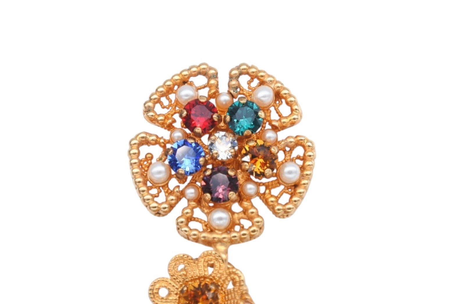 マルチカラーのラインストーンや美しい彫刻デザインが目を惹くイヤリングです。