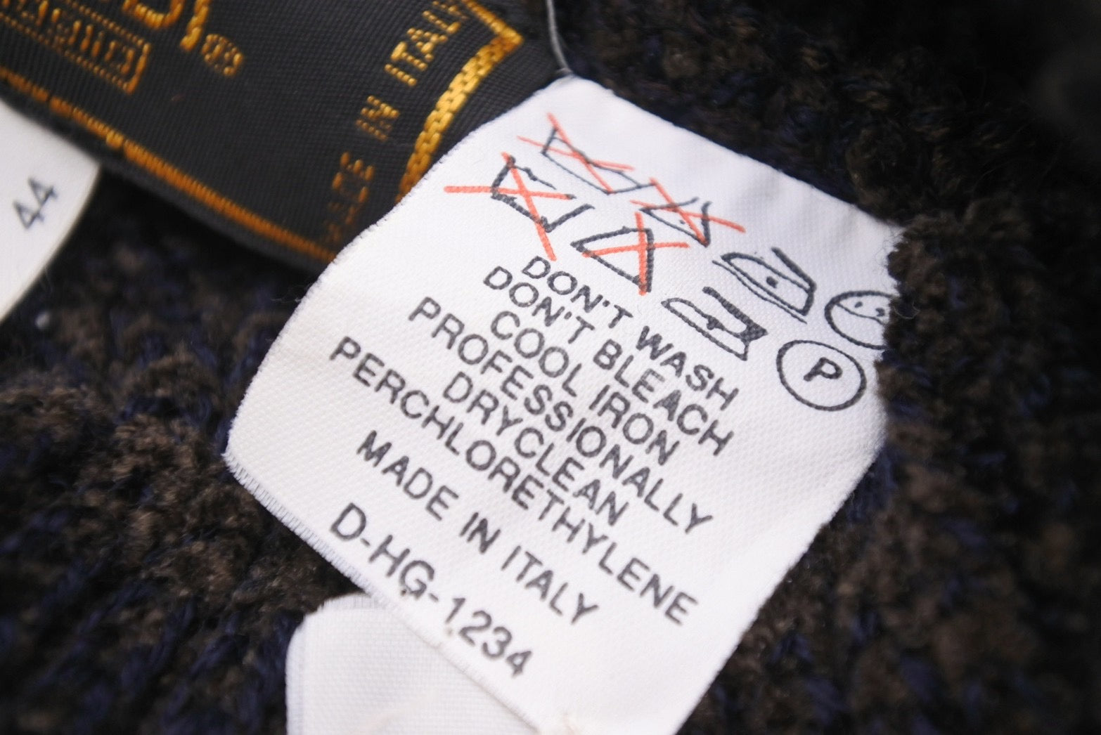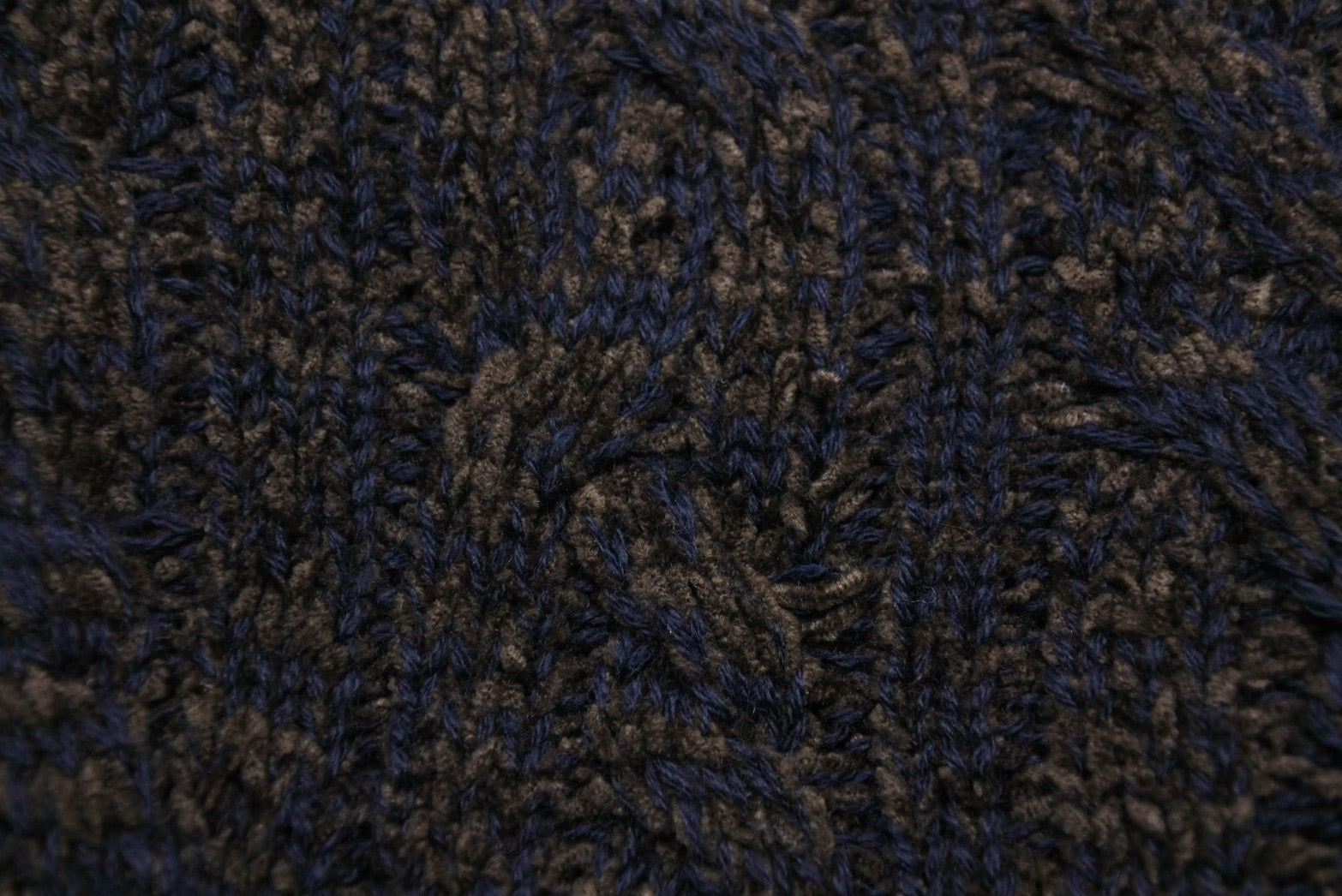 腕、首回り、背中、脇部分に糸ほつれと毛羽立ちと毛玉あり。