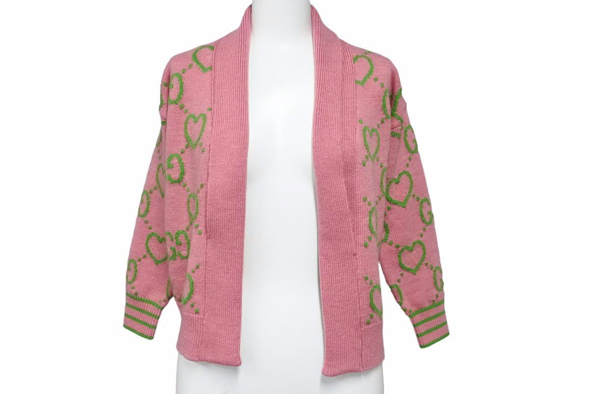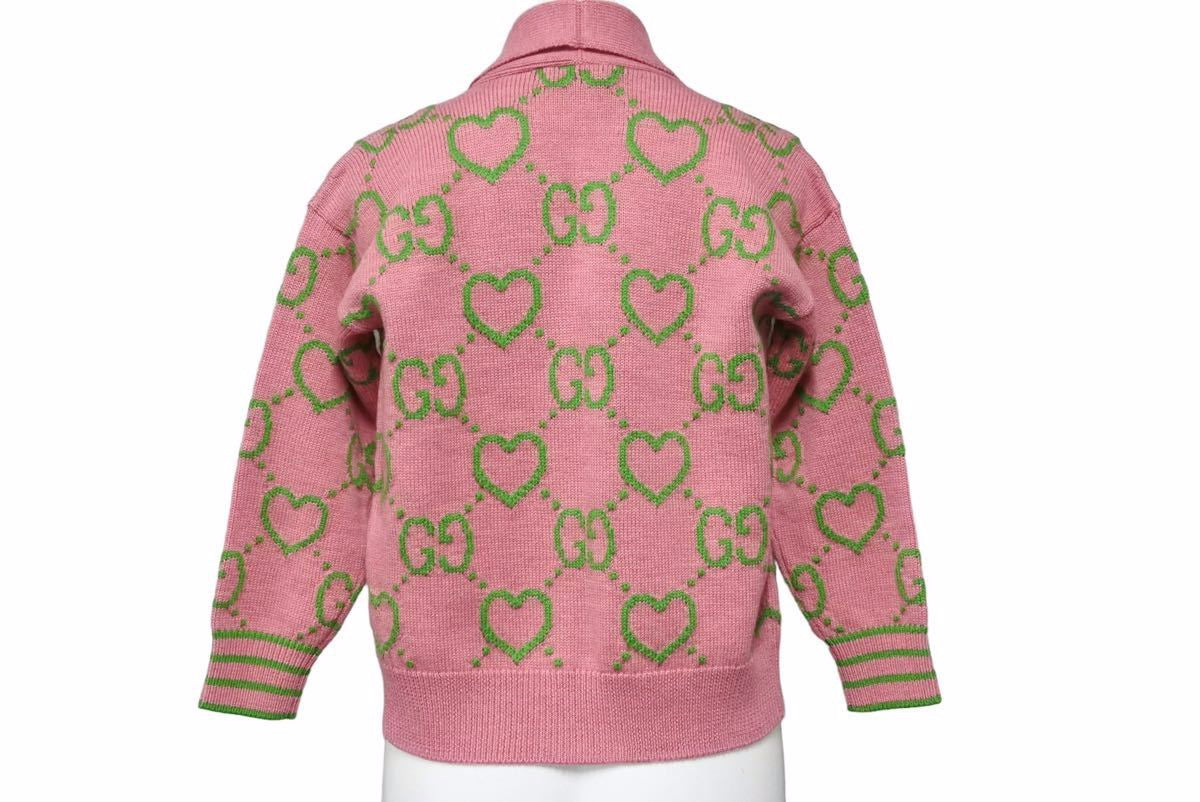 ピンクとグリーンが印象的なラグジュアリーブランドGUCCIの女の子向けカジュアルカーディガン。ブランドの美学を象徴するこの鮮やかでスタイリッシュなカーディガンは、有名なジャカード GG ロゴに遊び心のあるハートをあしらい、着心地の良いショール スタイルの襟でヴィンテージ感を演出しています。