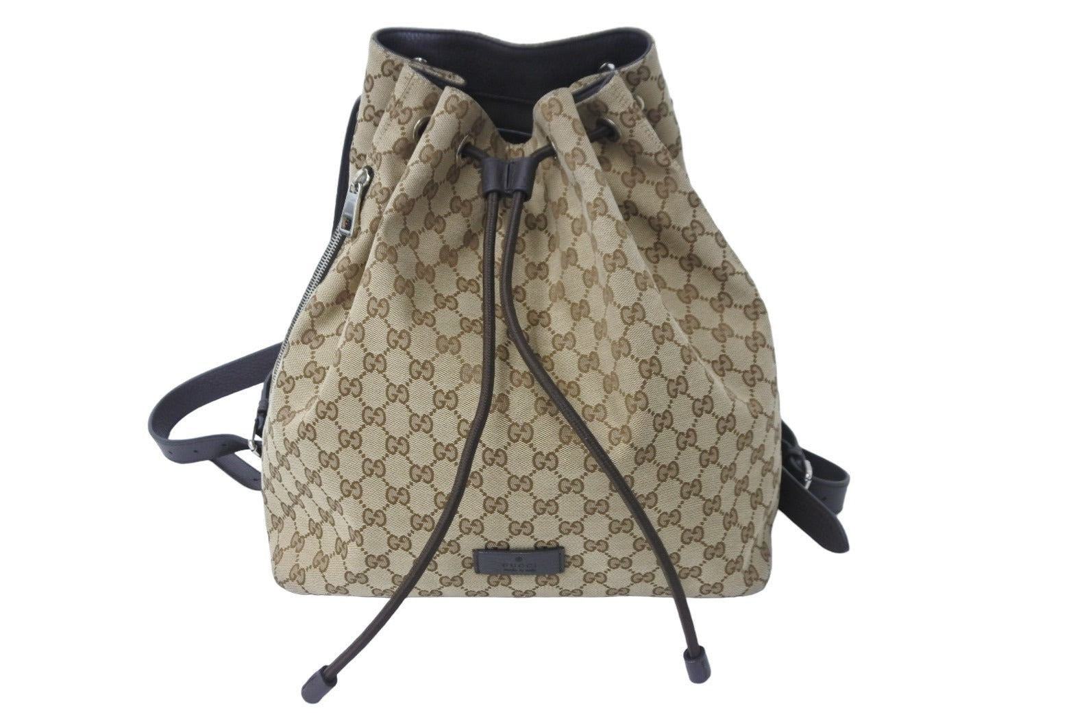 極美品 GUCCI グッチ 巾着型リュック GGスプリーム GG柄 449175 527066 ベージュ ブラウン シルバー金具 中古 53220