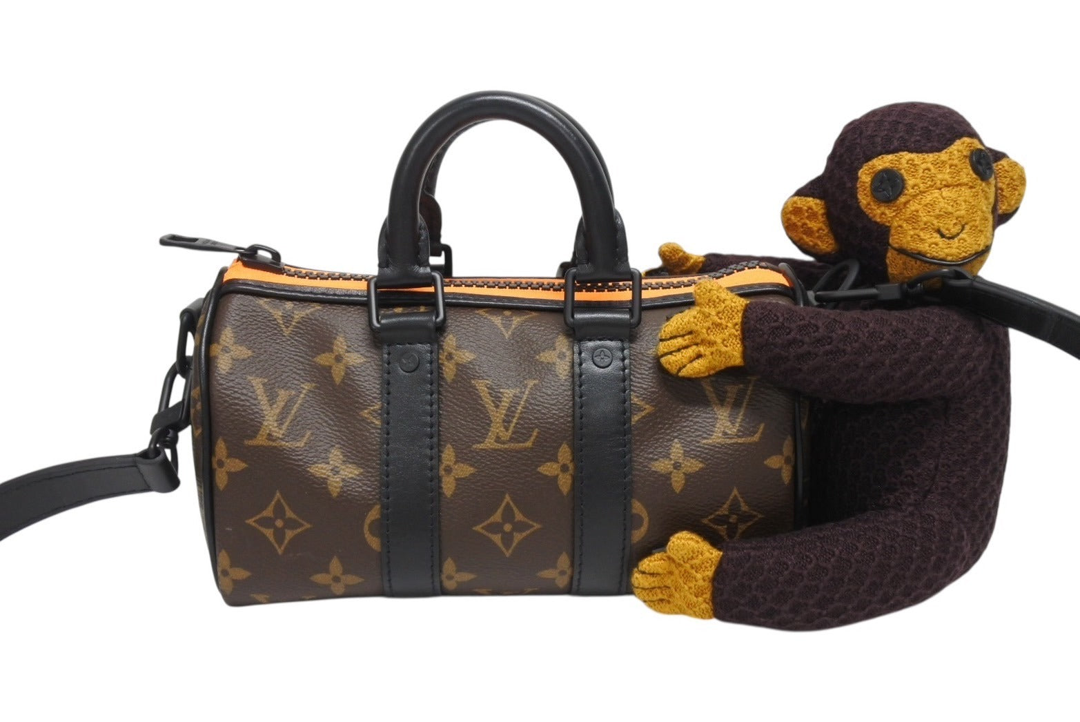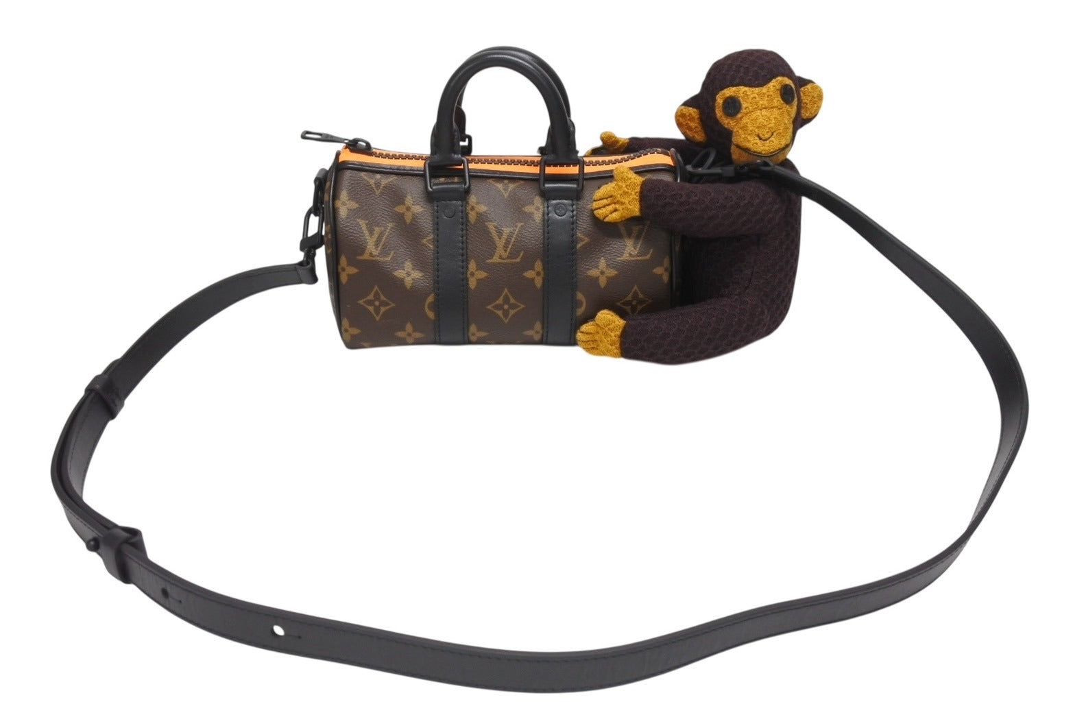 2021春夏コレクションのためにヴァージル・アブローがデザインした「キーポル XS」。アニメーションフィルム「The Adventures of Zoooom with friends(ズームと仲間たちの冒険)」に登場するキャラクター「LV フレンド」のニットパペットをあしらいました。モノグラム・キャンバスとマットなブラックのレザーを組み合わせた、コンパクトで機能的なバッグです。ファスナーを縁取る鮮やかなオレンジが、装いにアクセントをプラスします。