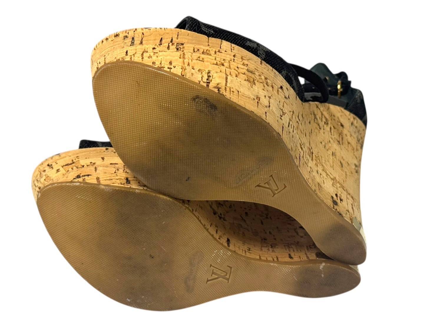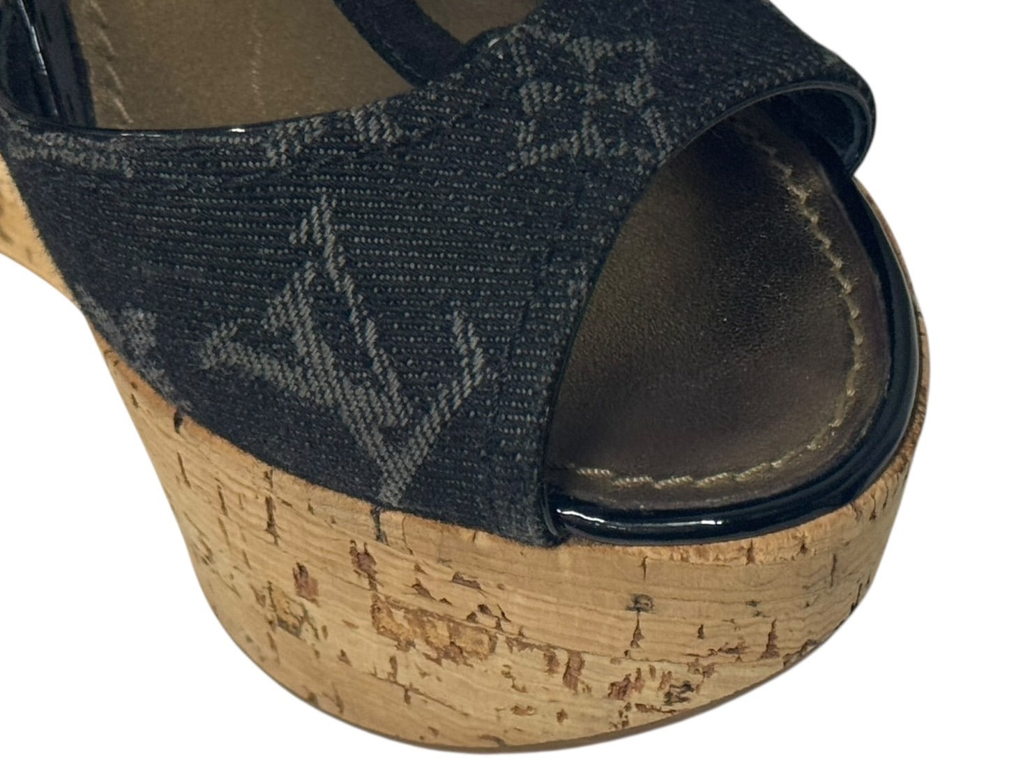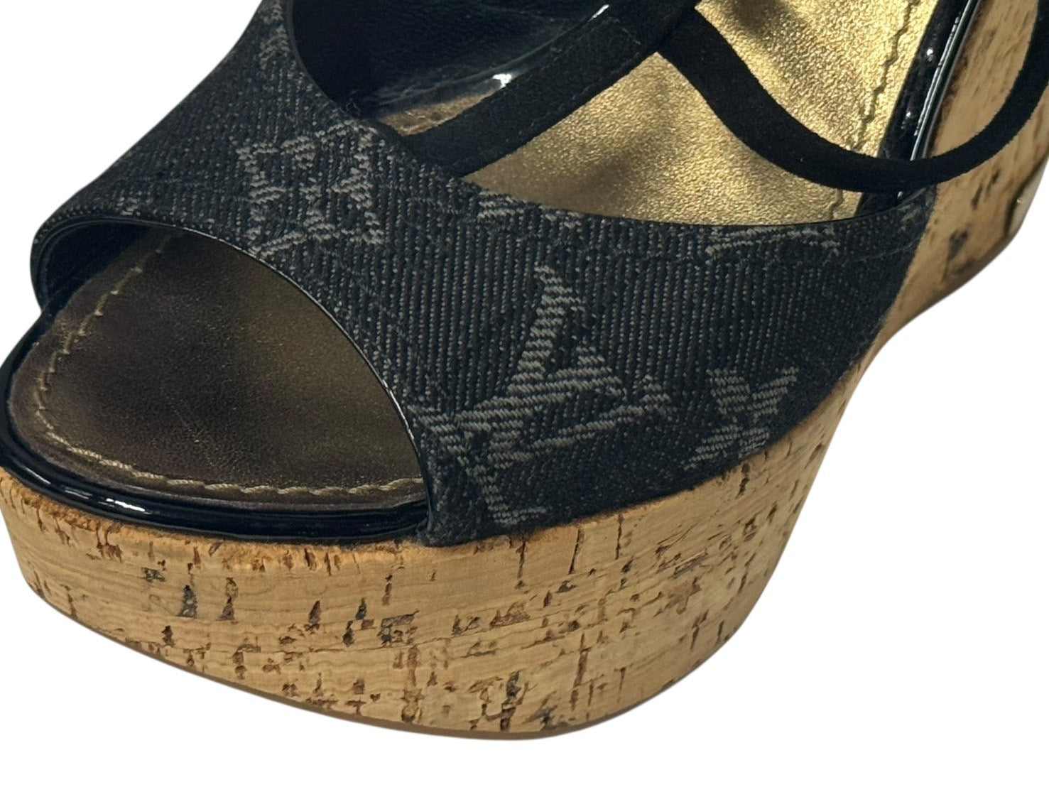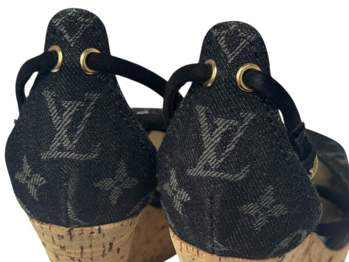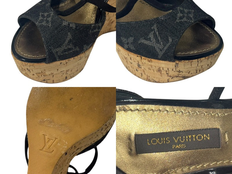 LOUIS VUITTON モノグラムデニム サンダル ウェッジソール DE0131 ブラック ゴールド サイズ35 美品 中古 4b006410