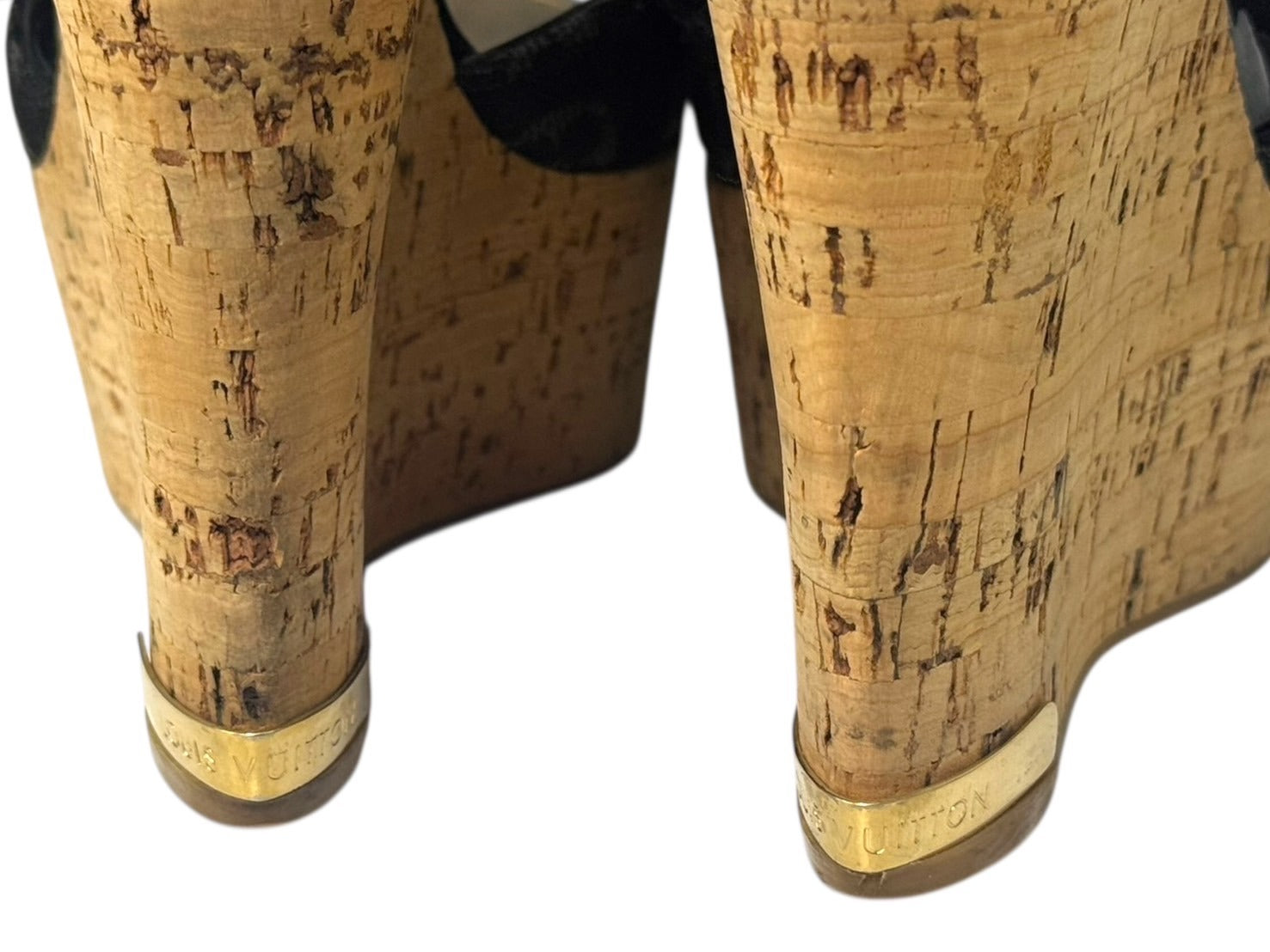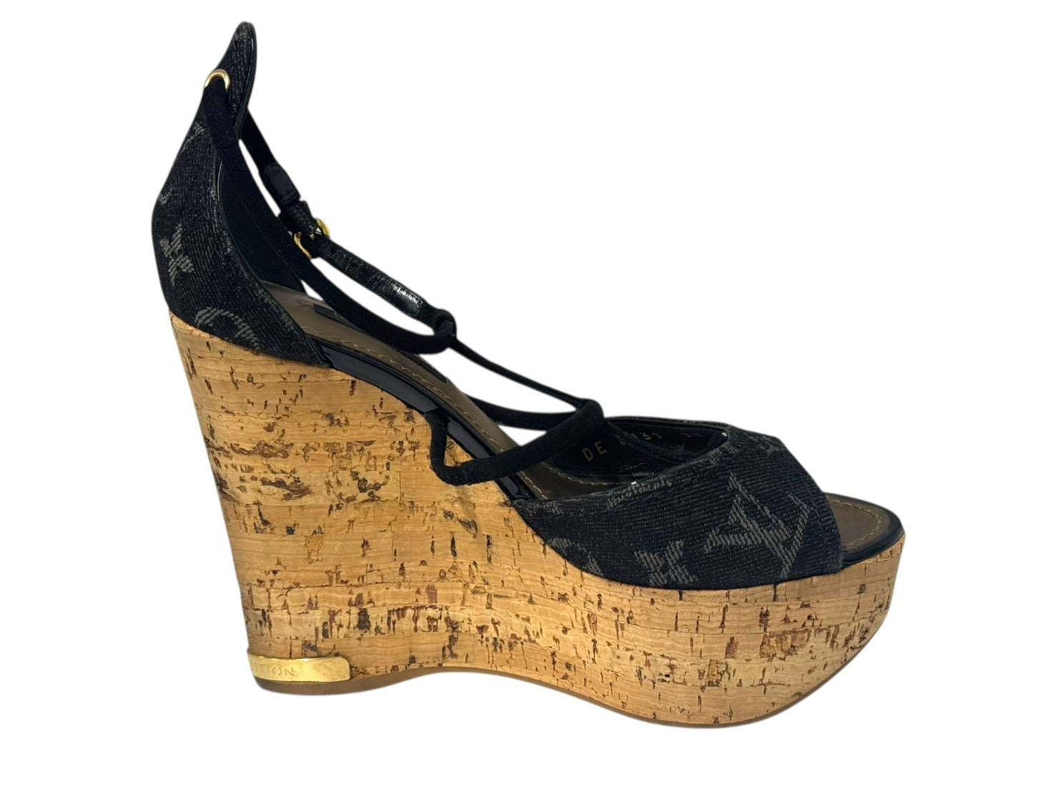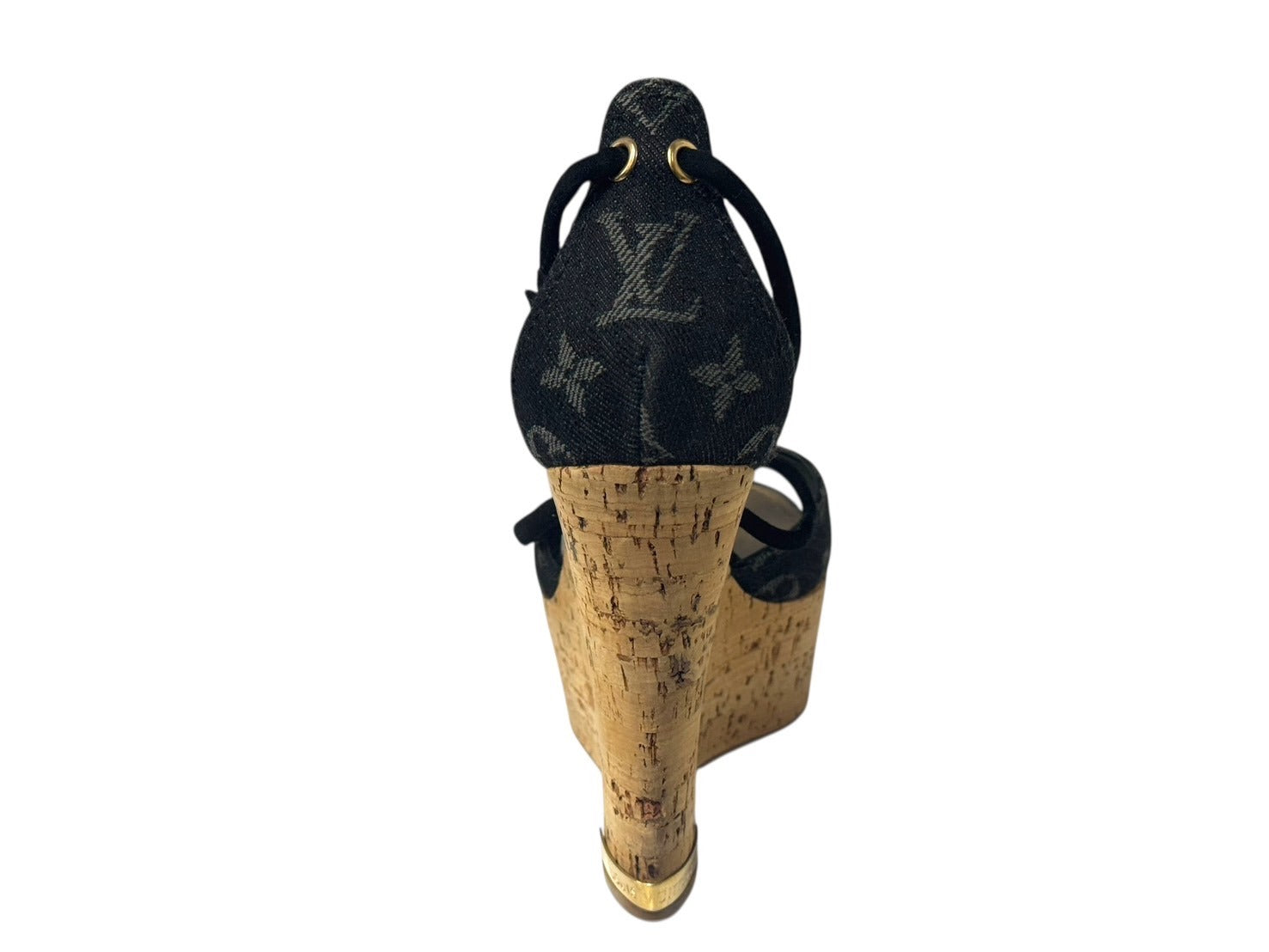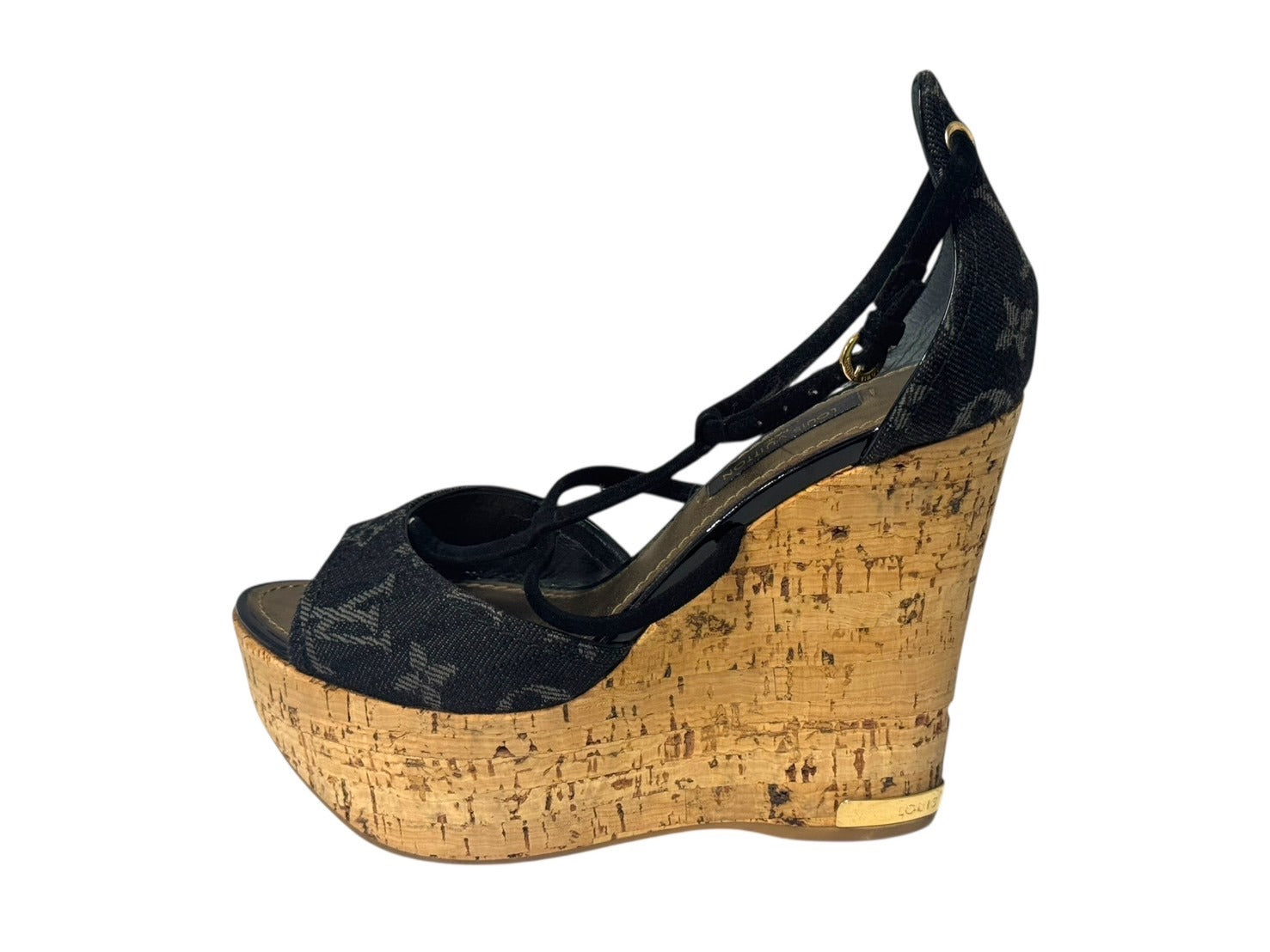 LOUIS VUITTON モノグラムデニム サンダル ウェッジソール DE0131 ブラック ゴールド サイズ35 美品 中古 4b006410