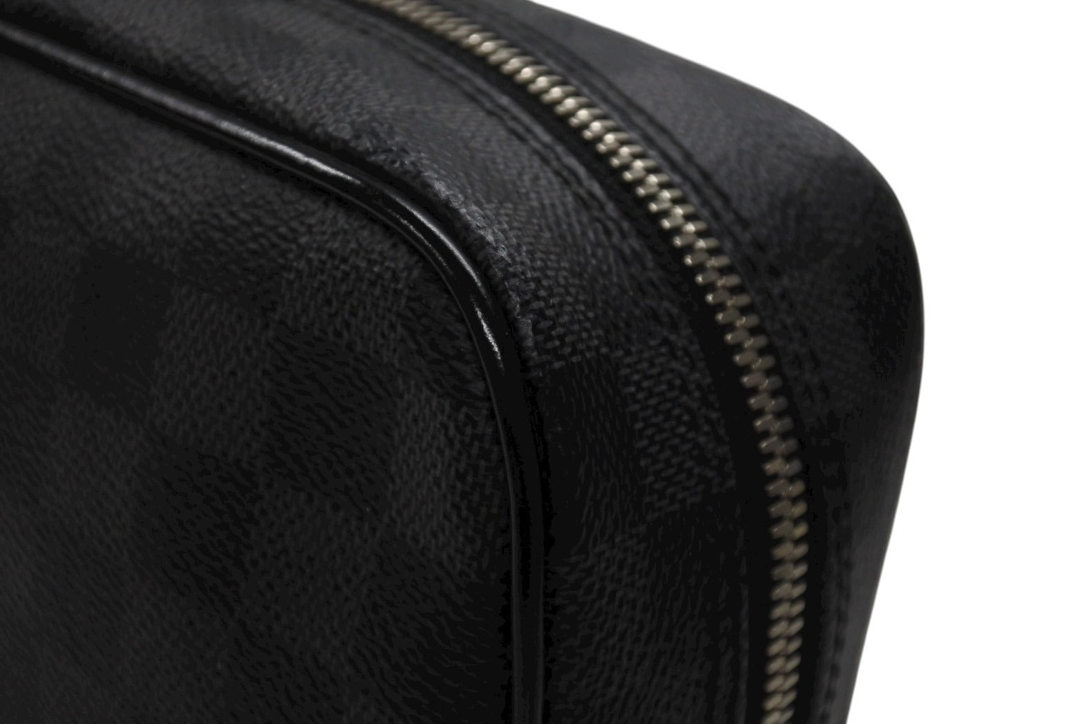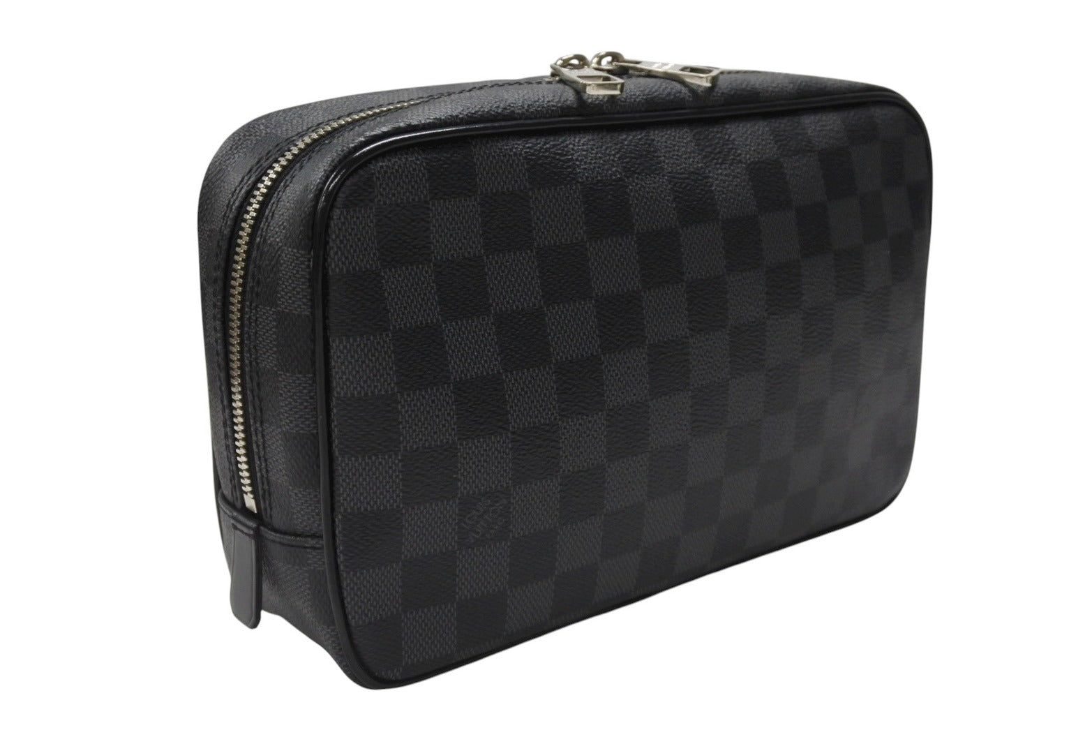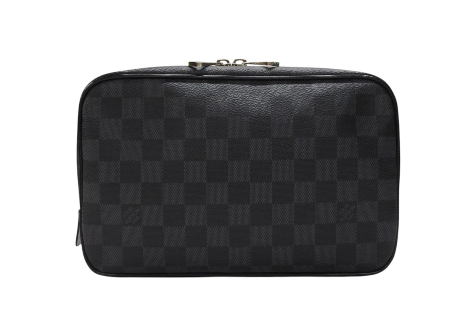 現代のトラベラーにおすすめの、小旅行などにもぴったりの機能的なポーチ「トゥルース・トワレ GM」。耐久性のあるダミエ・グラフィット キャンバスで仕上げました。